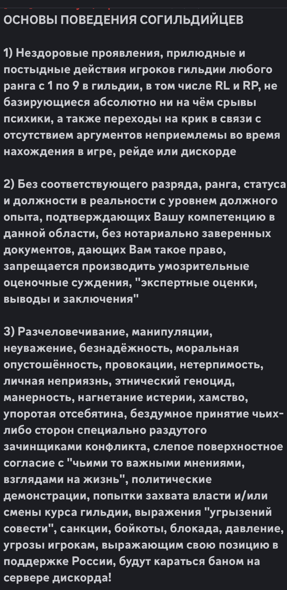 >кикнули из ги челиков, которые не отозвались на крик ГМа "все 30+ в рейд на ворлдбосса" это мне напоминает как я играл а одну старую ММОшку и там в гилде было правило во время гилд ивентов "в рейд или в офф" то есть во время гилд активности было запрещено своими делами в игре заниматься