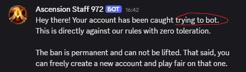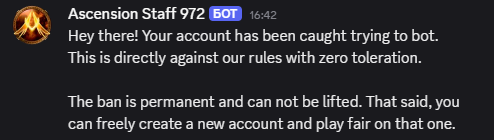 >>412346 читай >>412412 меня так же банили низахуй но только формулировка у меня была не botting а third party programs use кста там так же запрещен мультиакк, если заходишь ими одновременно, я на черепахе играл в два окна только в шум, а тут низя