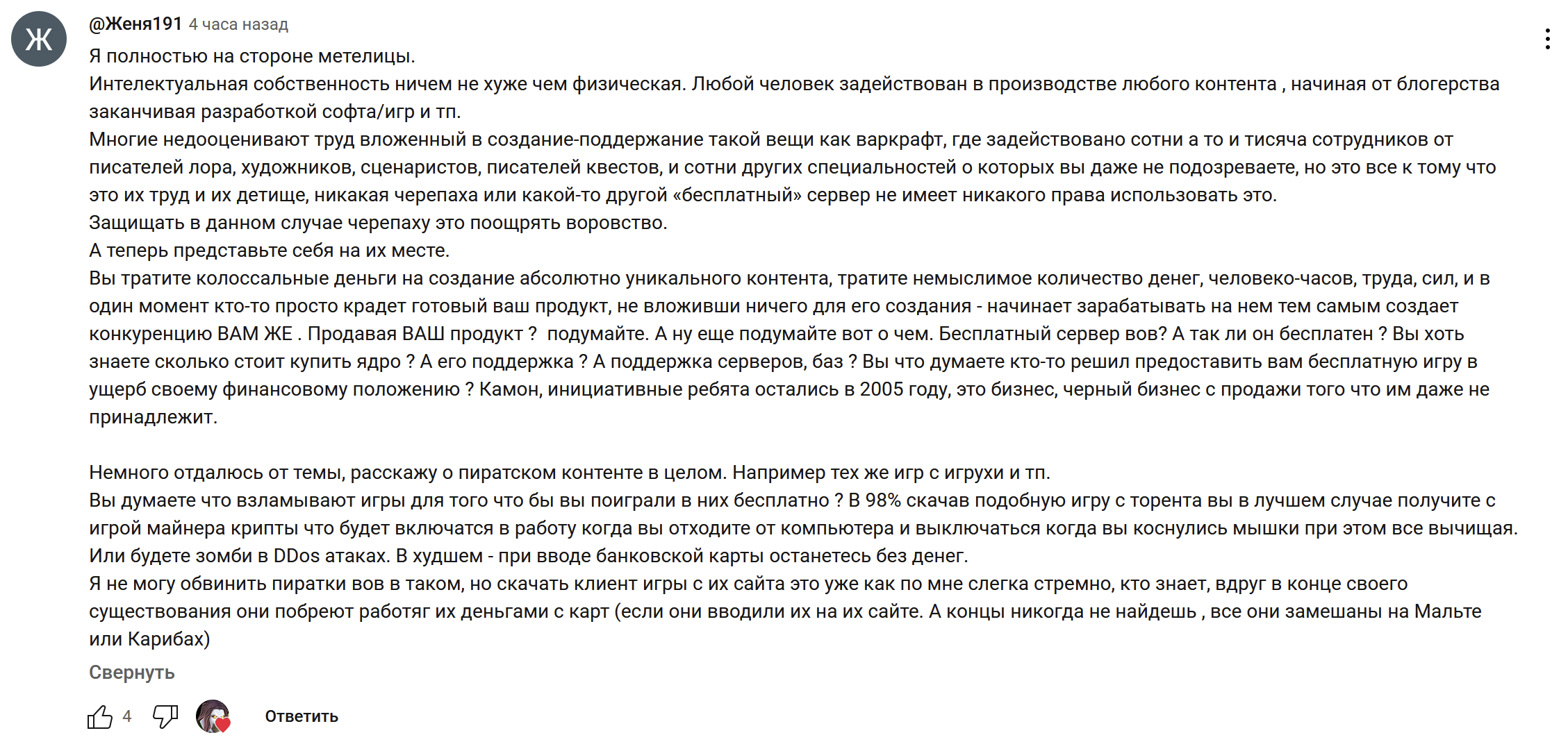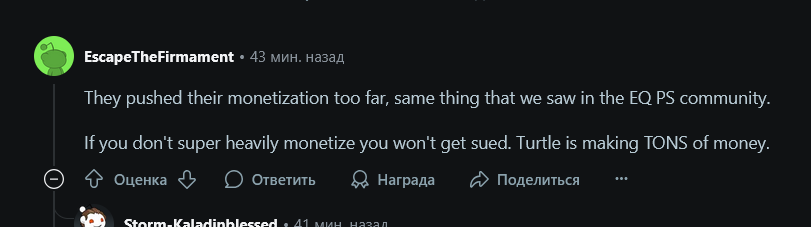 Если верхушка близзов уже приняла решение давить туртл вов, то они пойдут до конца - будут ебашить каждое упоминание черепахи. Они уже угрожали страйками за рекламу проекта и сносили видео с канала туртл вова, будут ебать платежные системы, что останется только донат криптой, немногочисленных разрабов которые работаю на шенну проживая в еу и штатах будут кошмарить так, что им легче сейчас сьебать в Россию и жить в подвале у Шенны. Черепахе пизда, лучшее что они могут сделать сейчас это договориться на хороших условиях как это сделали французы с носталриуса