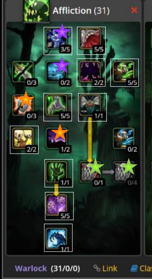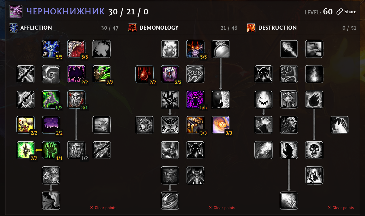 >>414094 Гугли "drain tank warlock leveling" Сначала бери стамина спирит, ману тапами набираешь. Потом на 30-35+ в спелл демедж. Примерно на этих уровнях этот спек набирает свою полную силу