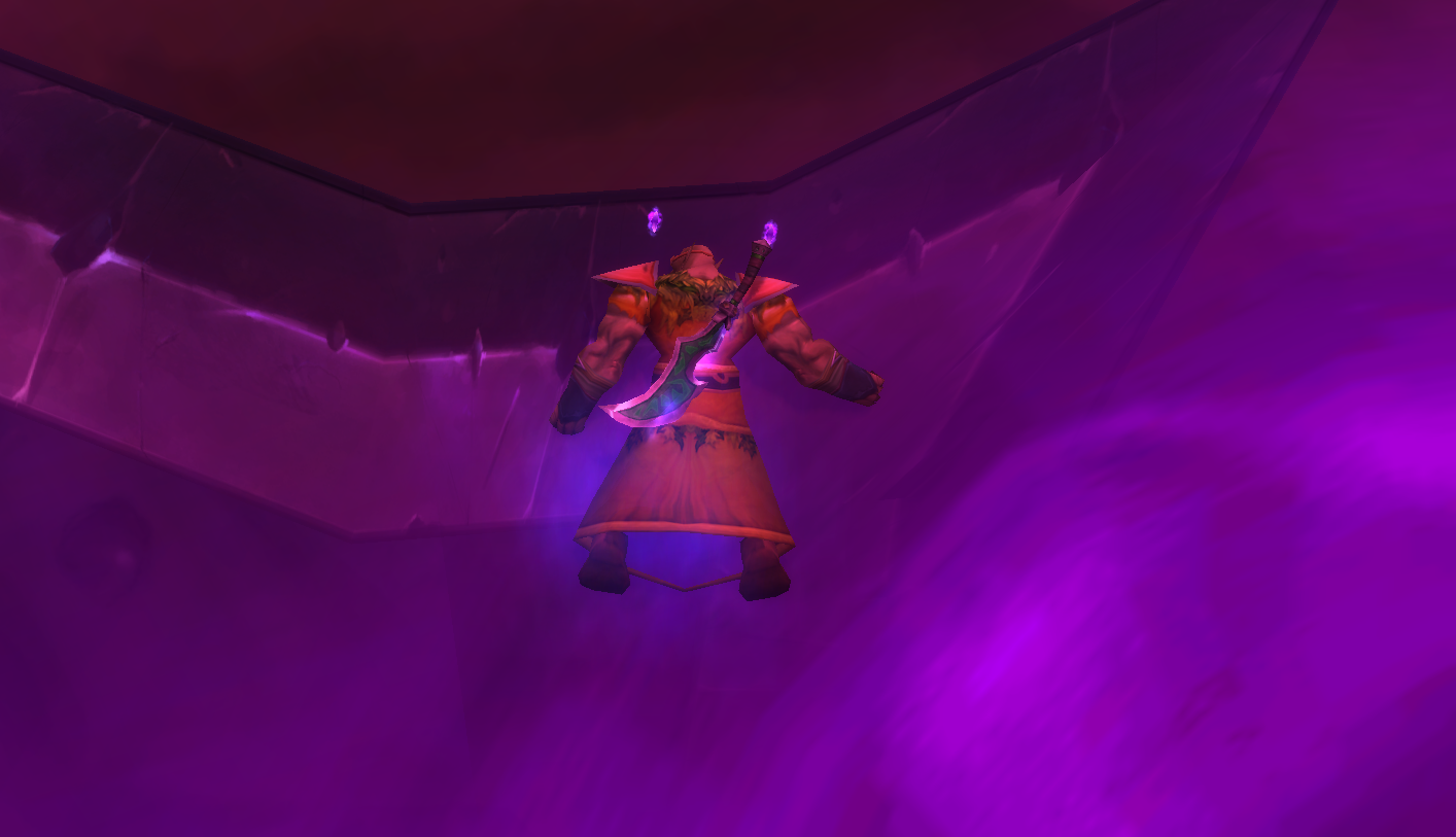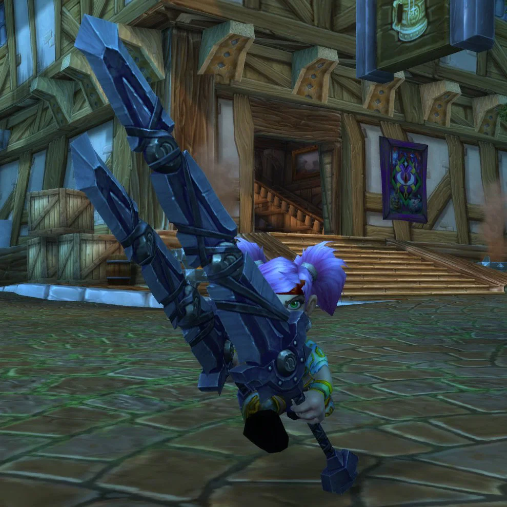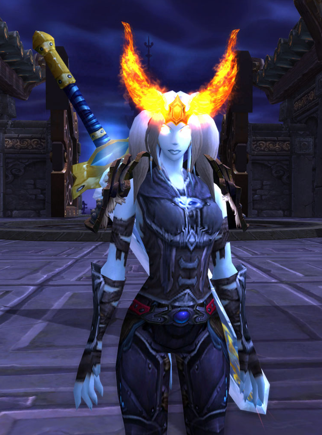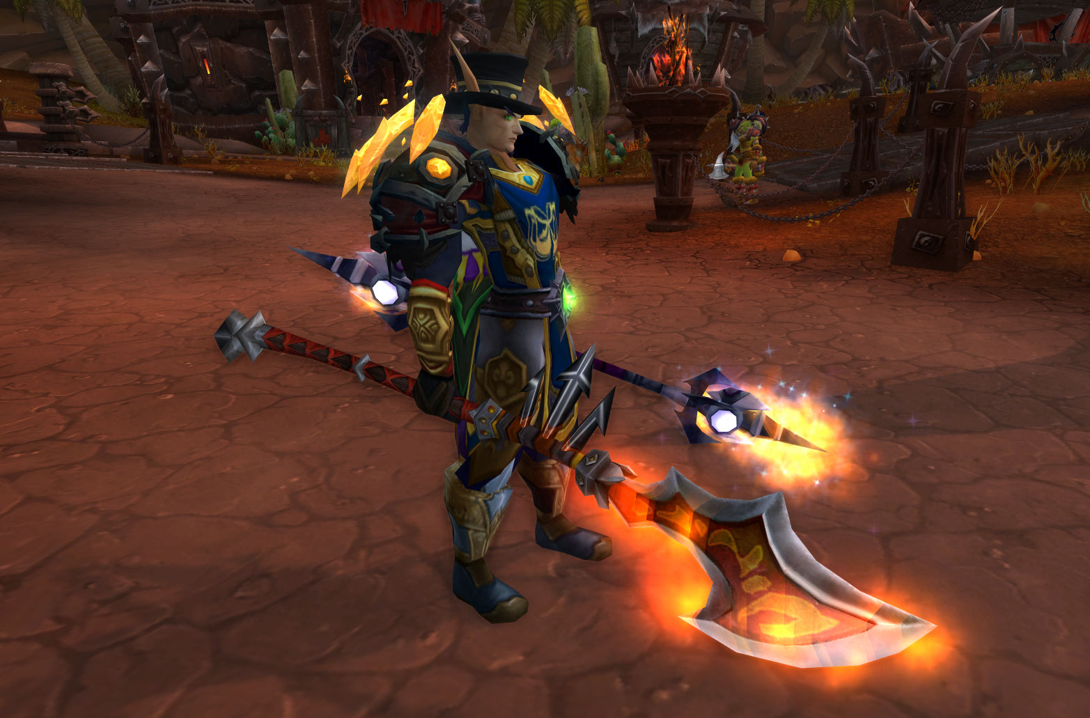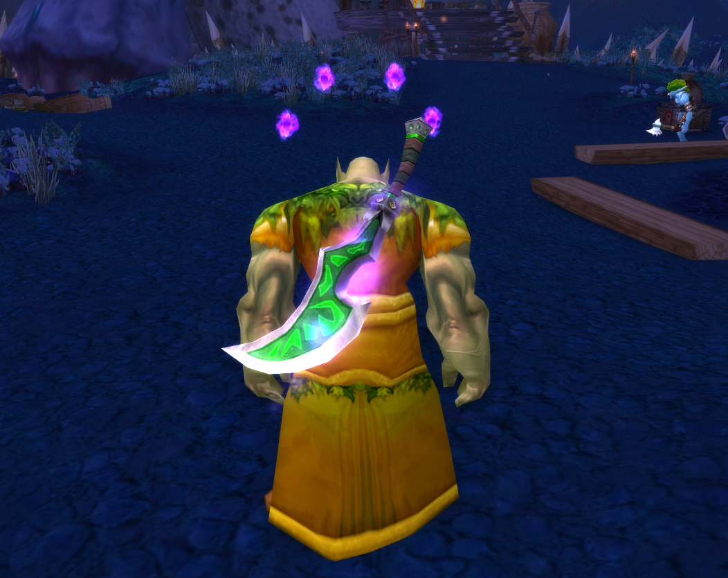 Подходящего трансмога нет, потому снял почти все шмотки, чтобы выглядело более-менее. Идея в том, что кинжал не выглядит как что-то "современное", близкое к Пандарии, потому остальной шмот тоже "убавляем" ближе к классике. А так прикольно что он светится как камни душ над головой. Прикольная штука, но надо ОБЫГРАТЬ