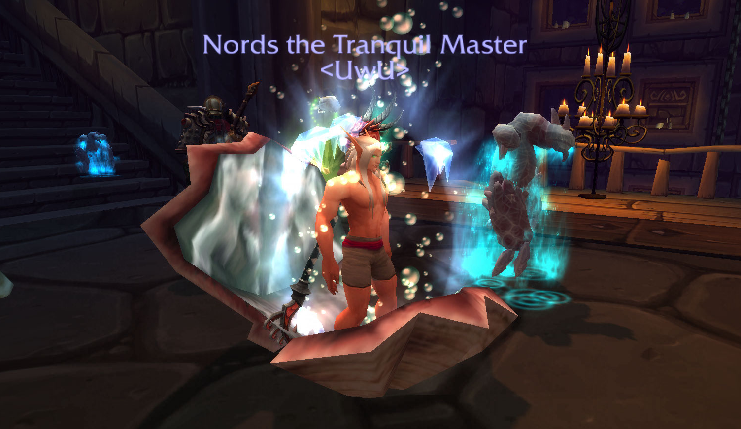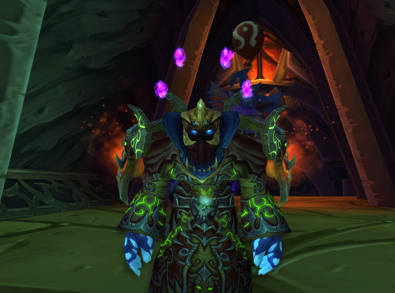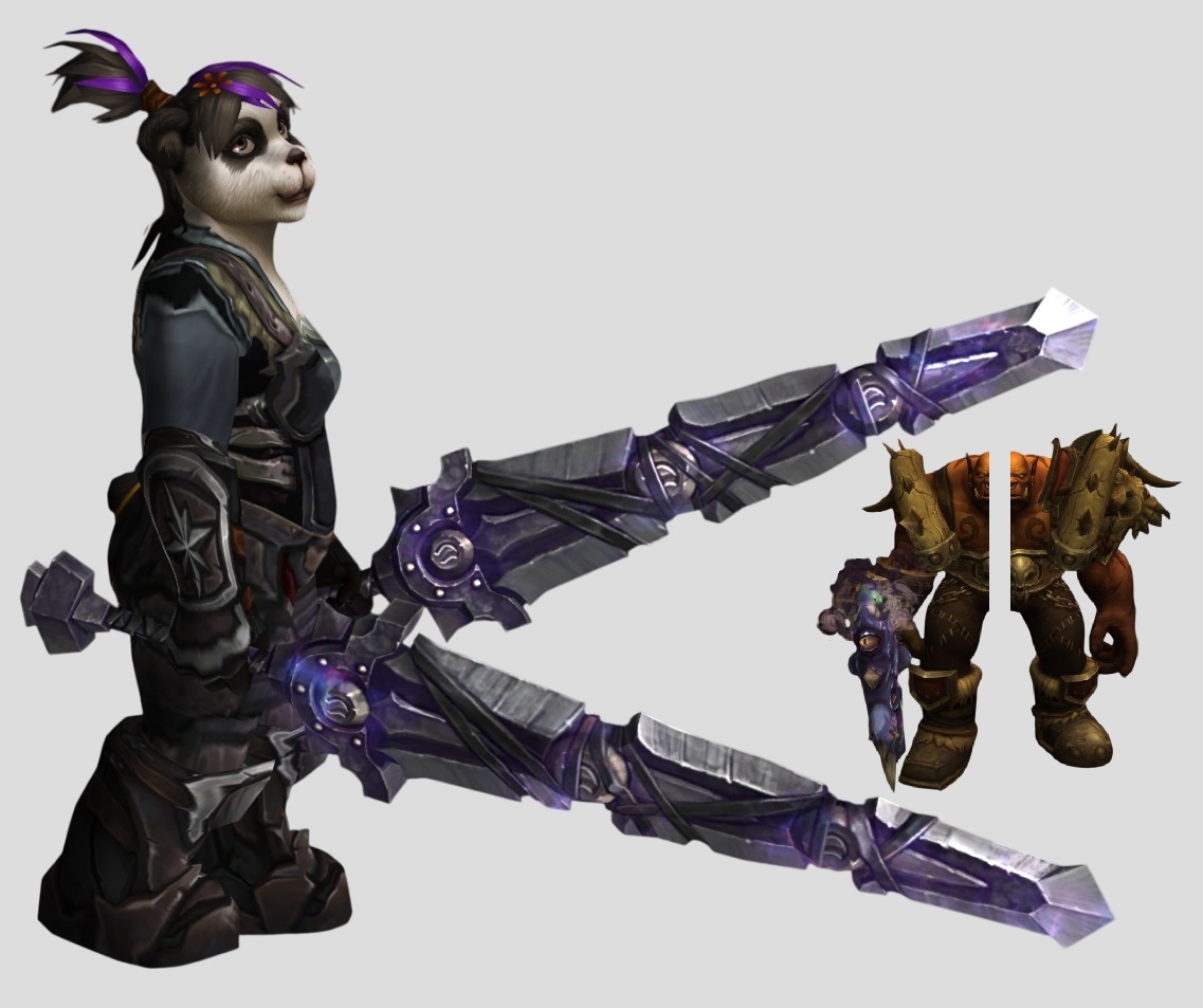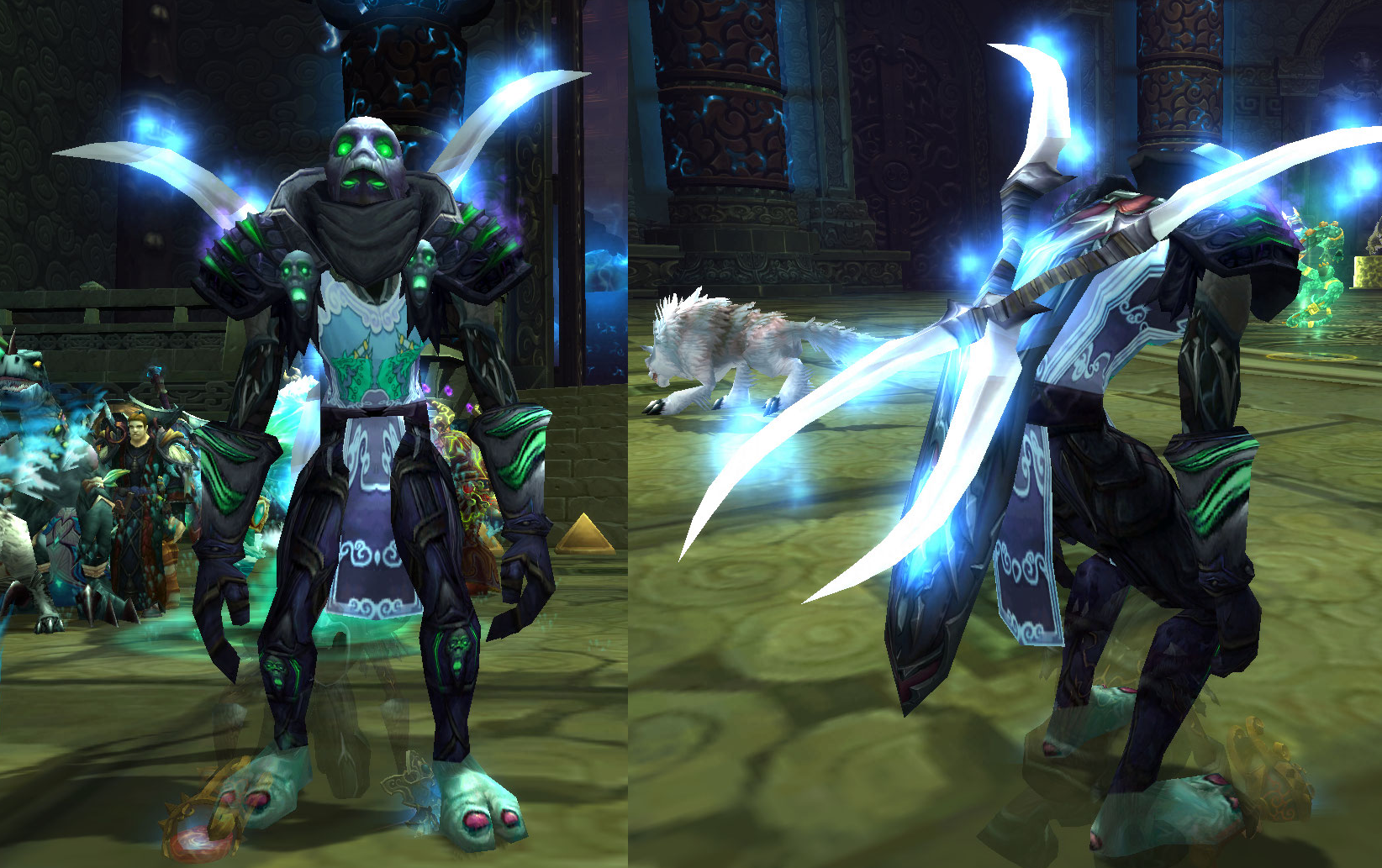 Подходящего трансмога нет, потому снял почти все шмотки, чтобы выглядело более-менее. Идея в том, что кинжал не выглядит как что-то "современное", близкое к Пандарии, потому остальной шмот тоже "убавляем" ближе к классике. А так прикольно что он светится как камни душ над головой. Прикольная штука, но надо ОБЫГРАТЬ