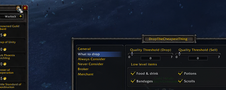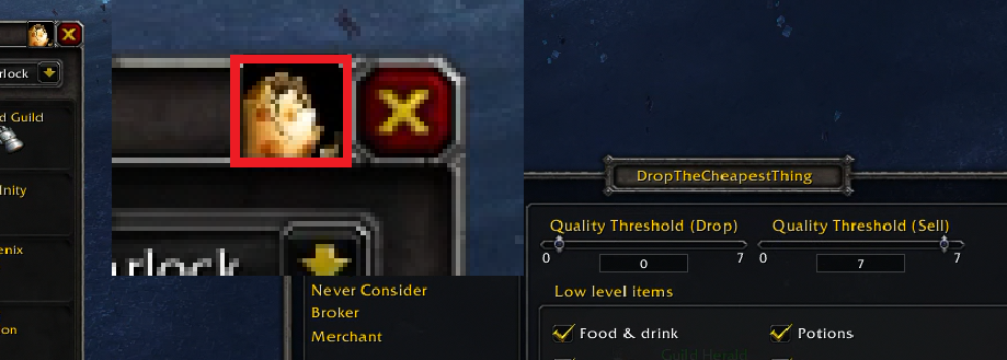 Срочная инструкция как продавать всё из сумок, не вылетая из игры и не смотря на чёрный экран. Аддон DropTheCheapestThing - ставим галочки там и сям, сначала Quality Threshold (Sell) 0, чтобы продать серое - повышаем до скольки-то (можно сразу 7 и всё) - ещё один клик и ваши сумки пусты. Можно сделать это двумя макросами - на продажу серого и затем всего остального Всех люблю! Всем топовый вайб от Фугази лучший музыкальный клип в истории топовая энергия крутое сообщество жизнь!