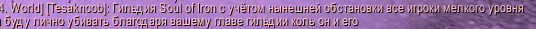 Если ты вдруг решишься поиграть там, анон, но ты у мамы особенный и сделаешь себе особенный ник (типа Головачлена), будь готов к тому, что твой ник, твою личность, твоё очко, твою мамашушлюху будут обсуждать нонстоп каждый день пока ты онлайна 90% гильды. Про очко не шутка, однажды там литературно какой то ебаклак угрожал другому расширить очко. А по ночам в ворлдчате начинается вообще такая шизофазия с обсуждением анального секса и кто кому батя и ебарь, что складывается впечатление, будто это сервер местной дурки, где играют какие-то алкаши.