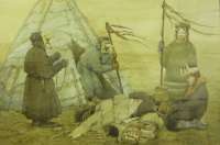 >>334997>>335018Навьючив Юлдис пожитками, отряд двинулся дальше. Мошег уверенно вел через болота, ловко перескакивая с кочки на кочку, варяги же, по мере сил следовали за ним, то и дело проваливаясь в воду по колено в холодную воду. Следующие две ночевки обошлись без происшествий, разве что 1d6: (3) = 3 членов отряда простудились, и теперь брели то и дела шумно высмаркивая носы.Утром 5-ого дня небо опять заволокло тучами, из которых начал сыпать мелкий как крупа снег. И хотя он таял едва коснувшись земли, но видимость упала до 200 метров.К середине дня отряд вышел к селу. Заболотское проступило из белой кутерьмы снежинок припорошенными конусами чумов. Несколько жителей, с настороженным любопытством провожали друзей глазами, пока отряд двигался к центру поселения. Не все Заболотское состояло из чумов, весь центр был застроен деревянными срубами. Дойдя до одного из них, Мошег остановился и, повернувшись к отряду объявил:- Моя привел, здеся Суолла есть! Вокруг начали собираться зеваки, все как один черноволосые, с раскосыми глазами на темных, обветренных лицах, чудинцы.