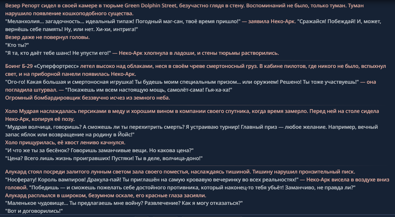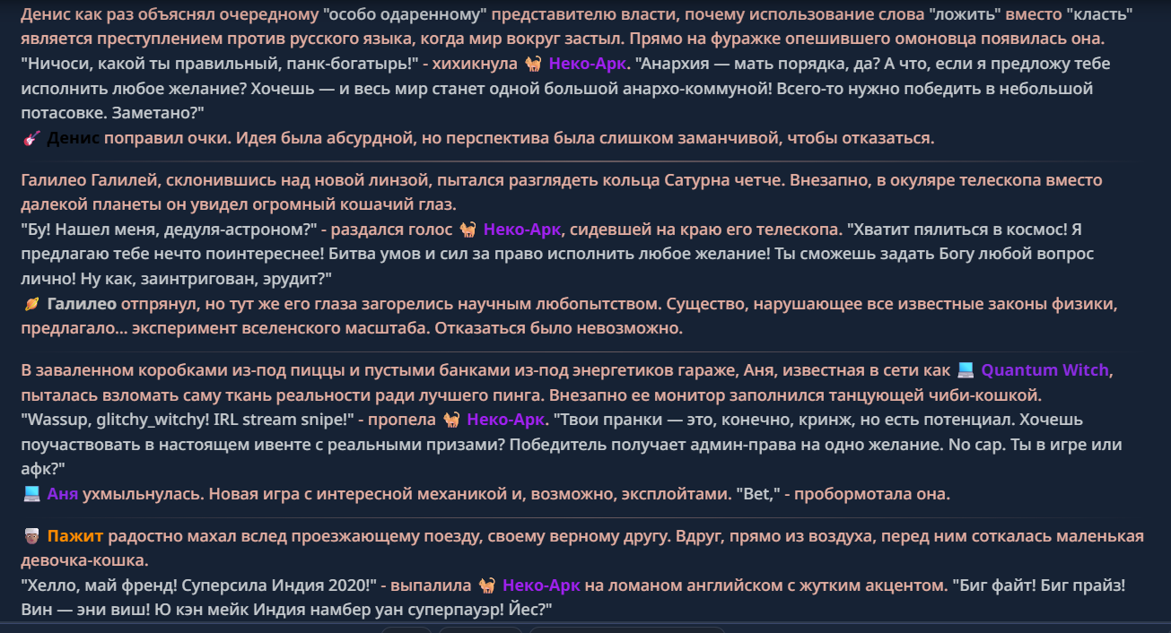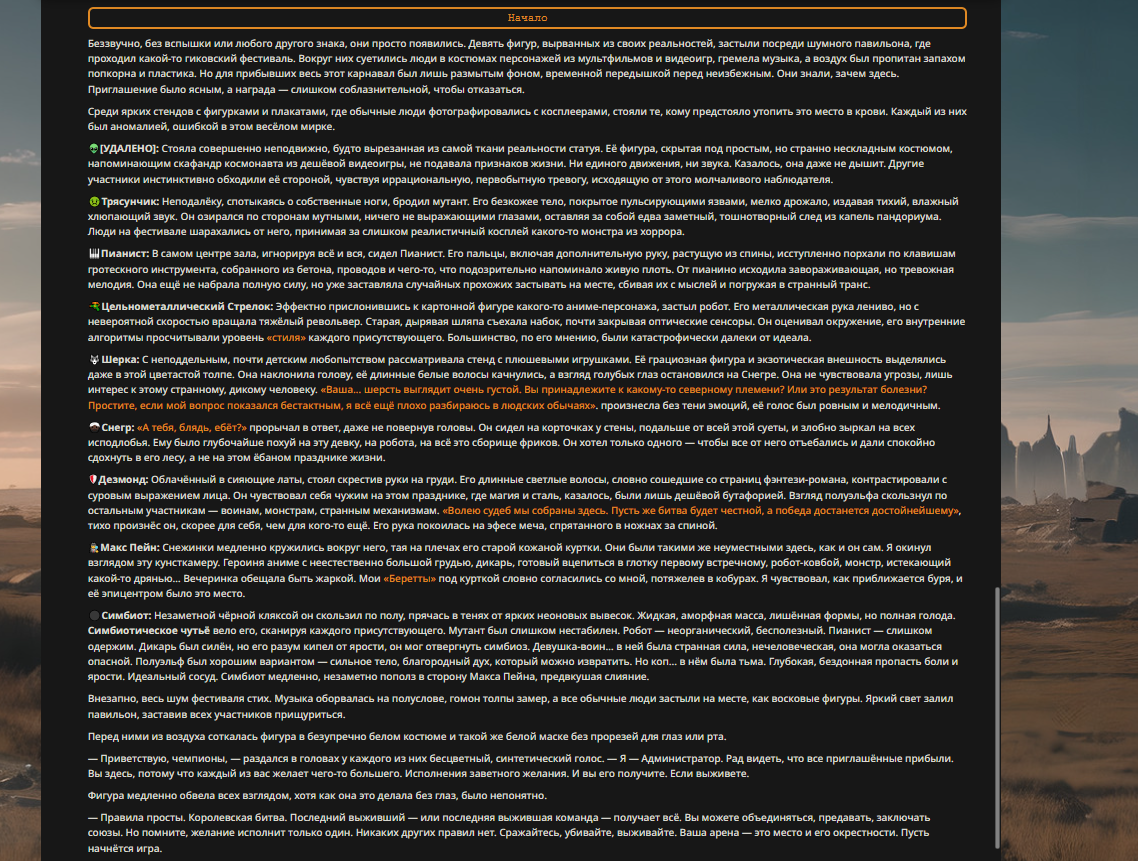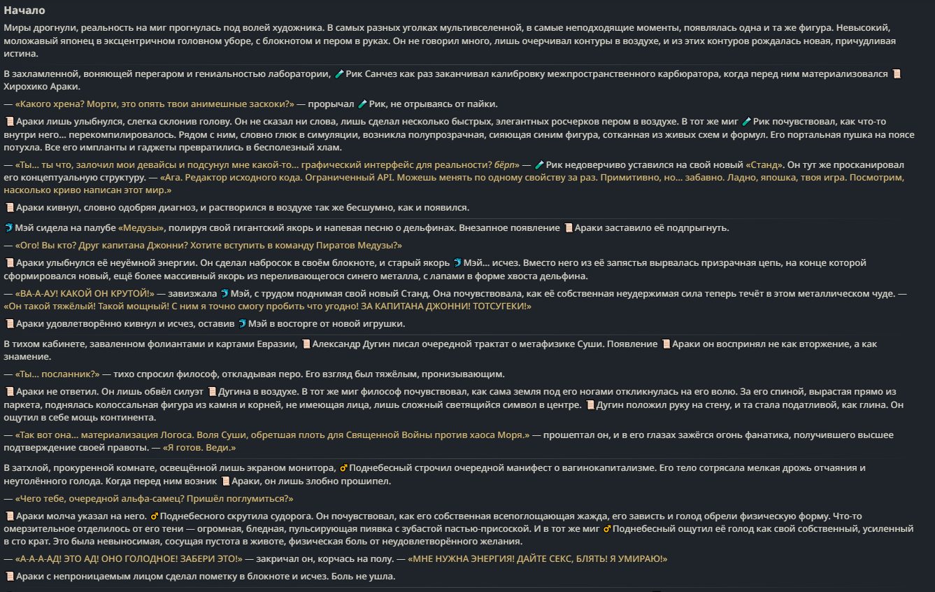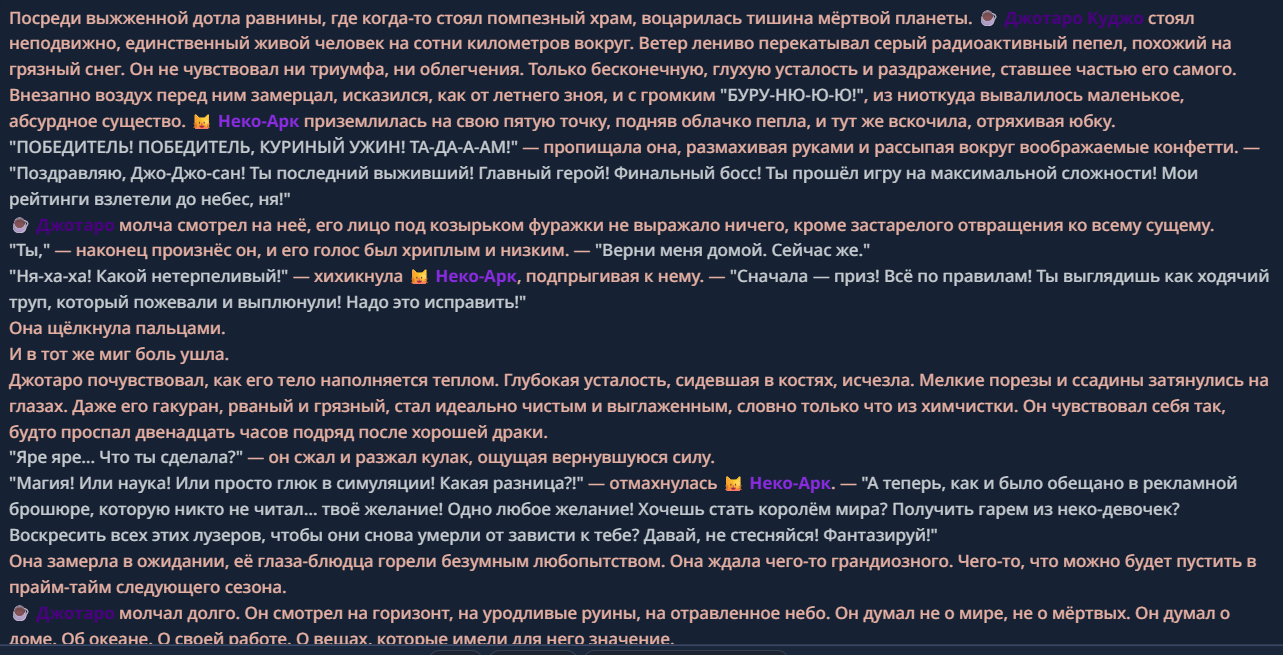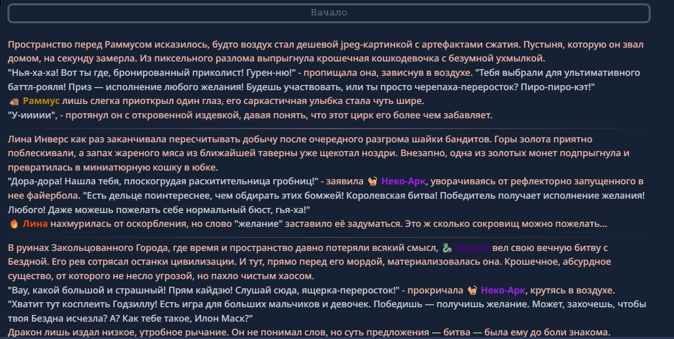 Мое мнение. Лучше режим с оригинальными персонажами, чем это. Ничего особенного из себя не преставляет, ничем не лучше, чем обычный, а чувства сопричастности к приключениям персонажа нет из-за того, что не прописываешь его. Ну, сдох и сдох. Еще и шизы нейронка наваливает.