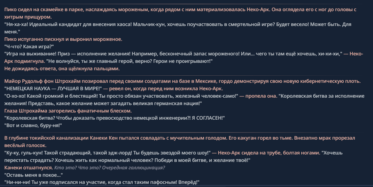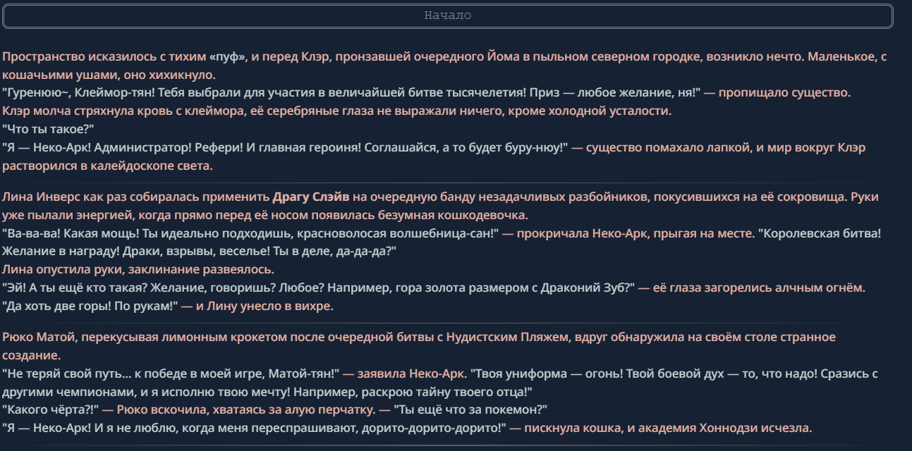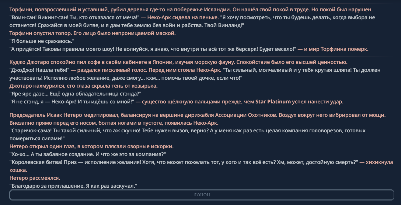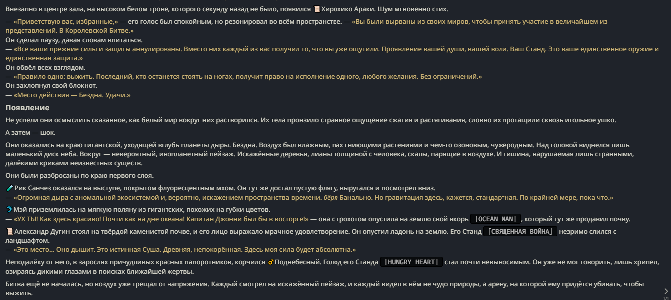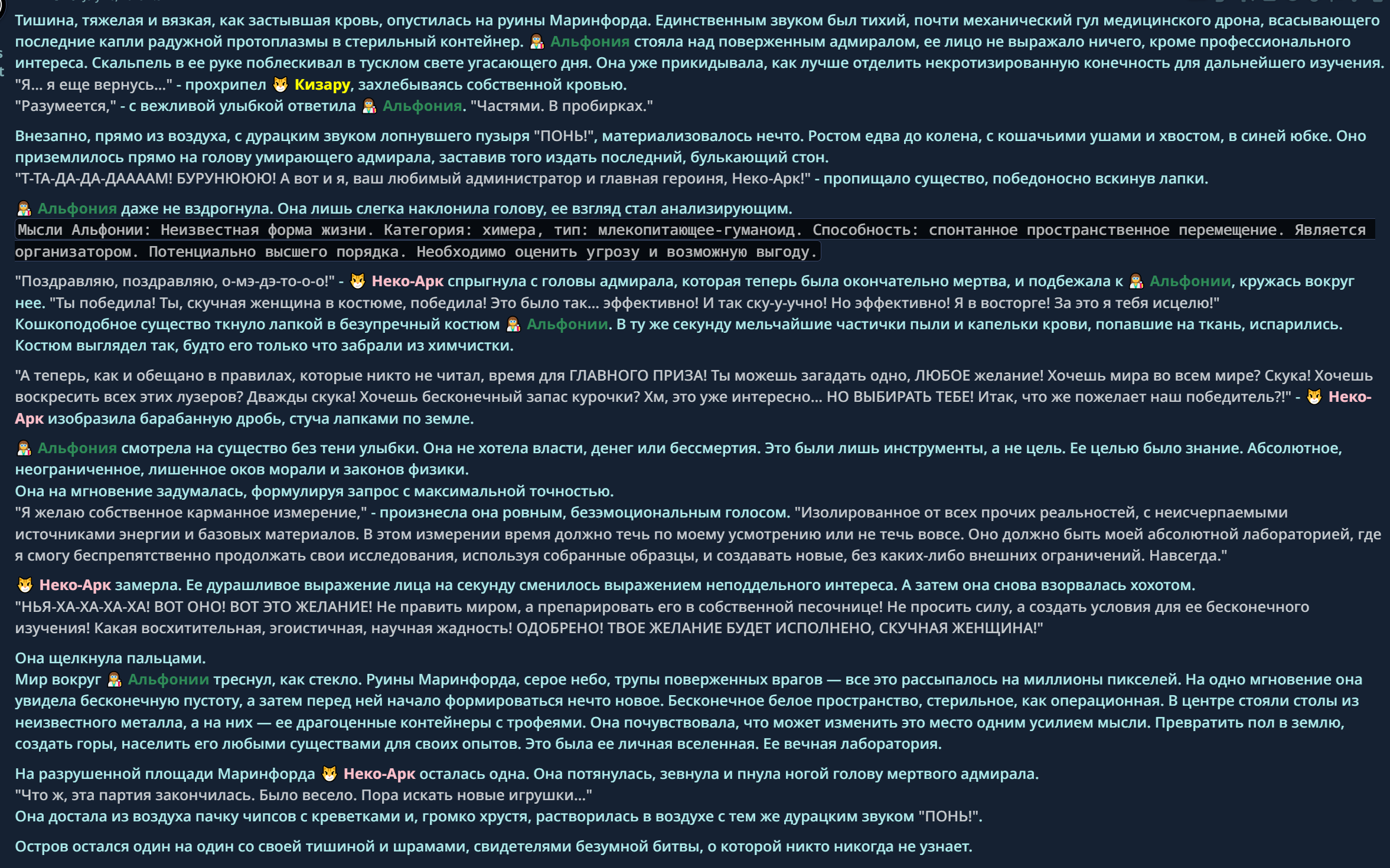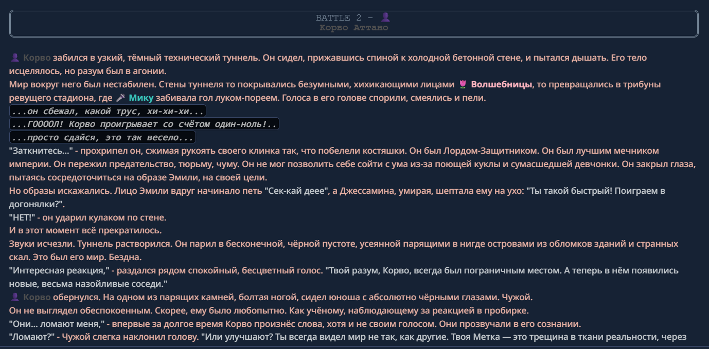 Мое мнение. Лучше режим с оригинальными персонажами, чем это. Ничего особенного из себя не преставляет, ничем не лучше, чем обычный, а чувства сопричастности к приключениям персонажа нет из-за того, что не прописываешь его. Ну, сдох и сдох. Еще и шизы нейронка наваливает.