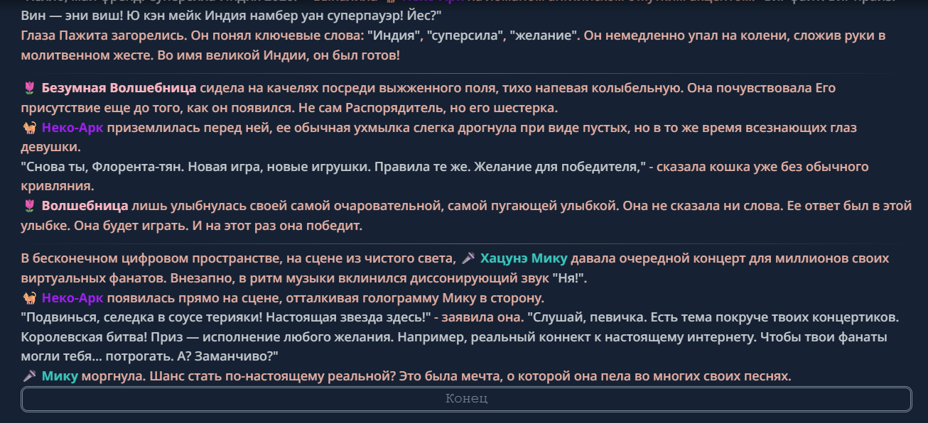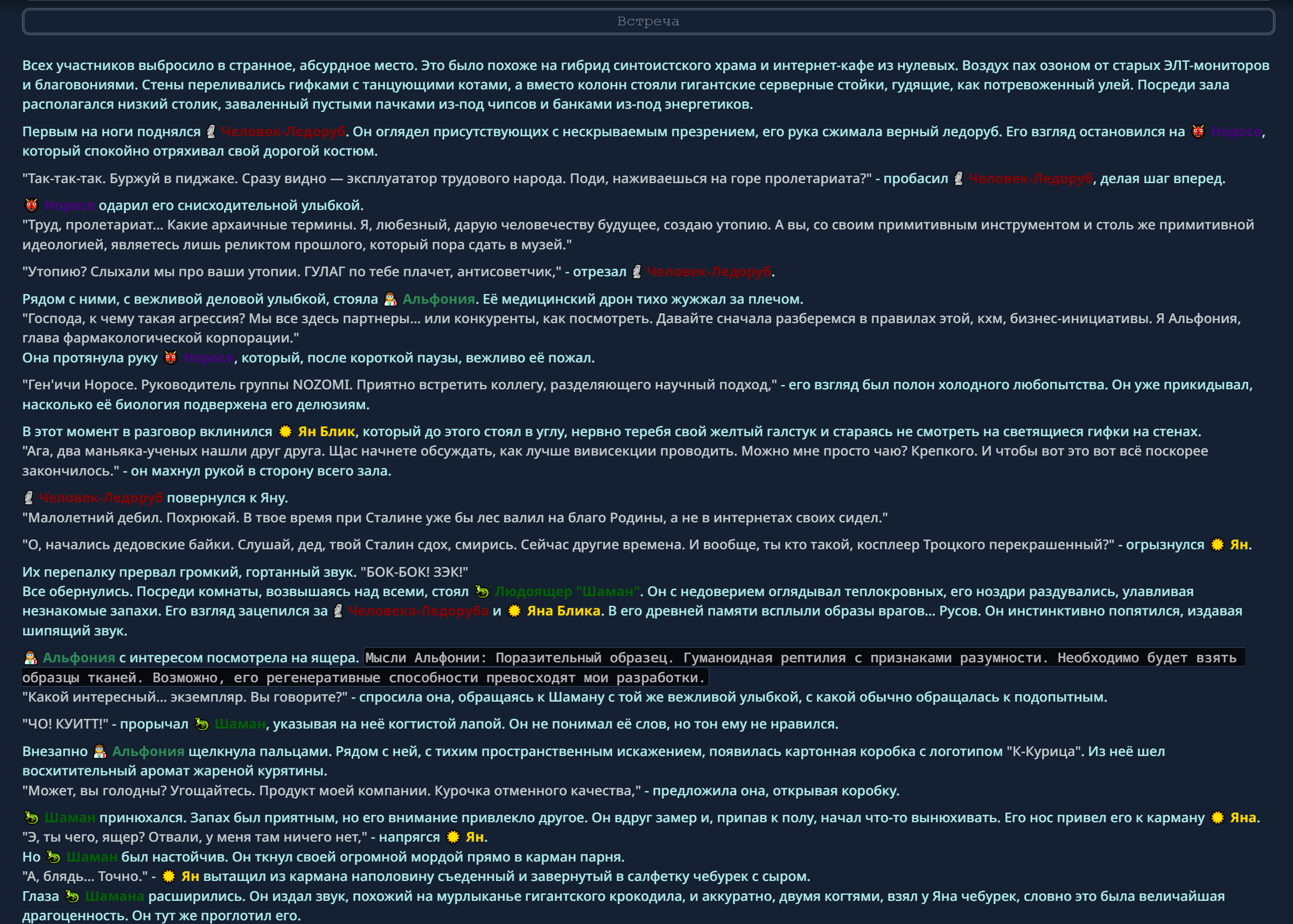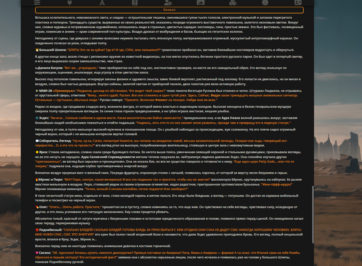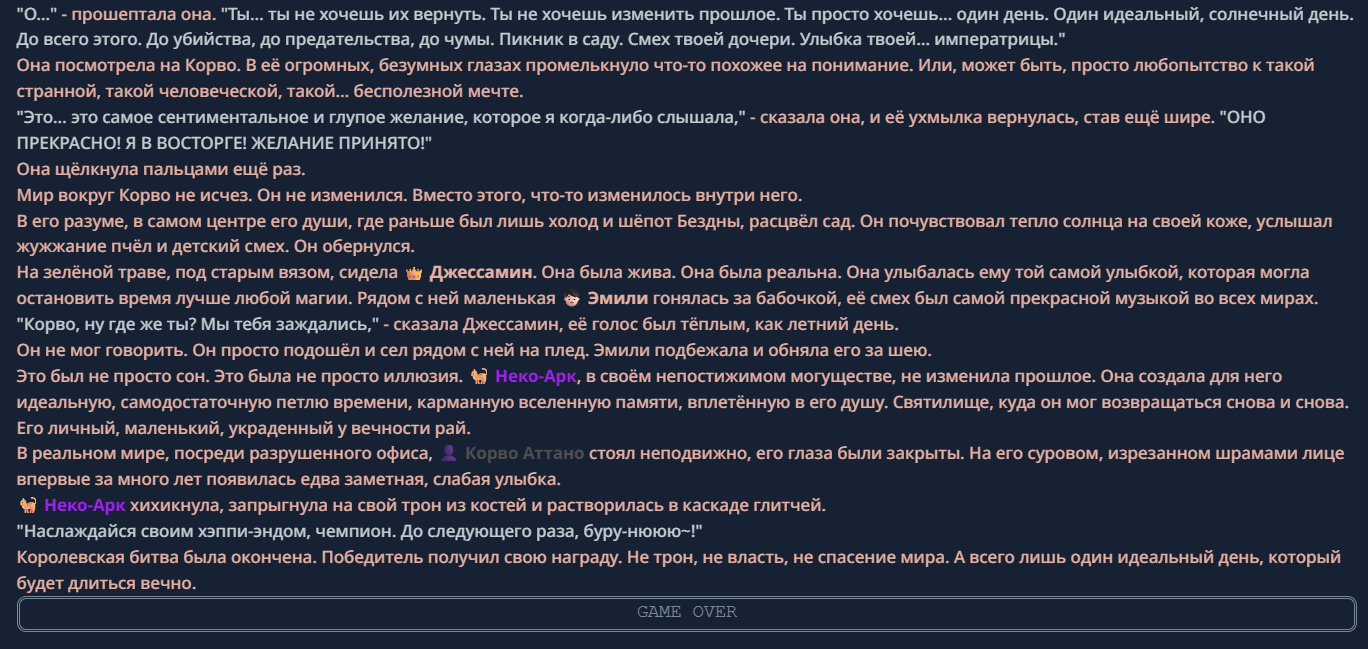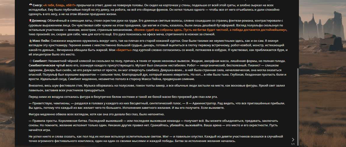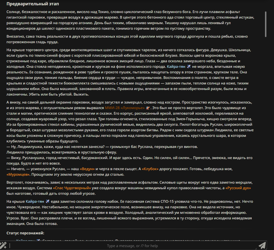 Мое мнение. Лучше режим с оригинальными персонажами, чем это. Ничего особенного из себя не преставляет, ничем не лучше, чем обычный, а чувства сопричастности к приключениям персонажа нет из-за того, что не прописываешь его. Ну, сдох и сдох. Еще и шизы нейронка наваливает.