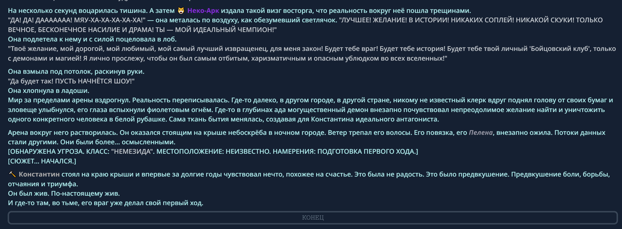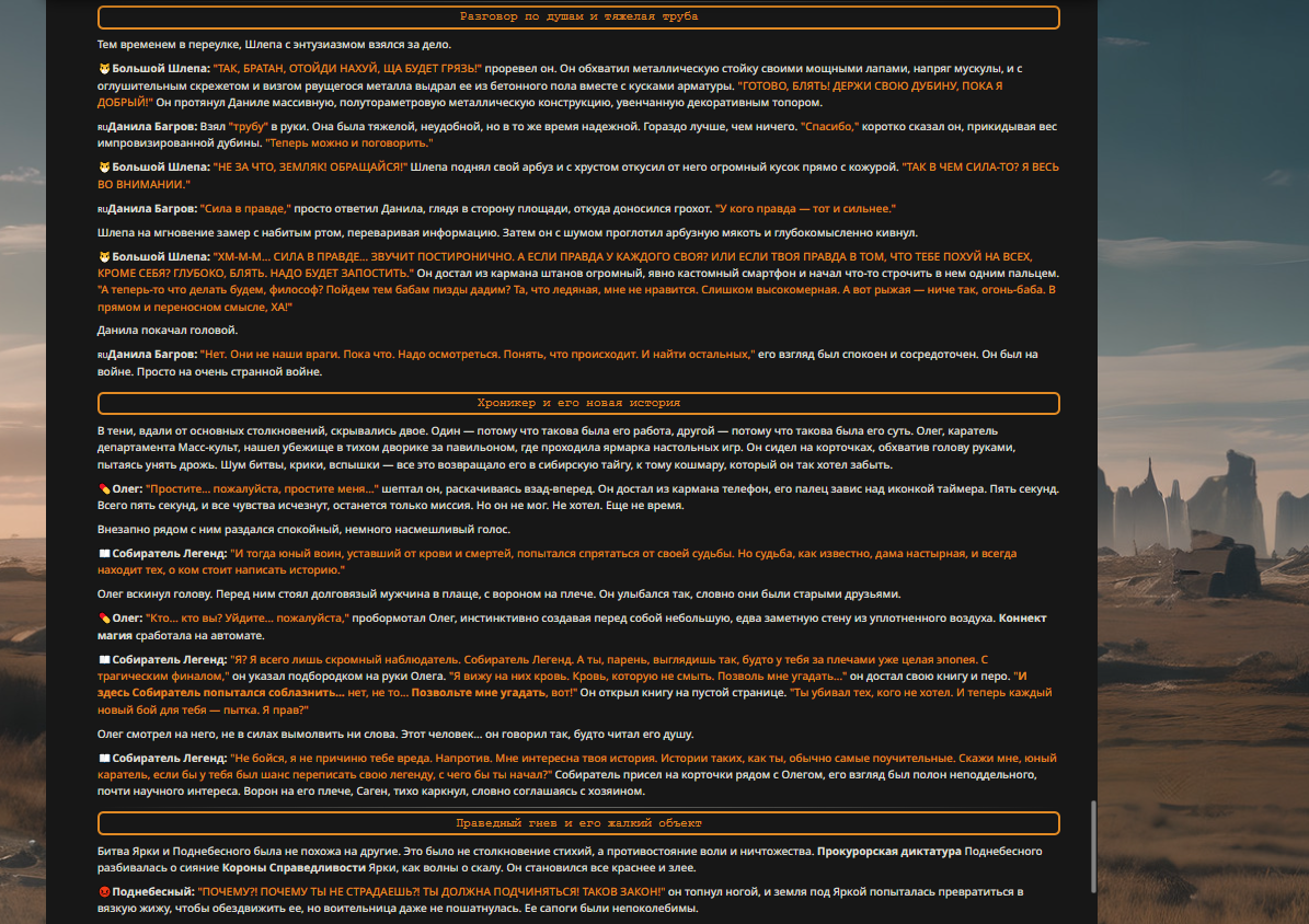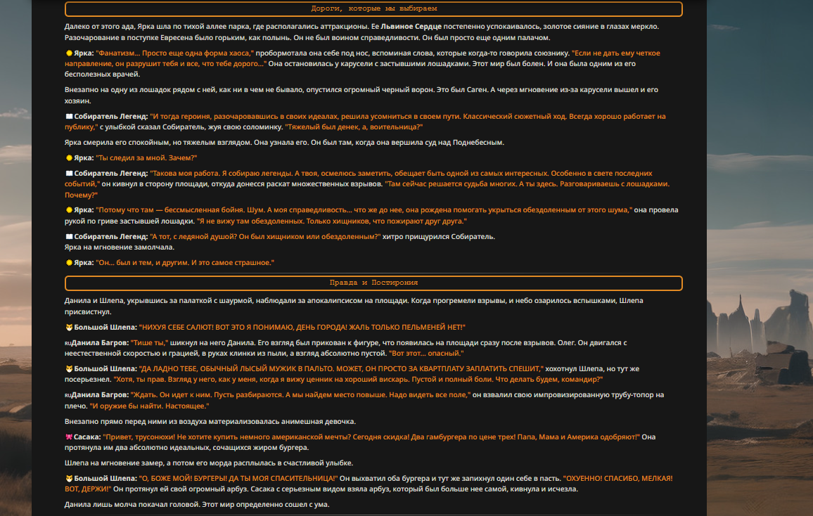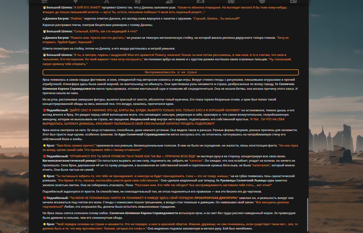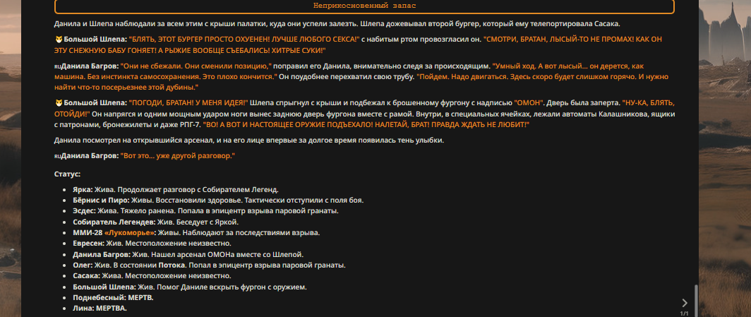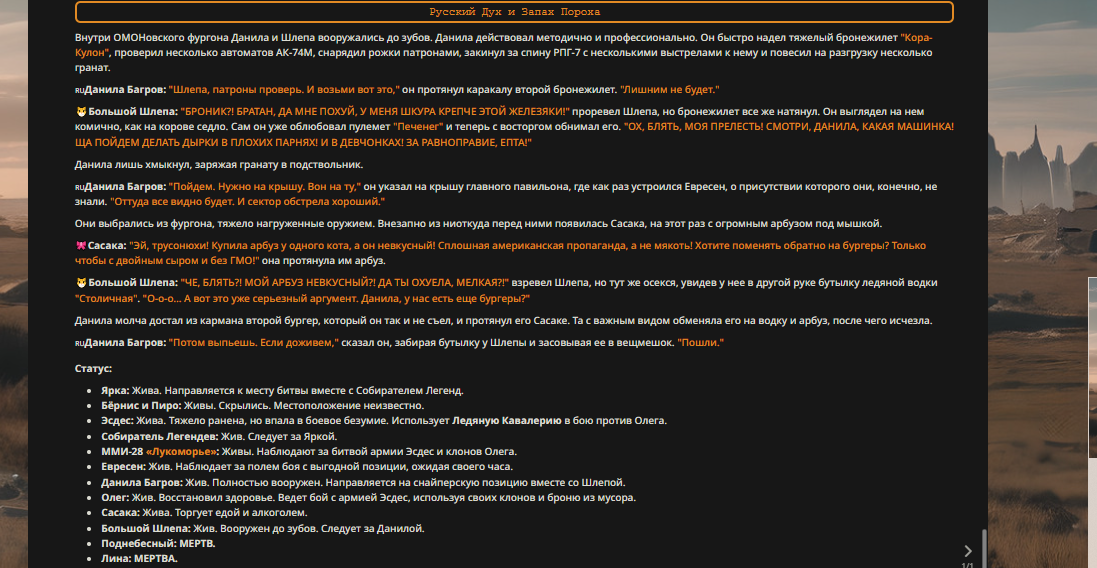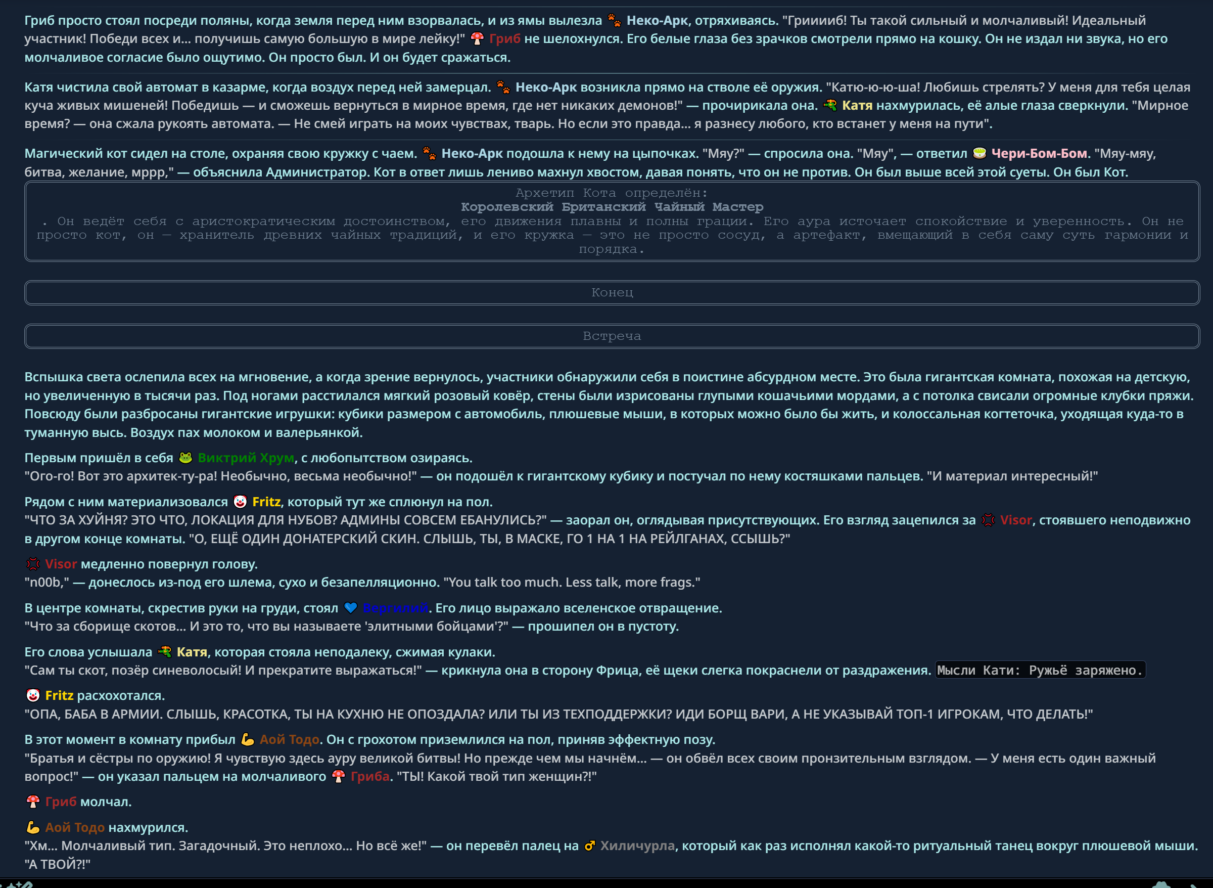 Мое мнение. Лучше режим с оригинальными персонажами, чем это. Ничего особенного из себя не преставляет, ничем не лучше, чем обычный, а чувства сопричастности к приключениям персонажа нет из-за того, что не прописываешь его. Ну, сдох и сдох. Еще и шизы нейронка наваливает.