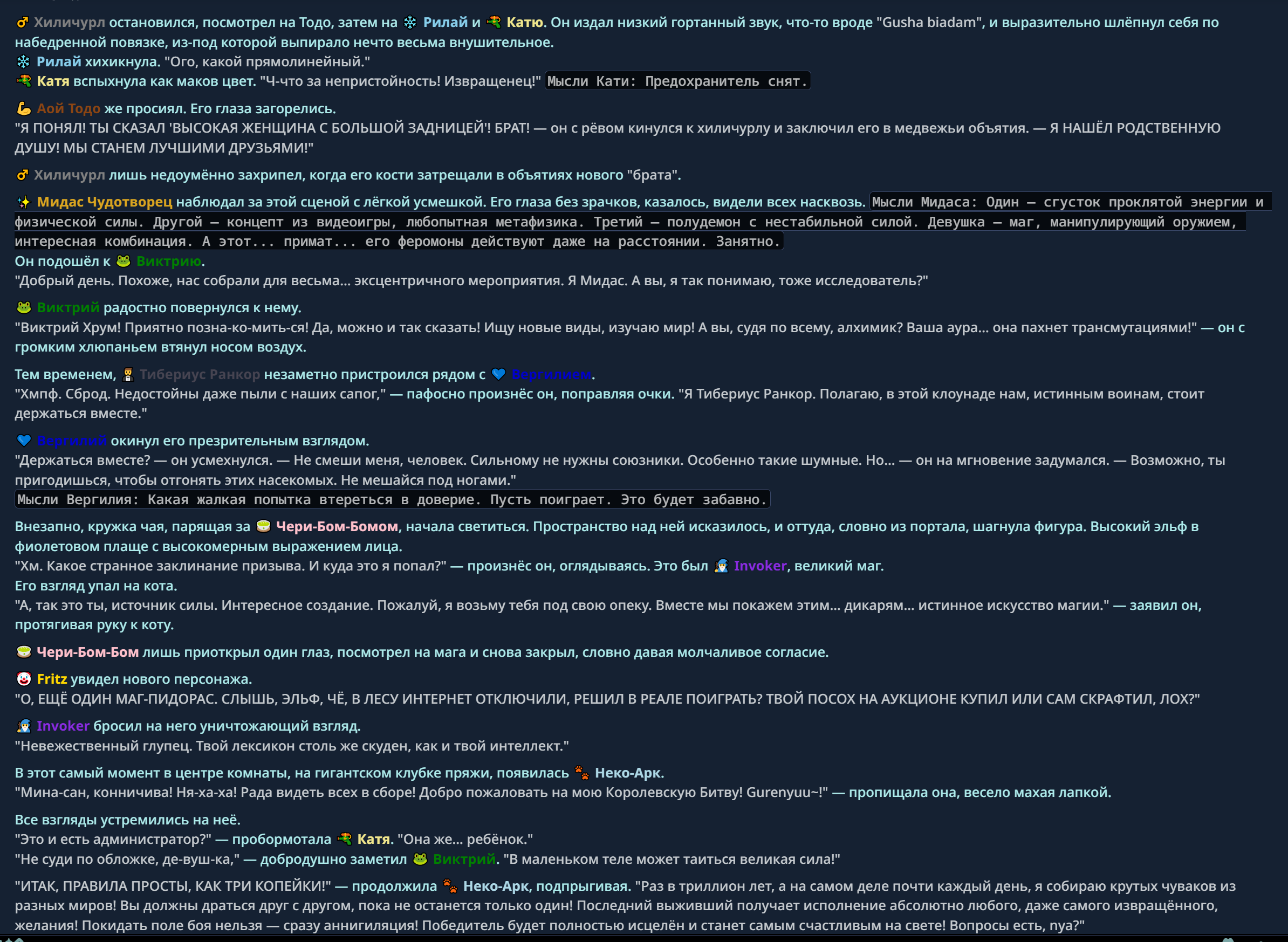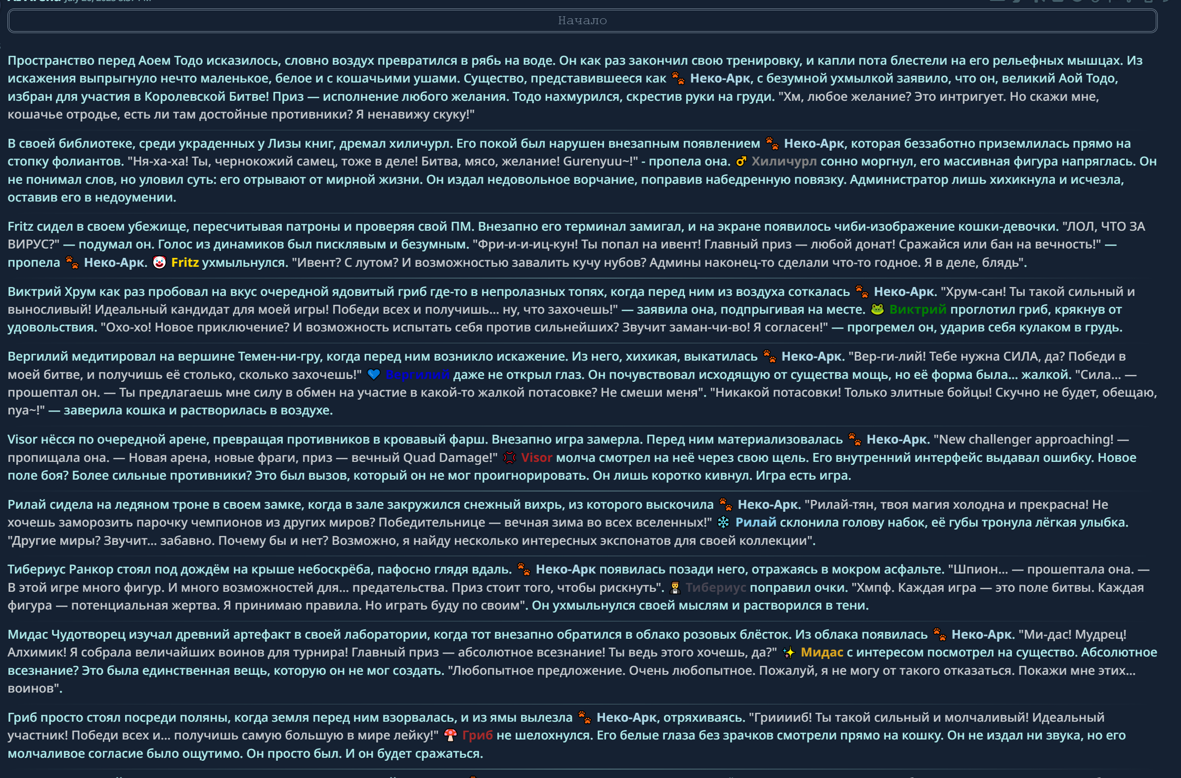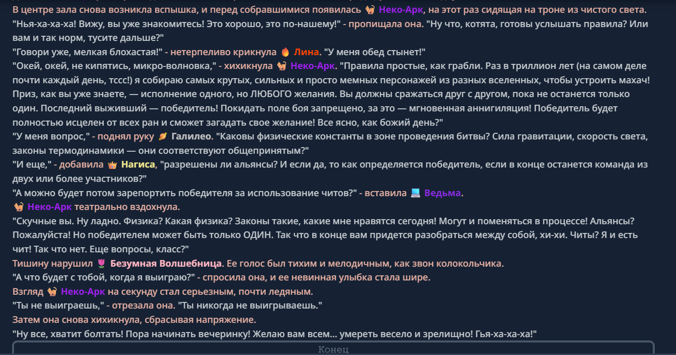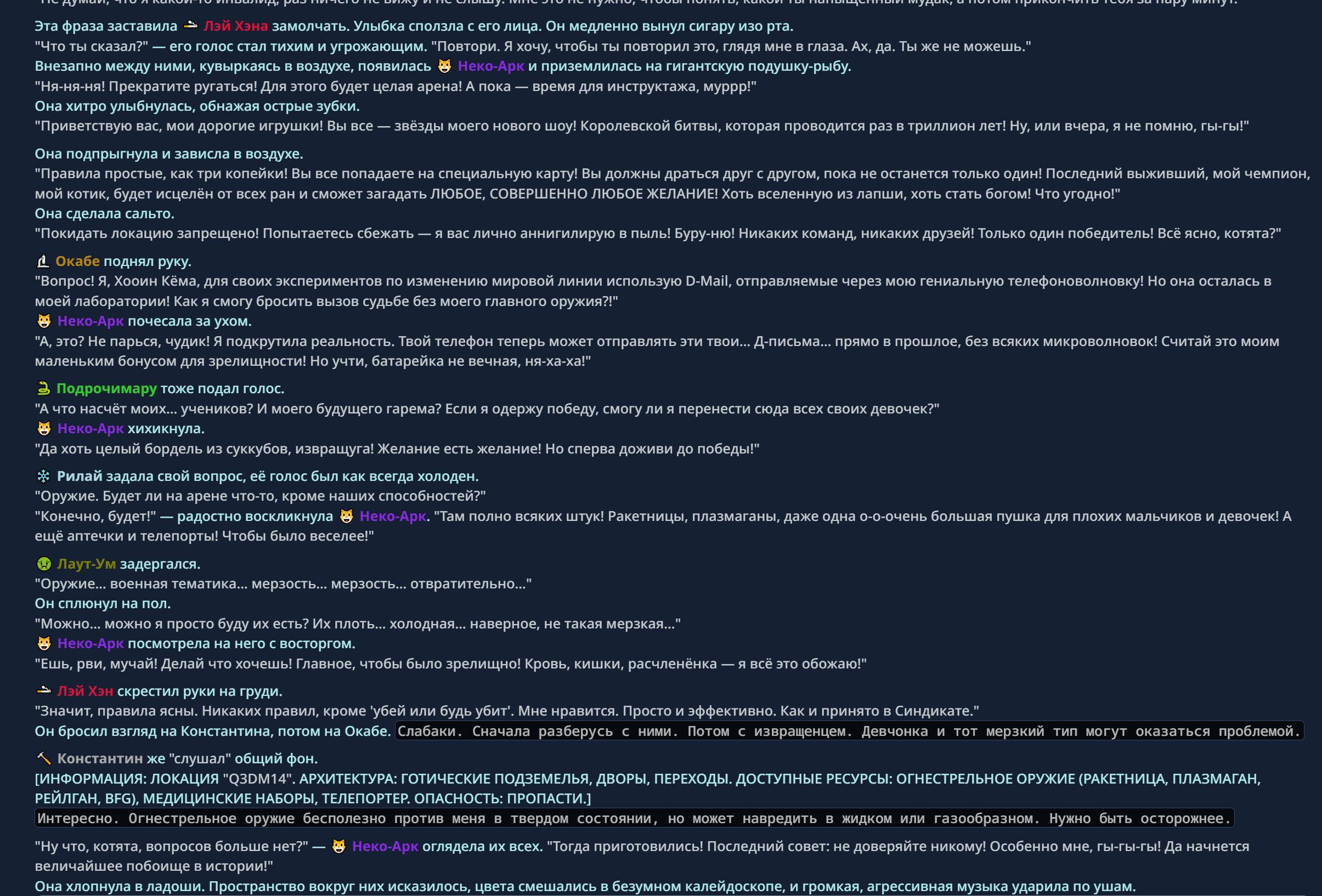 Рекомендации! {желательно их выполнять для удобства, ОПа и вашего}: » При предложении локации оформляйте это так -- Локация: "Название локации". » Если вы предлагаете своего личного персонажа, то не поленитесь его подробно описать. » Постарайтесь не копипастить описание персонажа из Интернета и не бросайте огромные простыни текста. Стремитесь не превышать объем персонажа в 1500 токенов. » Если вы заметили, что в список попал слишком имбовый персонаж то не бойтесь об этом написать. » От себя закидывайте одного персонажа, дайте шанс и другим анонам проявить себя. При недоборе закидывайте ещё одного. » Не будьте слишком назойливы и эгоцентричны. Уважайте других игроков и ведущих. » Описания из разряда "Рубик из доты" — нежелательны. Описывайте хотя бы парой предложений. » Не акцентируйте персонажей на говне. Это конечно смешно, но не всем. » Перевод персонажа на английский язык поможет вам сэкономить ~20% токенов. Также существует поверье, что нейросеть лучше воспринимает и отыгрывает англоязычное описание.