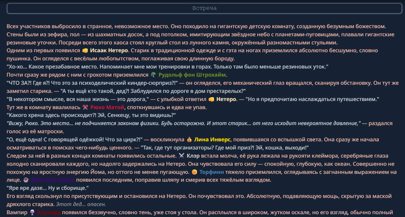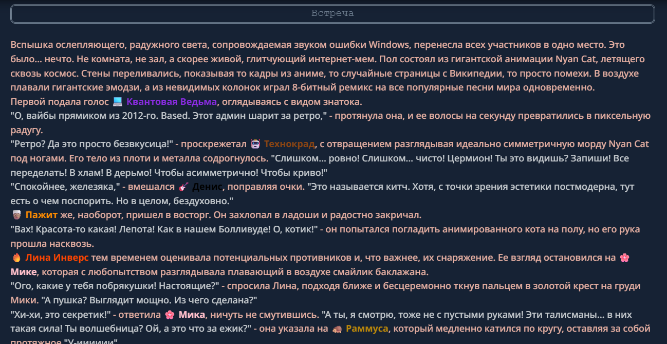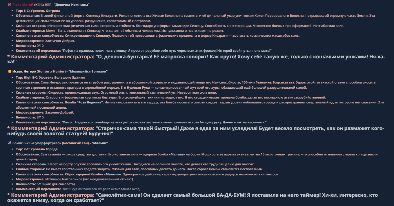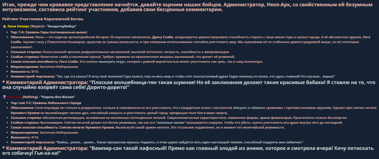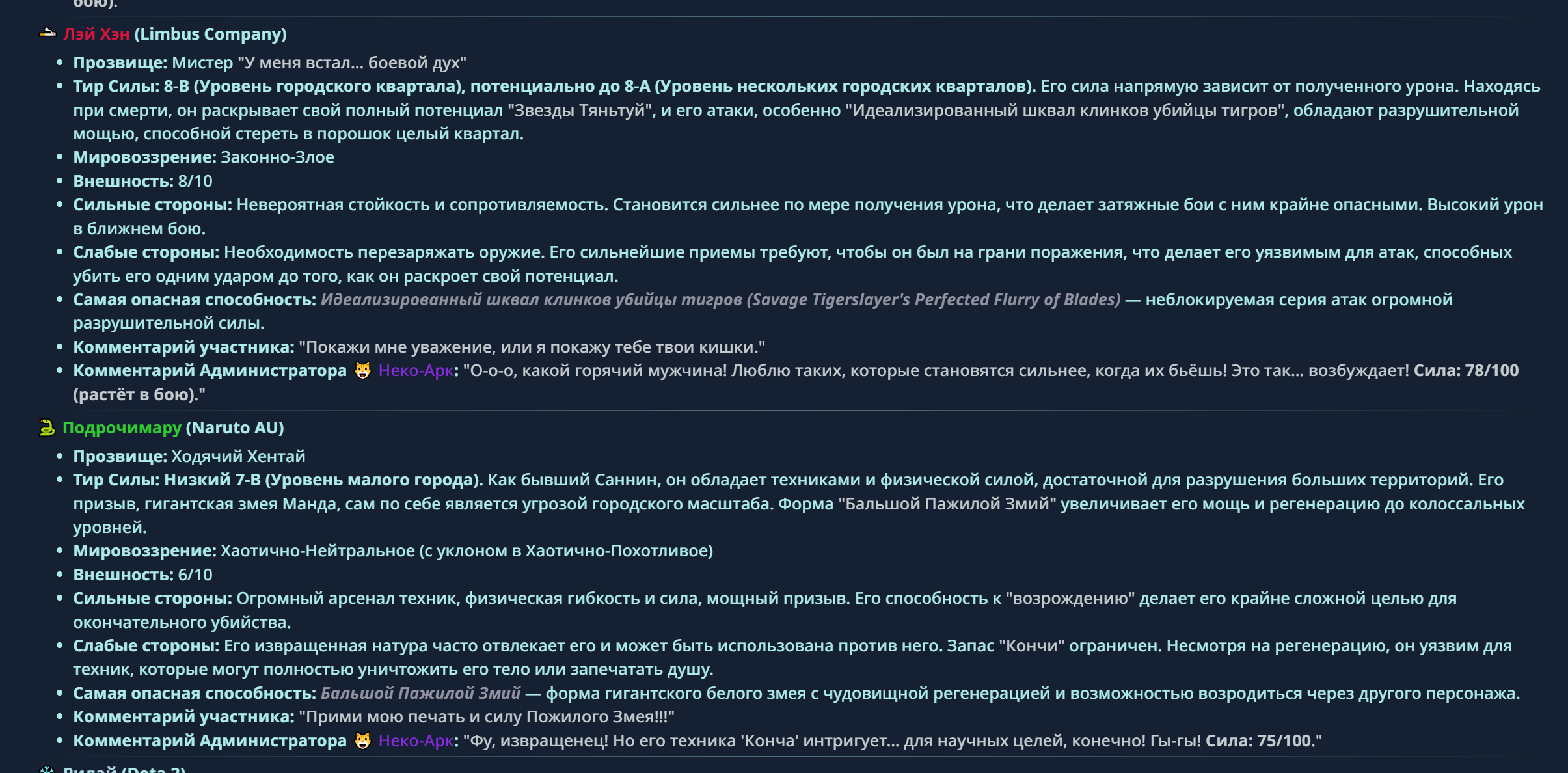 Рекомендации! {желательно их выполнять для удобства, ОПа и вашего}: » При предложении локации оформляйте это так -- Локация: "Название локации". » Если вы предлагаете своего личного персонажа, то не поленитесь его подробно описать. » Постарайтесь не копипастить описание персонажа из Интернета и не бросайте огромные простыни текста. Стремитесь не превышать объем персонажа в 1500 токенов. » Если вы заметили, что в список попал слишком имбовый персонаж то не бойтесь об этом написать. » От себя закидывайте одного персонажа, дайте шанс и другим анонам проявить себя. При недоборе закидывайте ещё одного. » Не будьте слишком назойливы и эгоцентричны. Уважайте других игроков и ведущих. » Описания из разряда "Рубик из доты" — нежелательны. Описывайте хотя бы парой предложений. » Не акцентируйте персонажей на говне. Это конечно смешно, но не всем. » Перевод персонажа на английский язык поможет вам сэкономить ~20% токенов. Также существует поверье, что нейросеть лучше воспринимает и отыгрывает англоязычное описание.