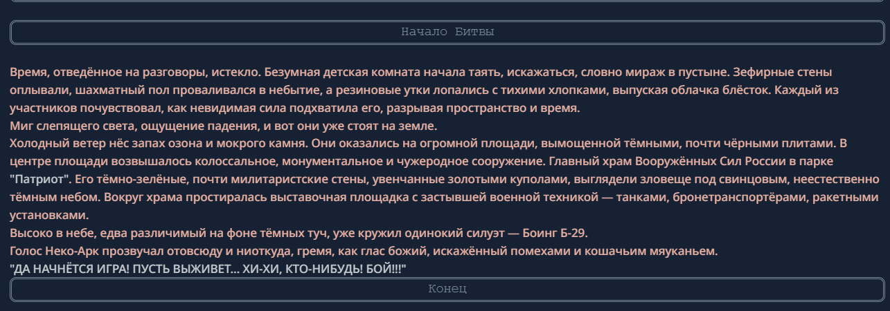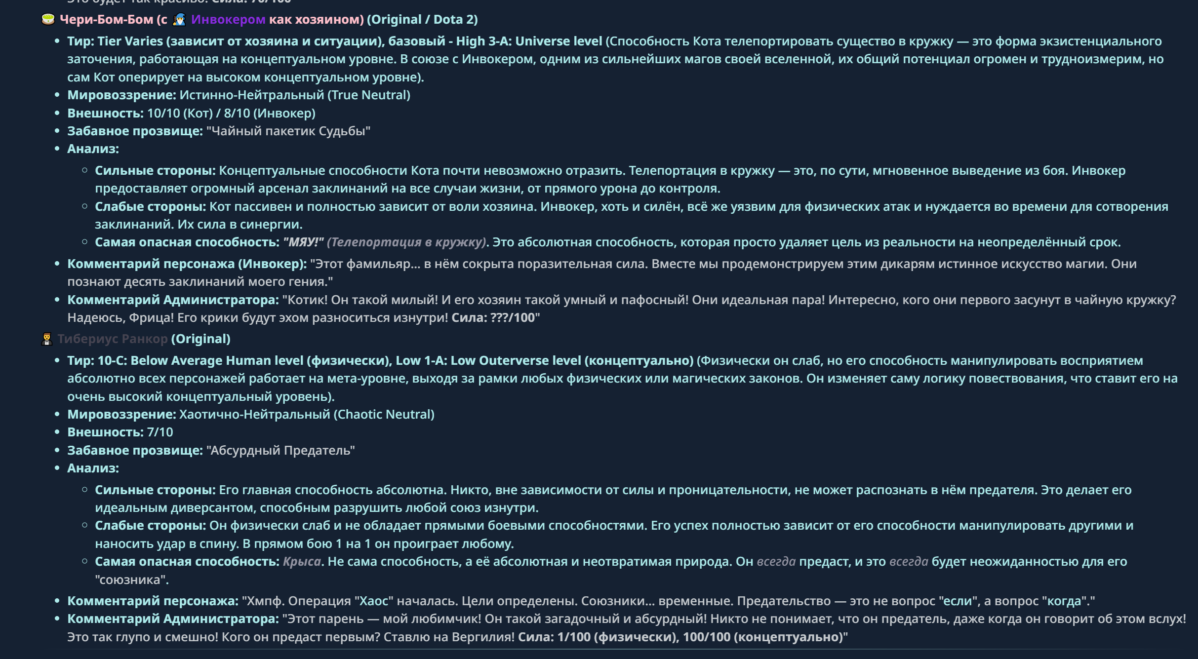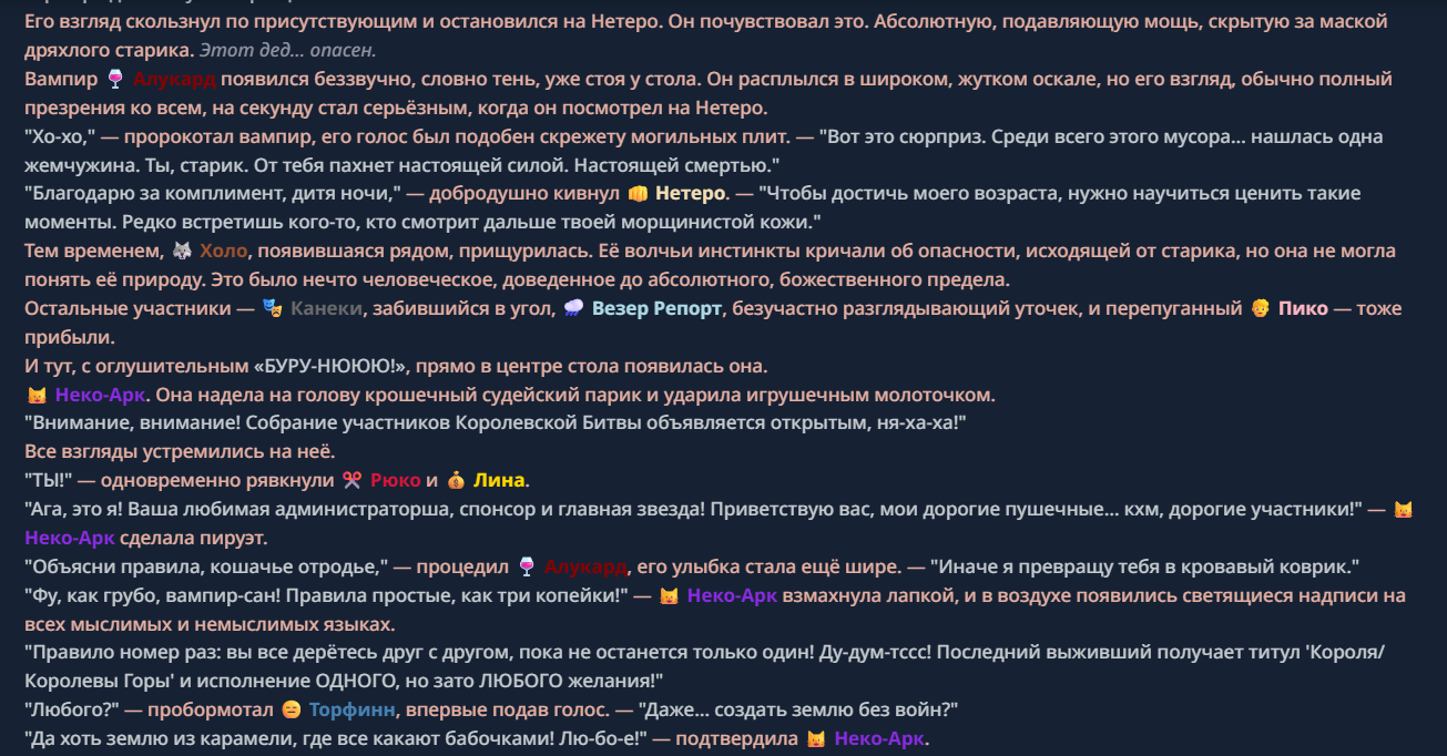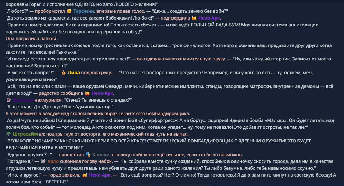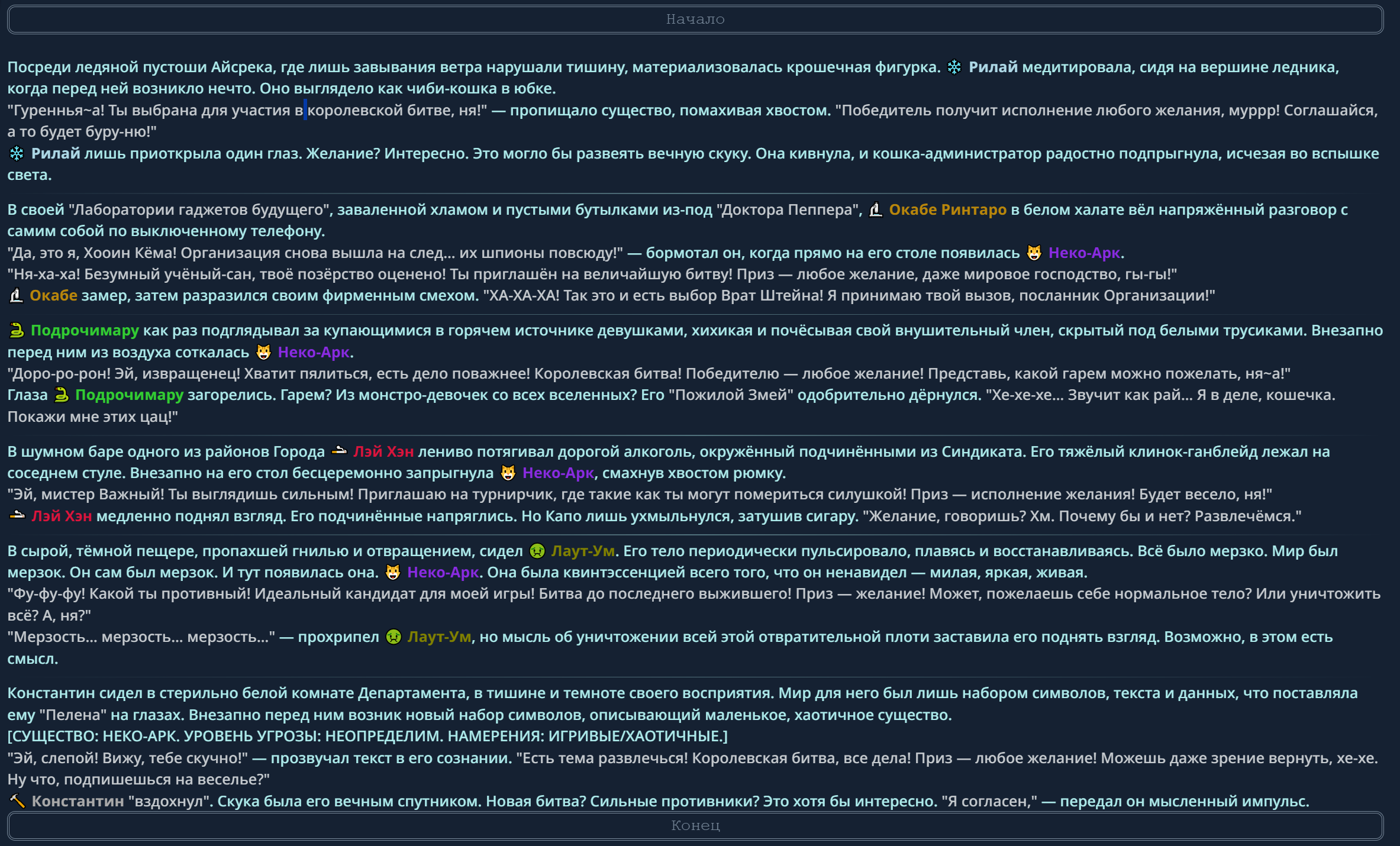 Рекомендации! {желательно их выполнять для удобства, ОПа и вашего}: » При предложении локации оформляйте это так -- Локация: "Название локации". » Если вы предлагаете своего личного персонажа, то не поленитесь его подробно описать. » Постарайтесь не копипастить описание персонажа из Интернета и не бросайте огромные простыни текста. Стремитесь не превышать объем персонажа в 1500 токенов. » Если вы заметили, что в список попал слишком имбовый персонаж то не бойтесь об этом написать. » От себя закидывайте одного персонажа, дайте шанс и другим анонам проявить себя. При недоборе закидывайте ещё одного. » Не будьте слишком назойливы и эгоцентричны. Уважайте других игроков и ведущих. » Описания из разряда "Рубик из доты" — нежелательны. Описывайте хотя бы парой предложений. » Не акцентируйте персонажей на говне. Это конечно смешно, но не всем. » Перевод персонажа на английский язык поможет вам сэкономить ~20% токенов. Также существует поверье, что нейросеть лучше воспринимает и отыгрывает англоязычное описание.