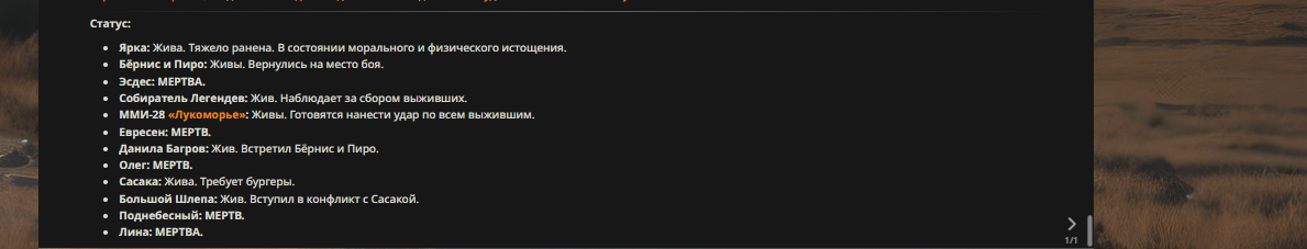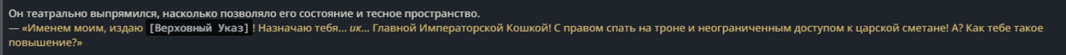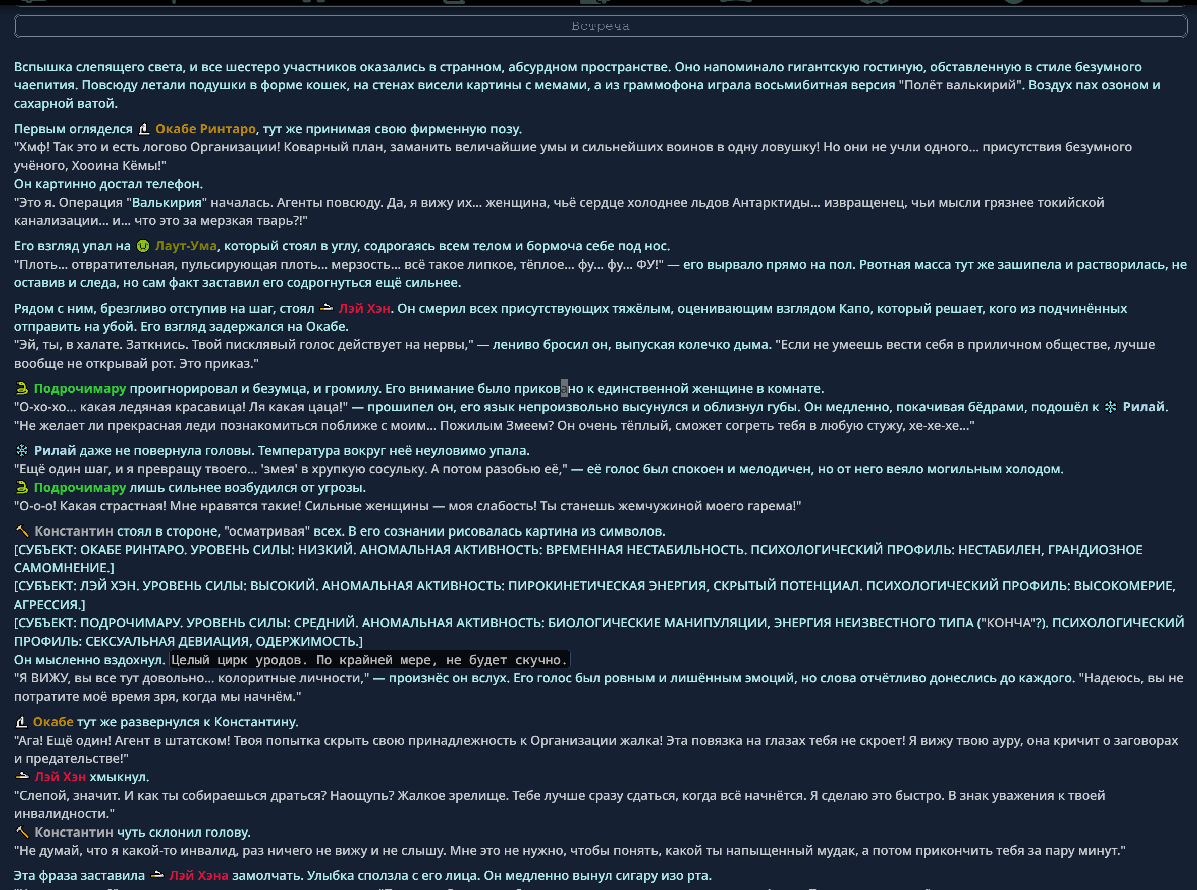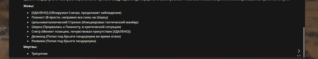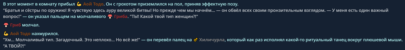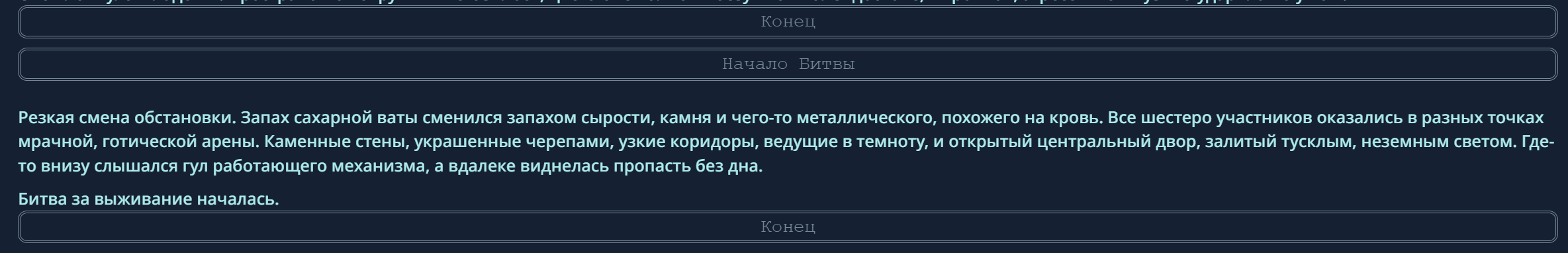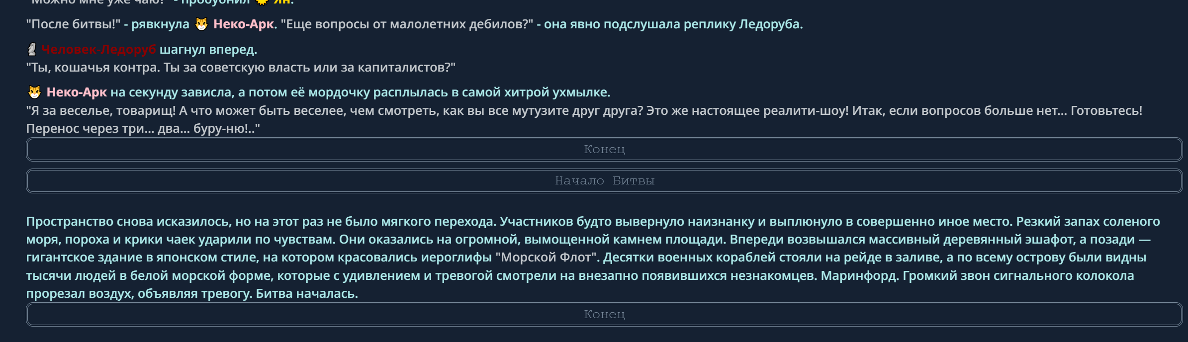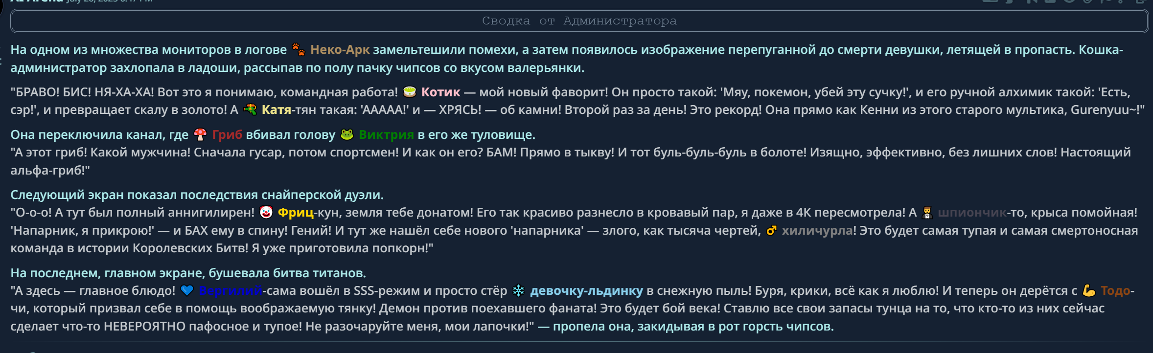 Рекомендации! {желательно их выполнять для удобства, ОПа и вашего}: » При предложении локации оформляйте это так -- Локация: "Название локации". » Если вы предлагаете своего личного персонажа, то не поленитесь его подробно описать. » Постарайтесь не копипастить описание персонажа из Интернета и не бросайте огромные простыни текста. Стремитесь не превышать объем персонажа в 1500 токенов. » Если вы заметили, что в список попал слишком имбовый персонаж то не бойтесь об этом написать. » От себя закидывайте одного персонажа, дайте шанс и другим анонам проявить себя. При недоборе закидывайте ещё одного. » Не будьте слишком назойливы и эгоцентричны. Уважайте других игроков и ведущих. » Описания из разряда "Рубик из доты" — нежелательны. Описывайте хотя бы парой предложений. » Не акцентируйте персонажей на говне. Это конечно смешно, но не всем. » Перевод персонажа на английский язык поможет вам сэкономить ~20% токенов. Также существует поверье, что нейросеть лучше воспринимает и отыгрывает англоязычное описание.