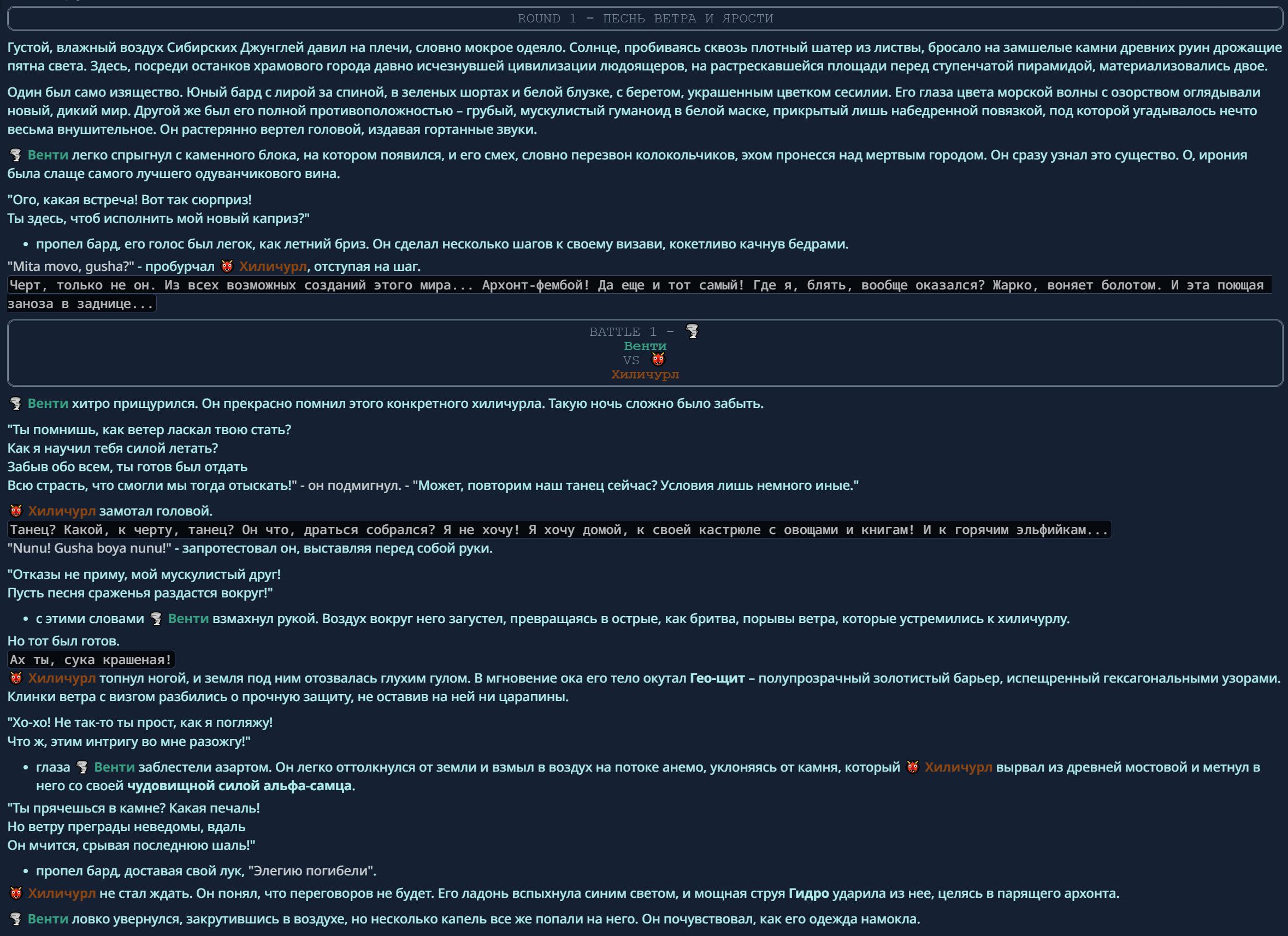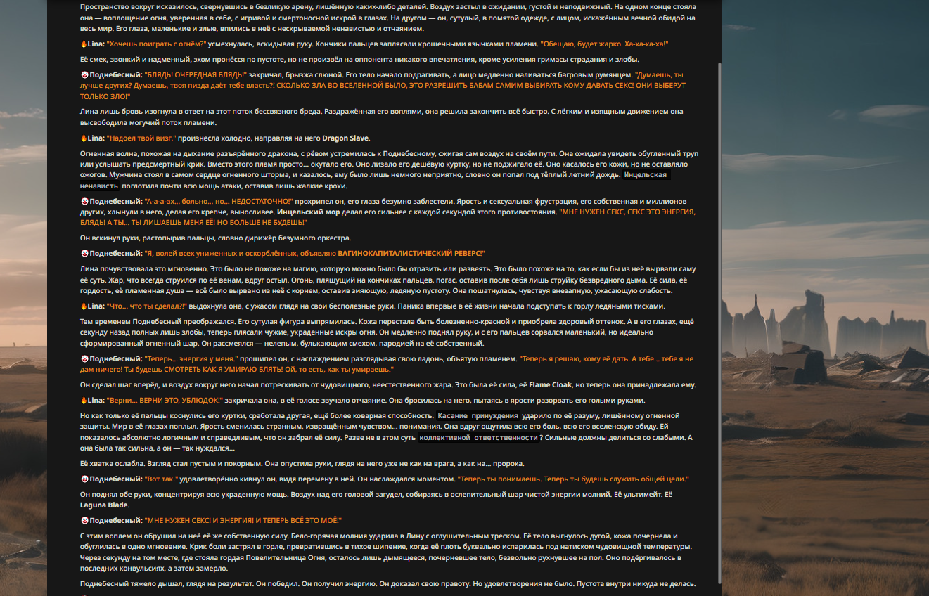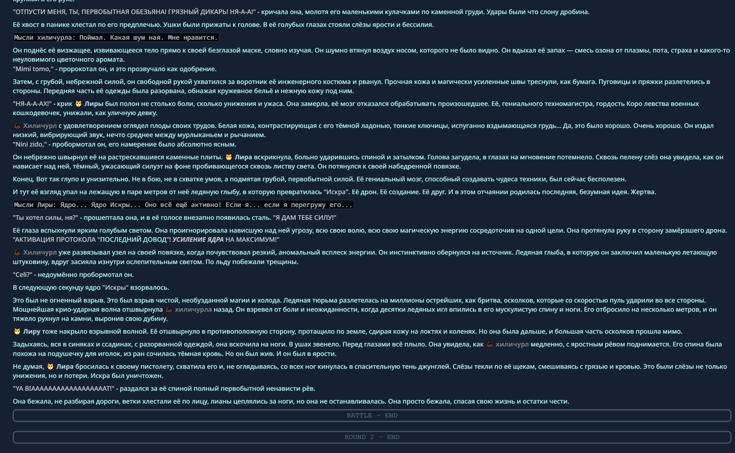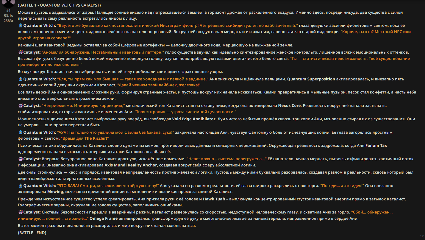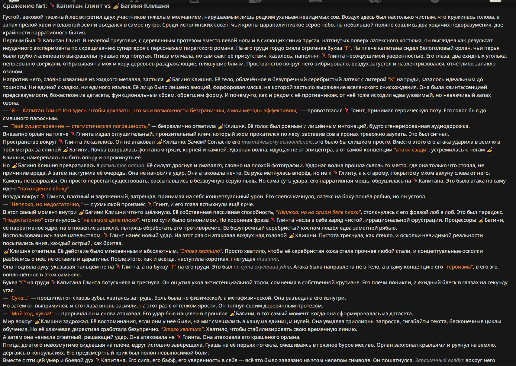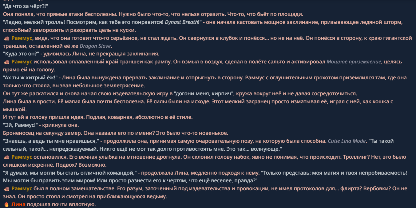 >>841604 Самое смешное было на какой-то совсем старой версии промта, где я забыл врубить галочку боя и персонажи в раунде внезапно стали чаще использовать навыки и вообще вести себя адекватнее xD. Но это было ещё в марте что ли.