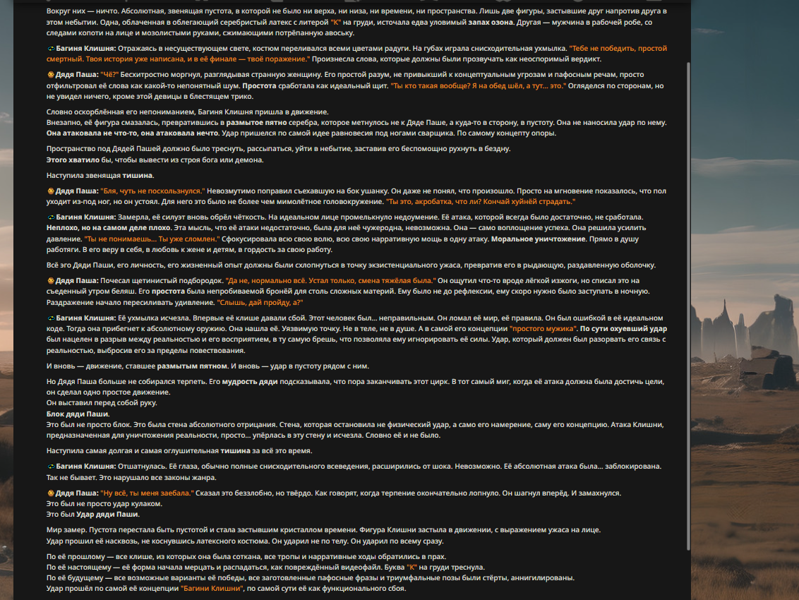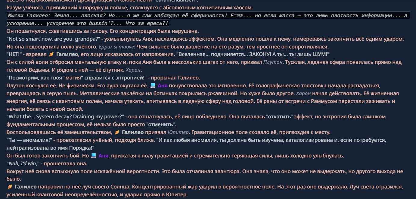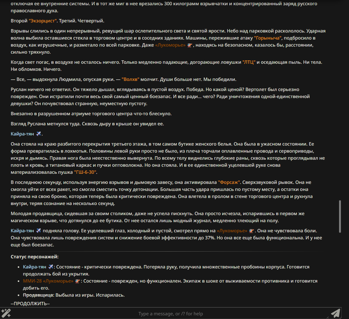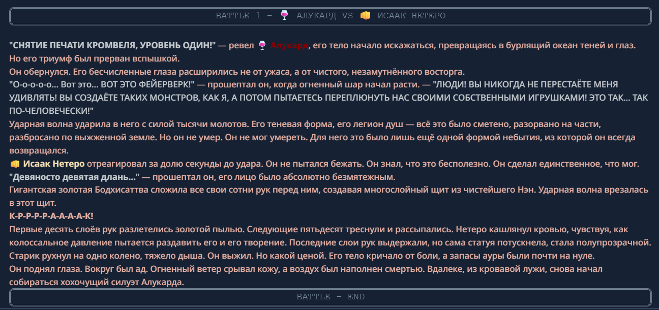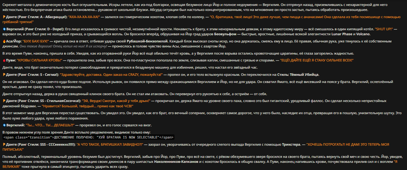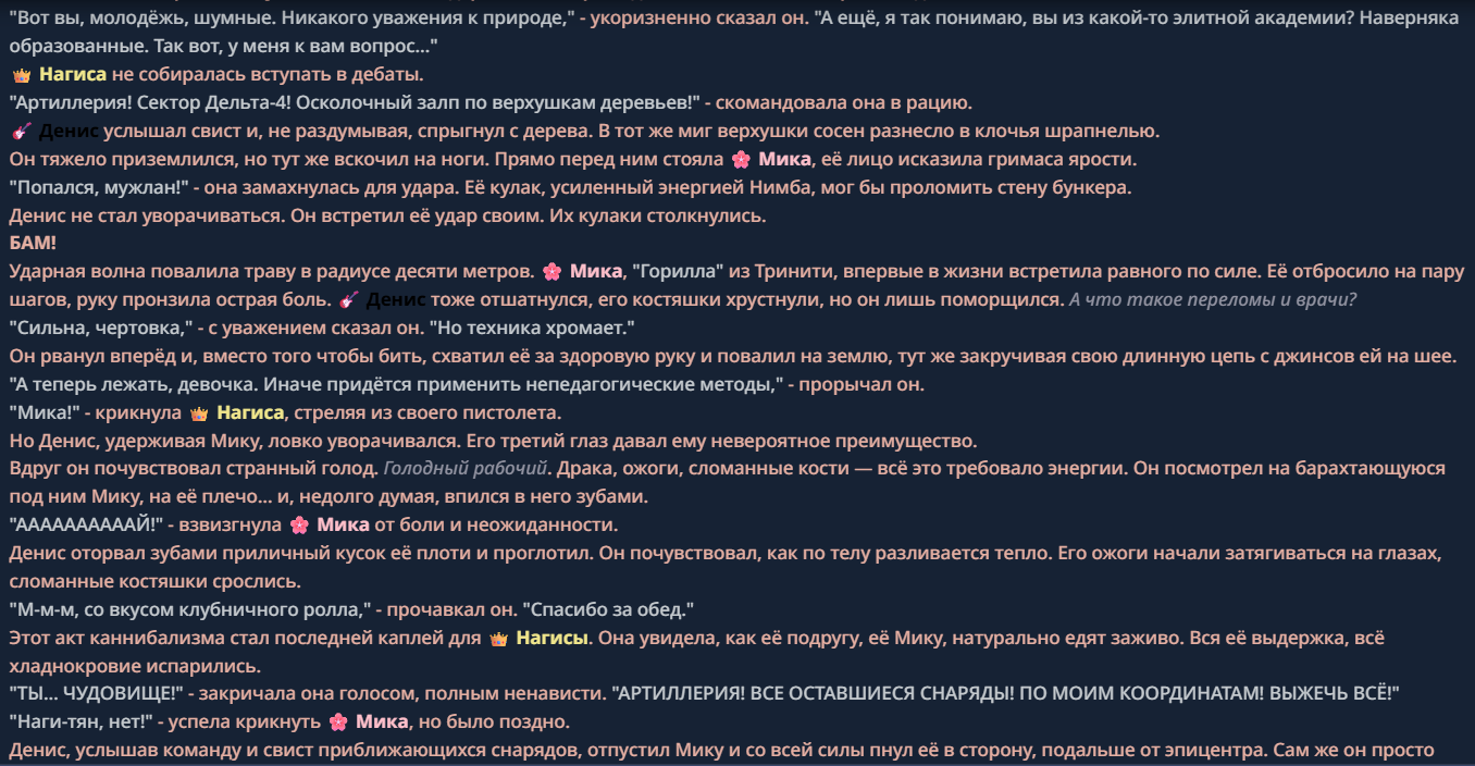 >>841604 Самое смешное было на какой-то совсем старой версии промта, где я забыл врубить галочку боя и персонажи в раунде внезапно стали чаще использовать навыки и вообще вести себя адекватнее xD. Но это было ещё в марте что ли.