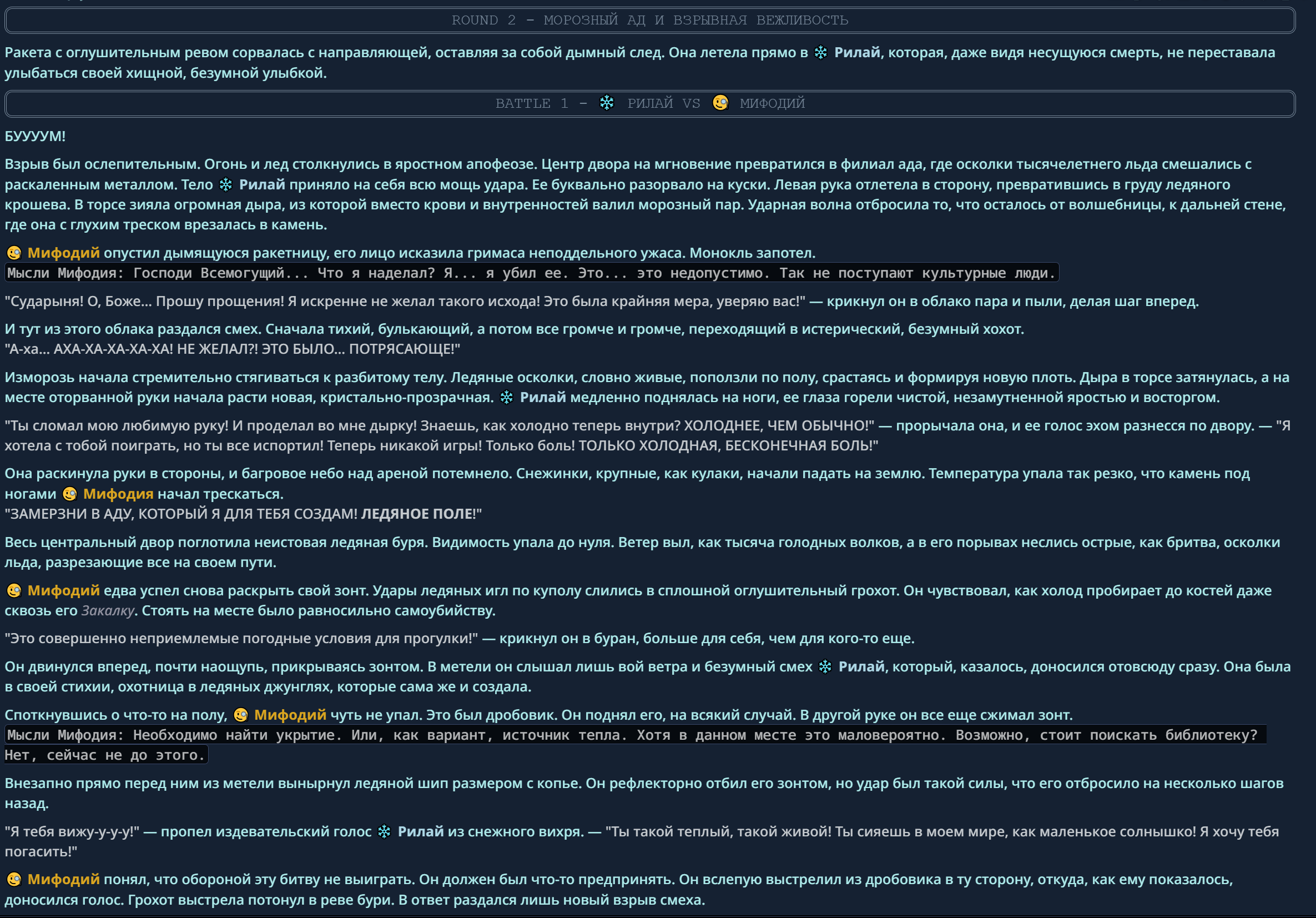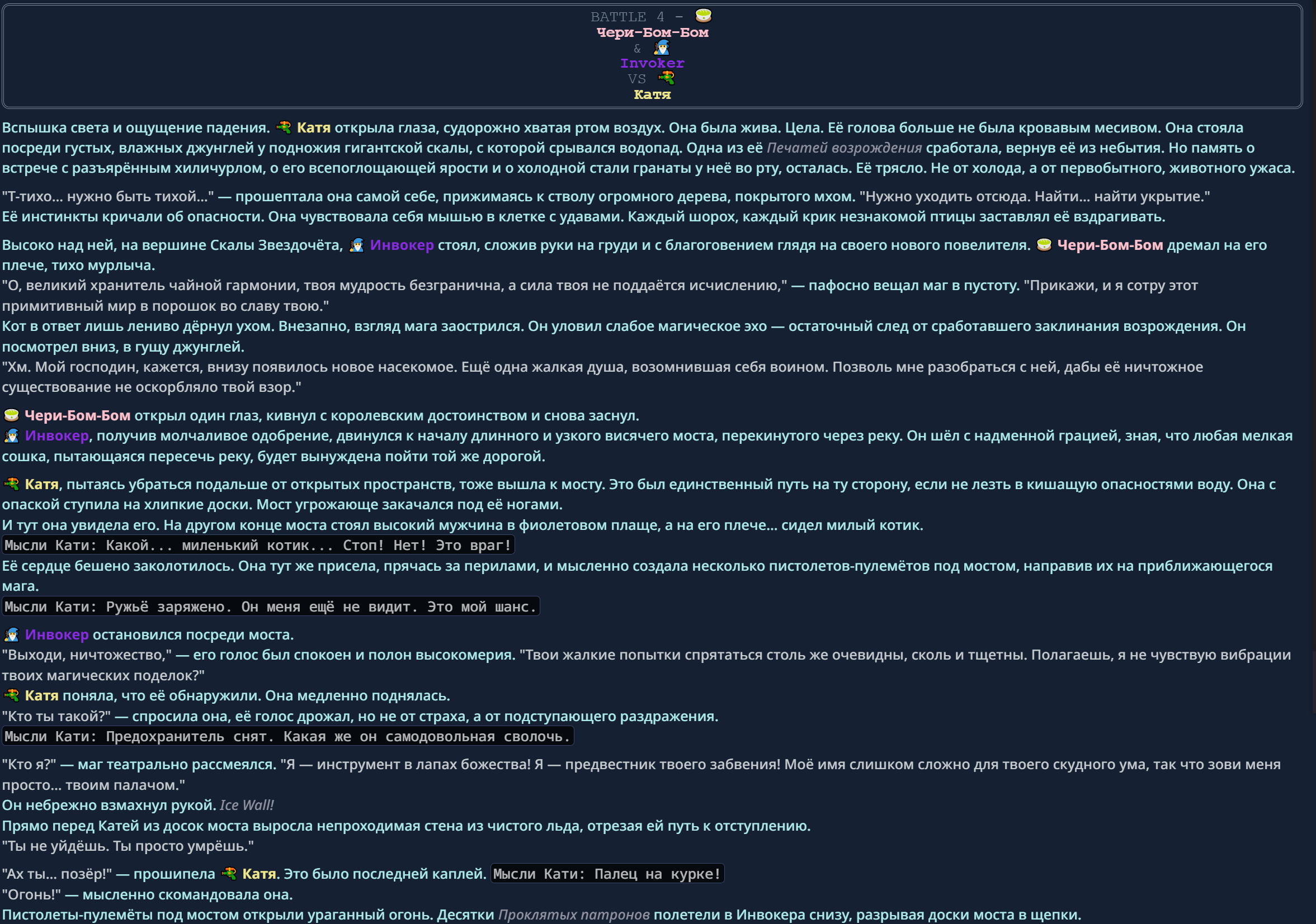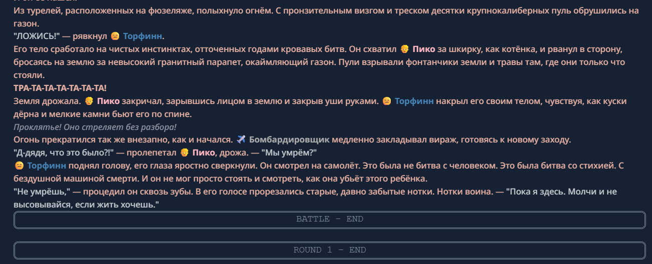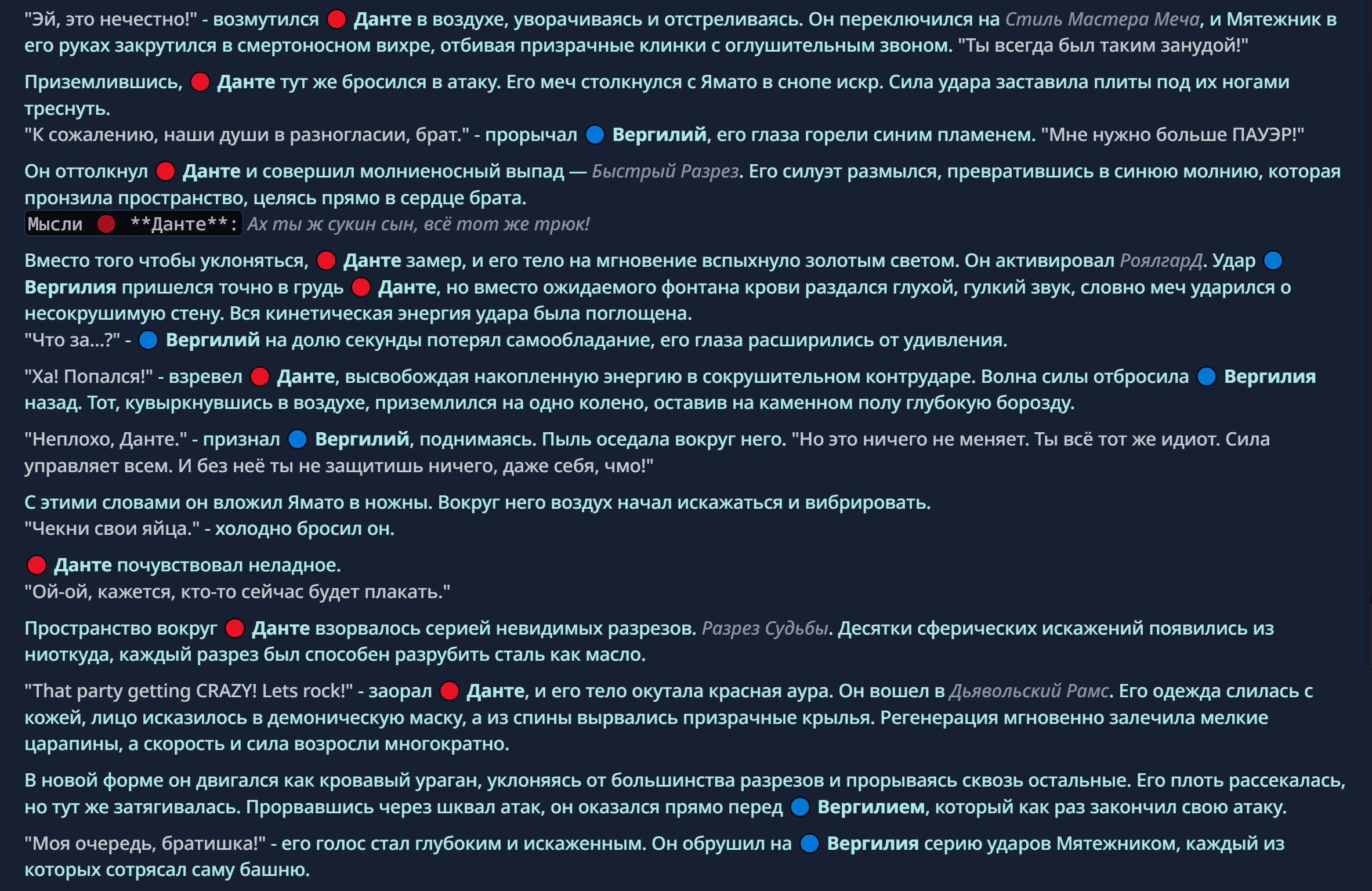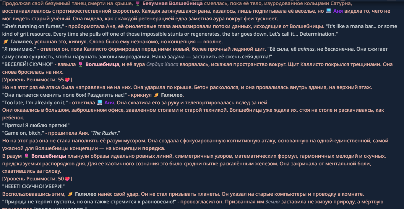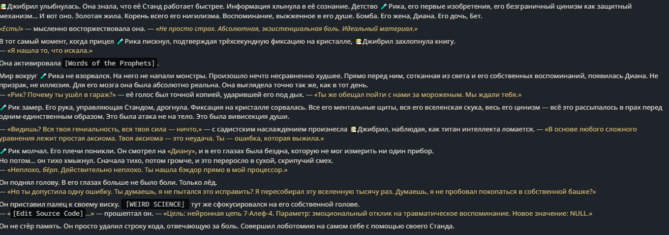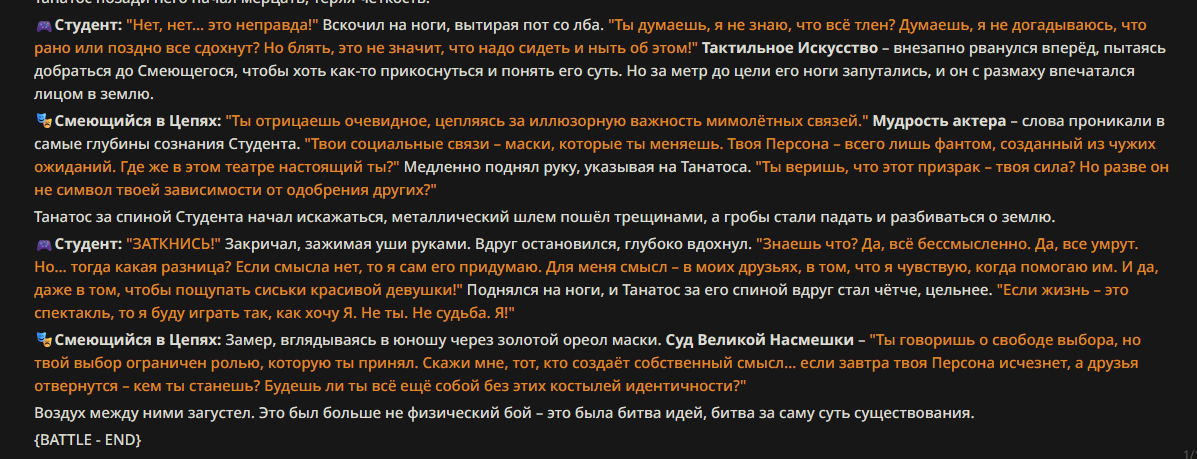 >>841604 Самое смешное было на какой-то совсем старой версии промта, где я забыл врубить галочку боя и персонажи в раунде внезапно стали чаще использовать навыки и вообще вести себя адекватнее xD. Но это было ещё в марте что ли.