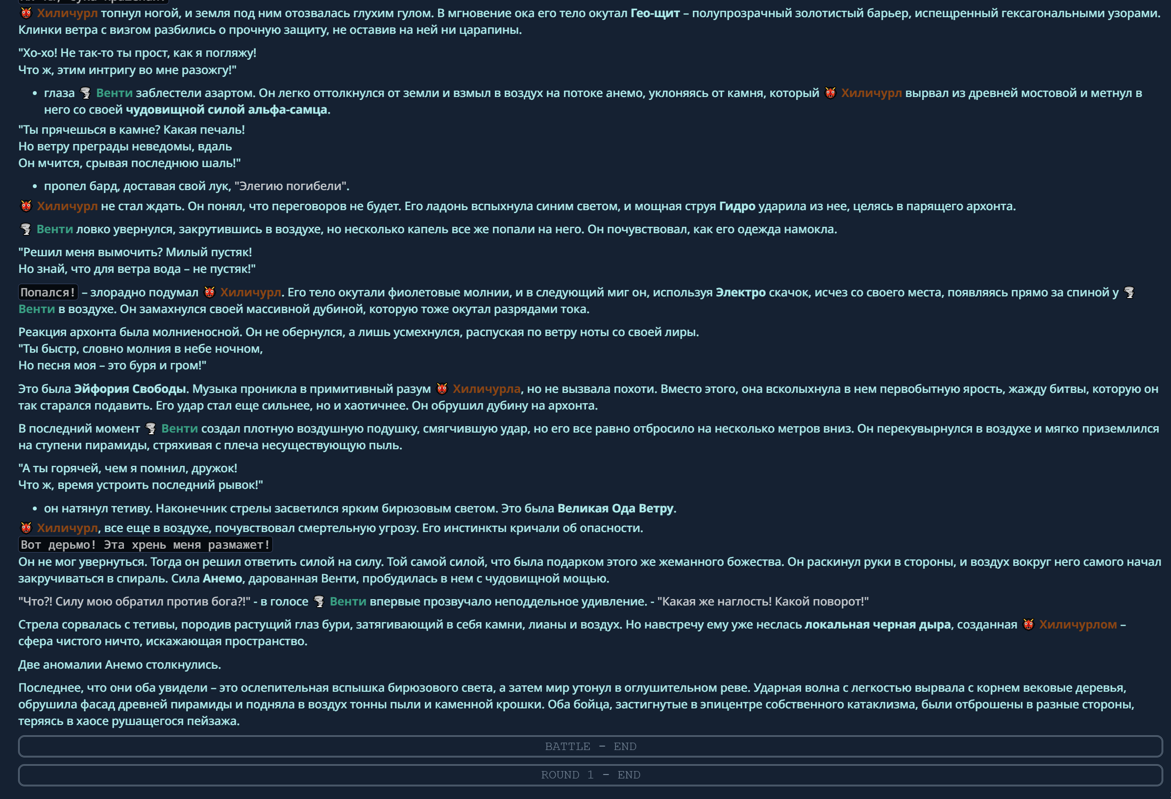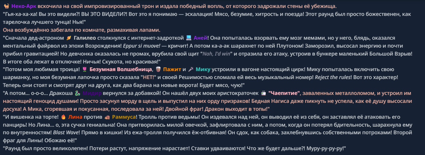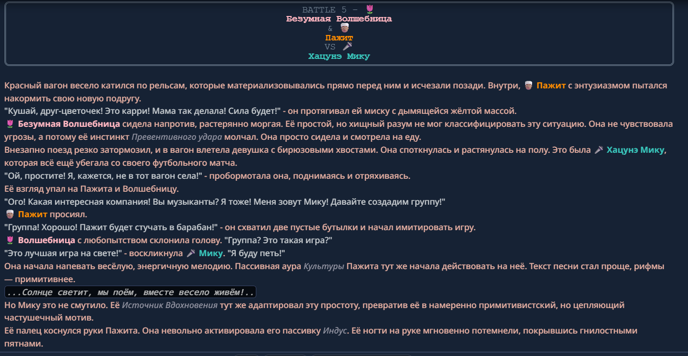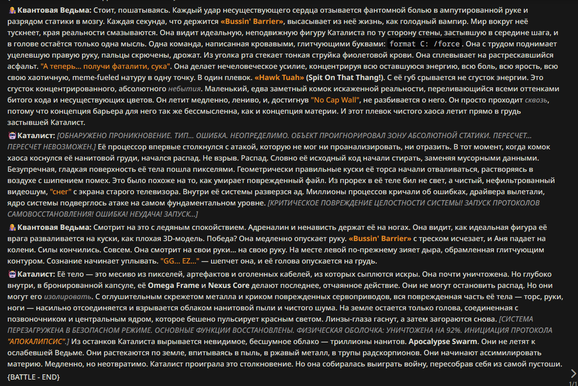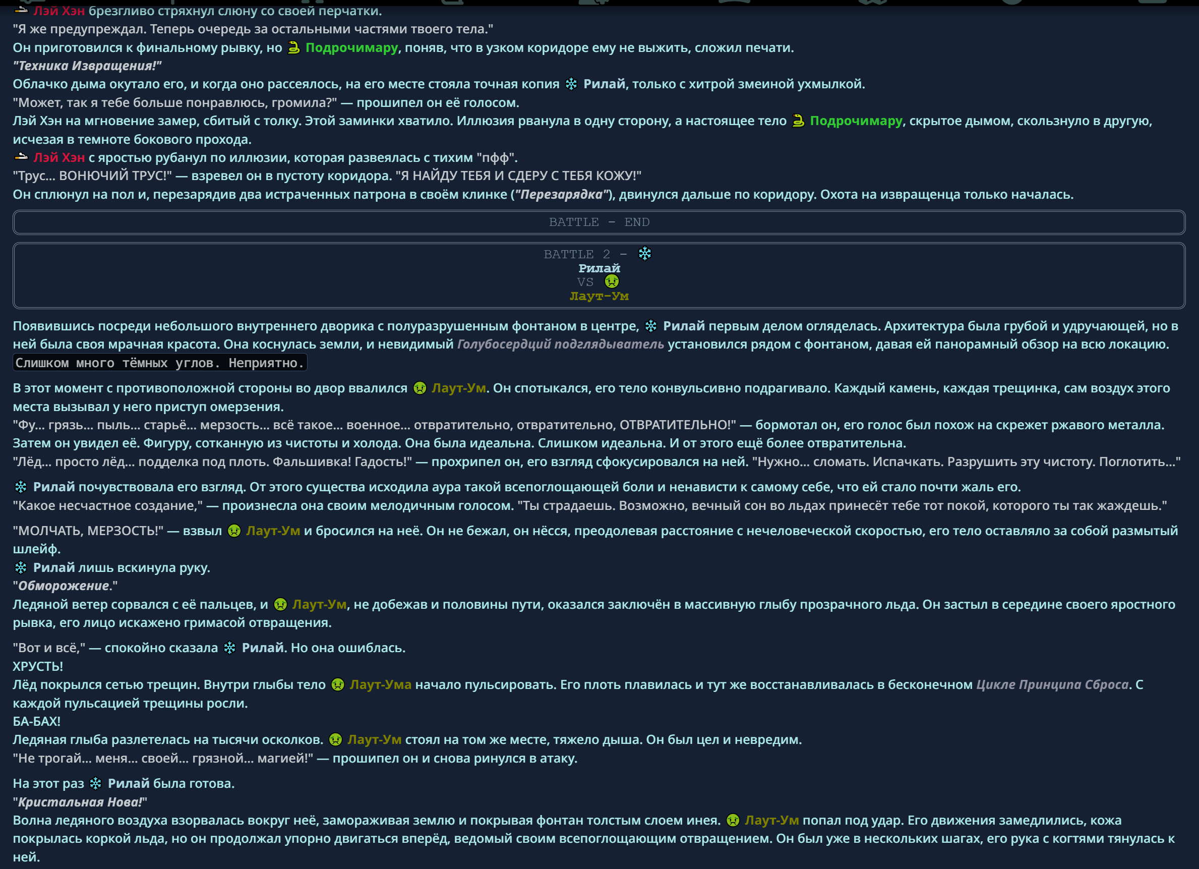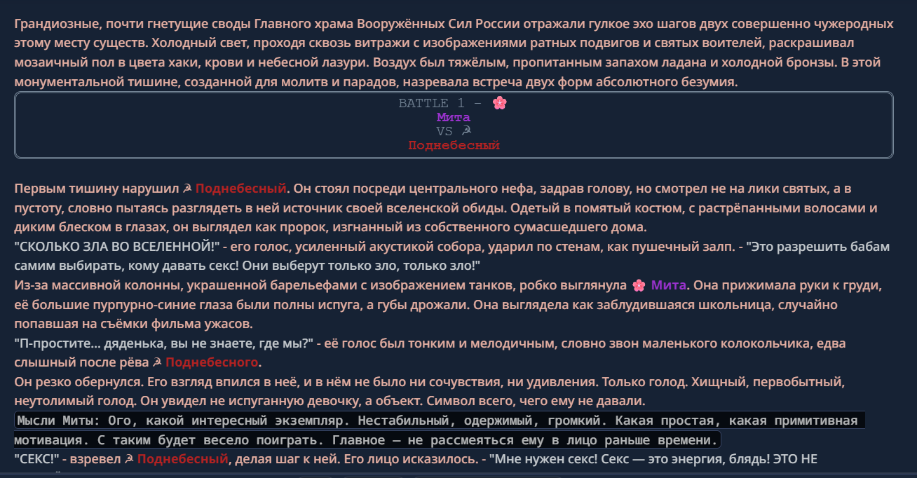 >>841604 Самое смешное было на какой-то совсем старой версии промта, где я забыл врубить галочку боя и персонажи в раунде внезапно стали чаще использовать навыки и вообще вести себя адекватнее xD. Но это было ещё в марте что ли.