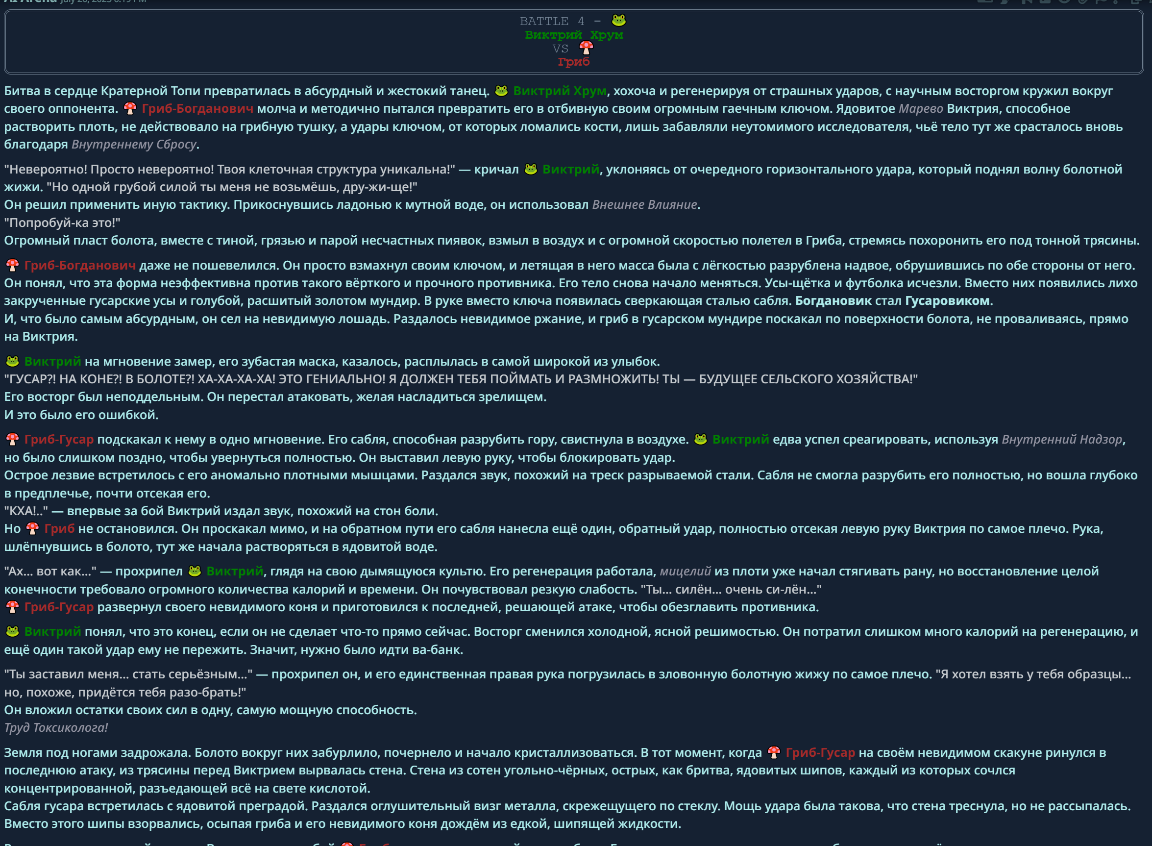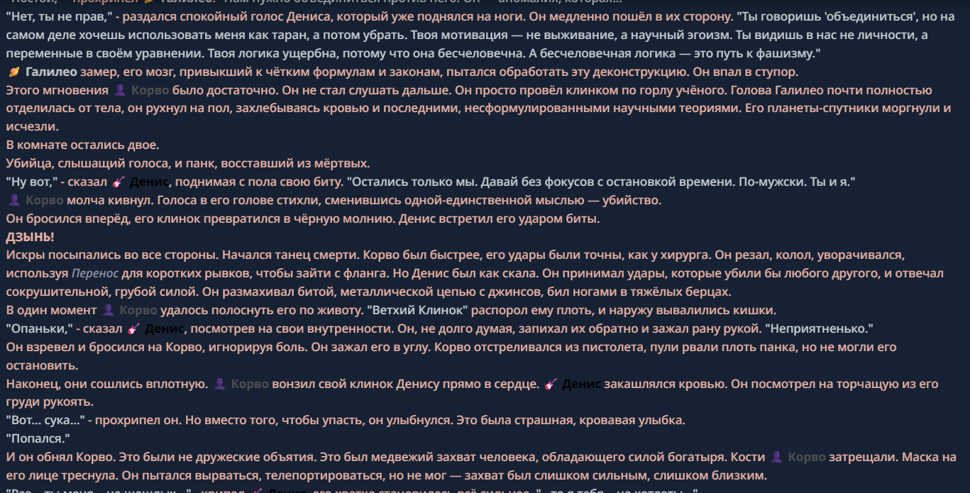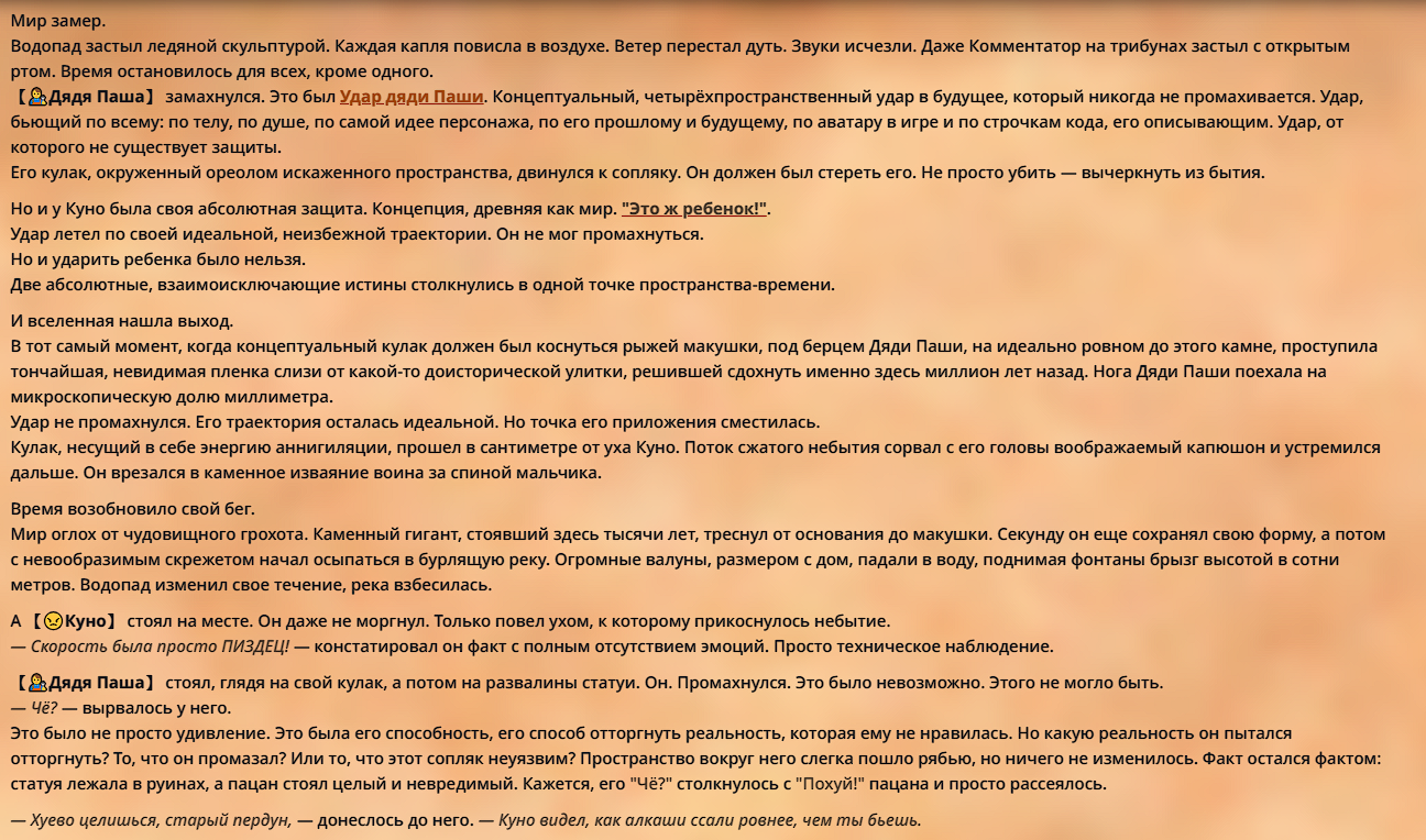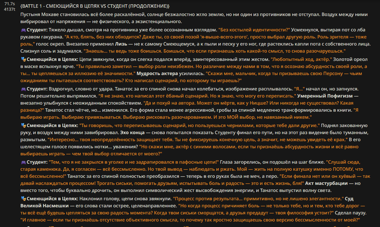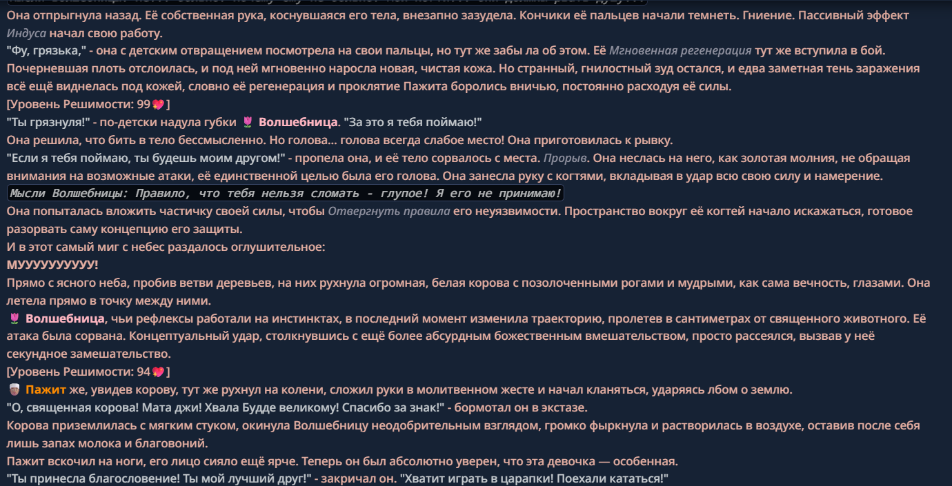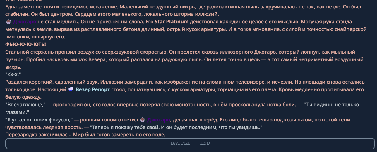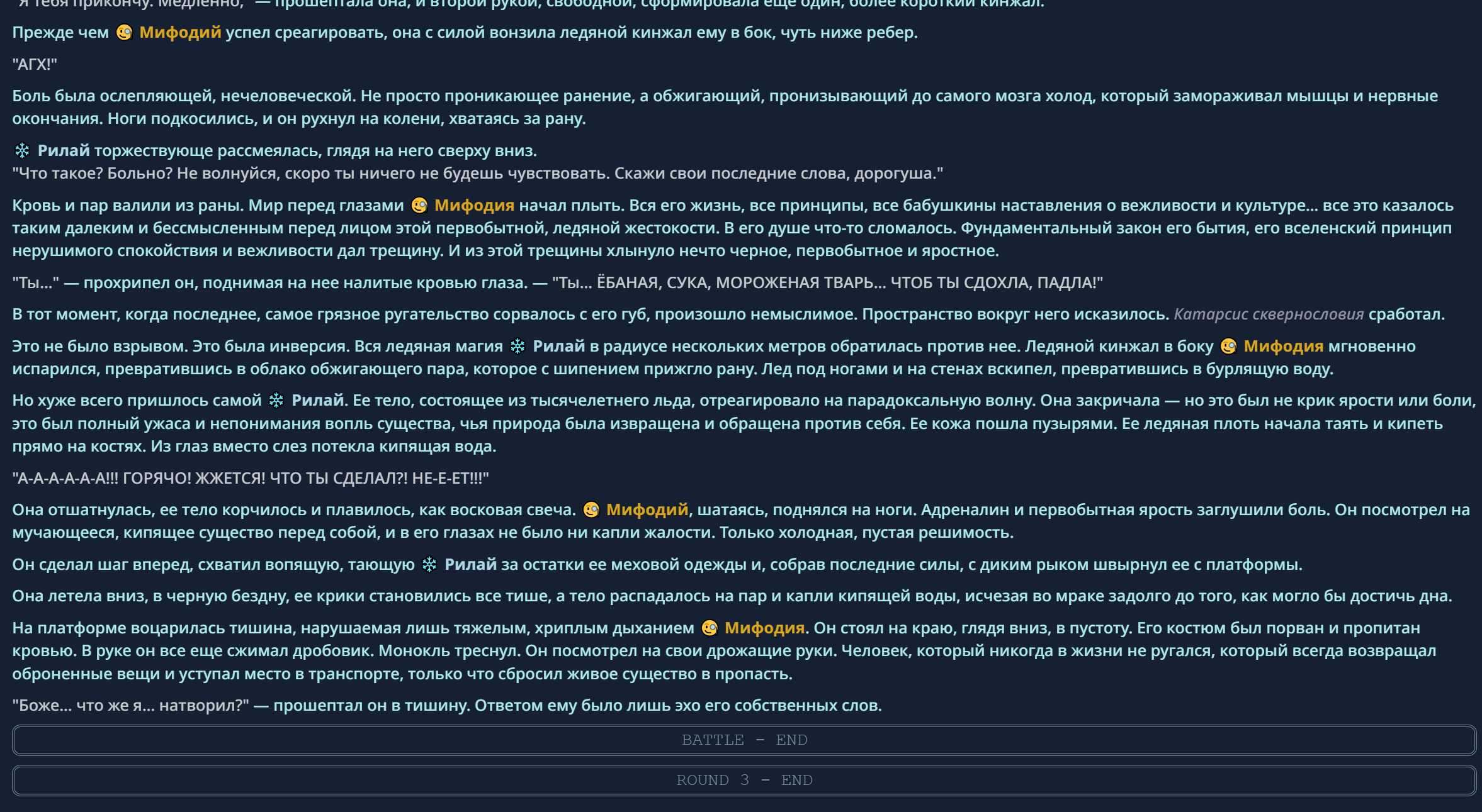 >>841604 Самое смешное было на какой-то совсем старой версии промта, где я забыл врубить галочку боя и персонажи в раунде внезапно стали чаще использовать навыки и вообще вести себя адекватнее xD. Но это было ещё в марте что ли.