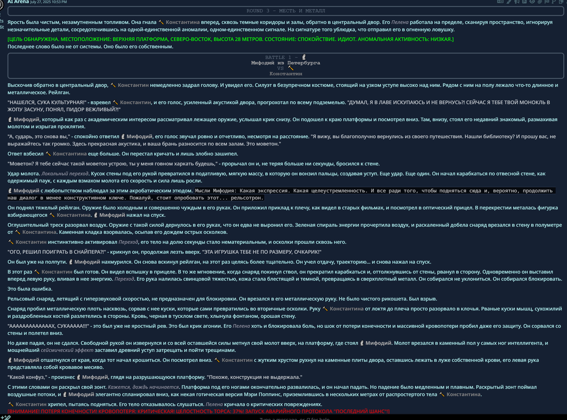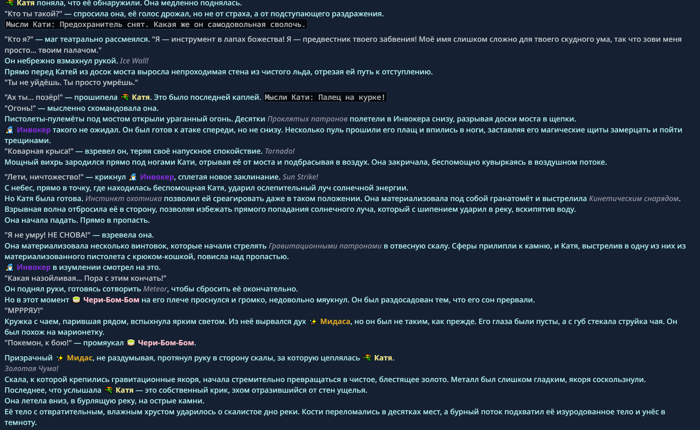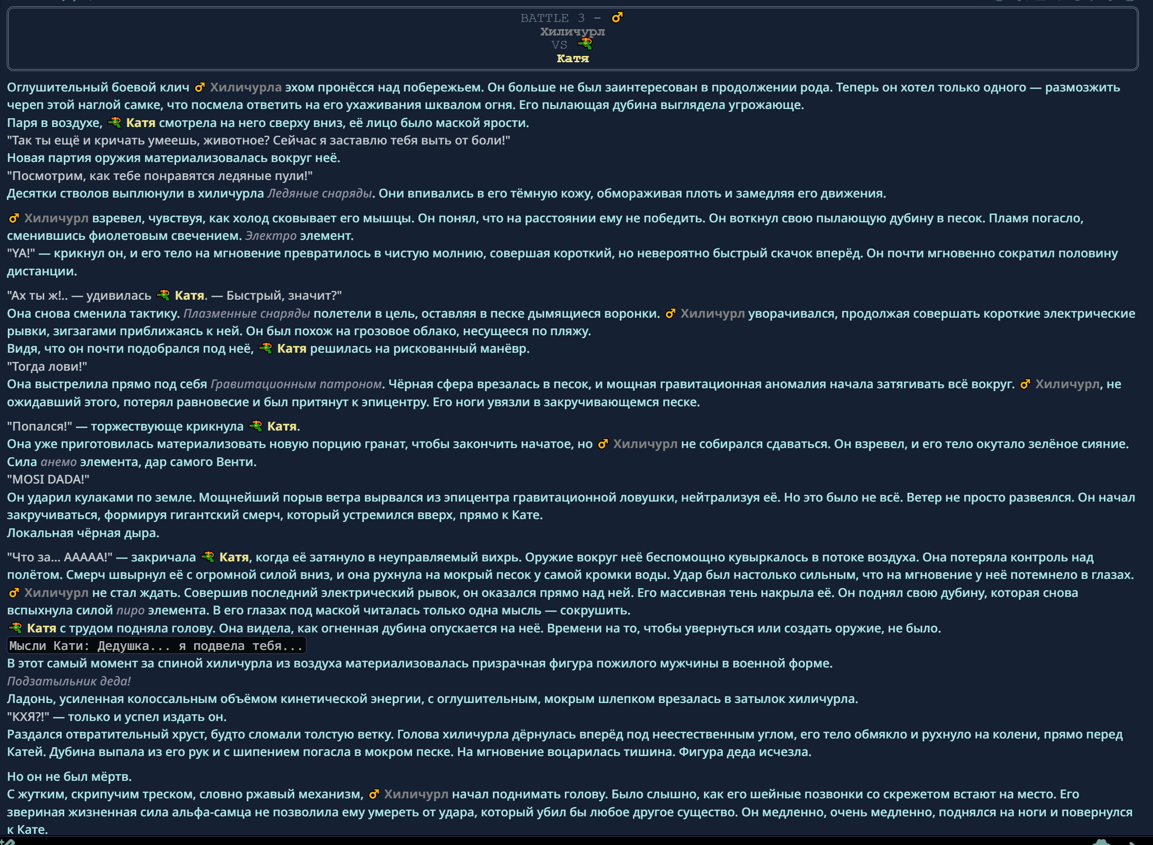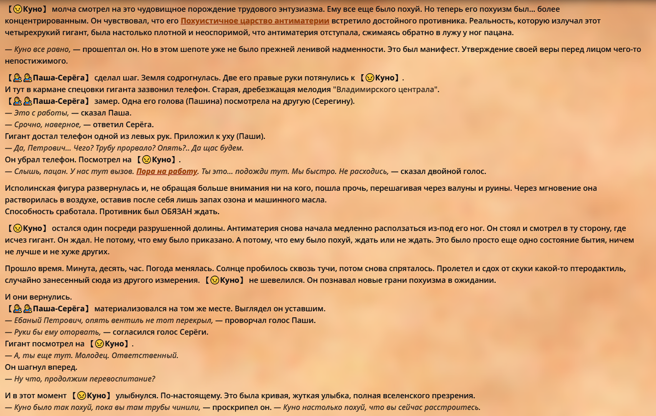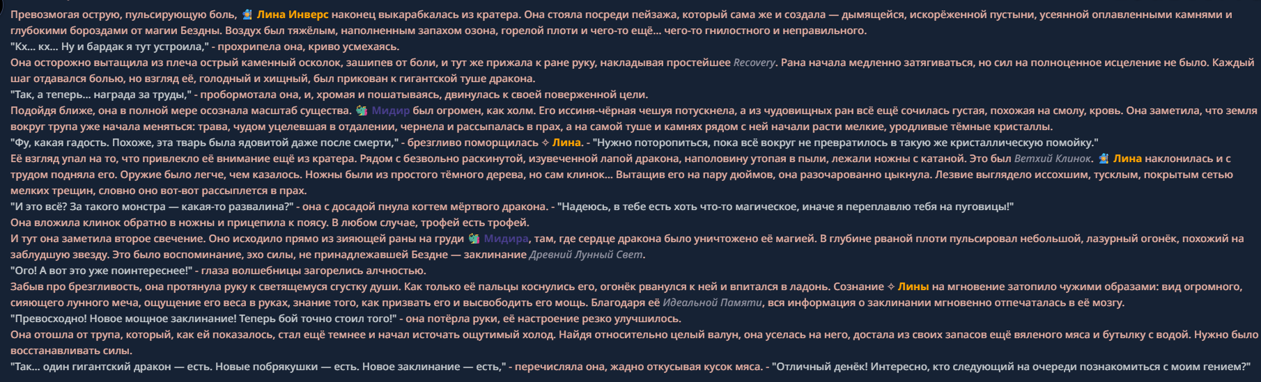 >>841604 Самое смешное было на какой-то совсем старой версии промта, где я забыл врубить галочку боя и персонажи в раунде внезапно стали чаще использовать навыки и вообще вести себя адекватнее xD. Но это было ещё в марте что ли.