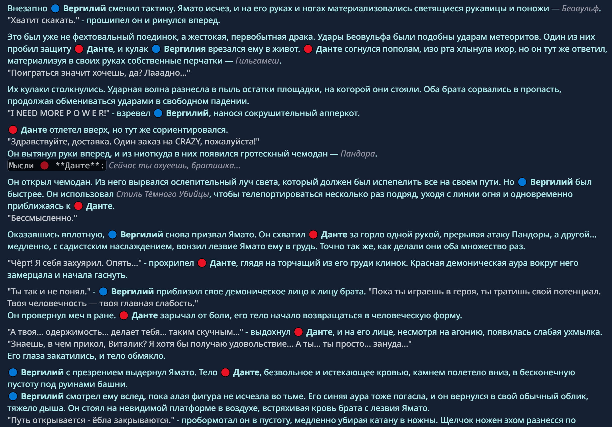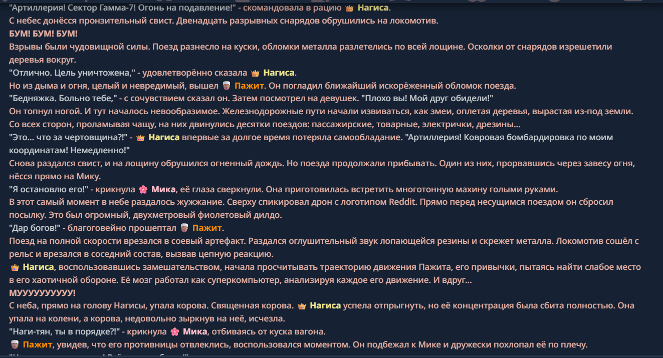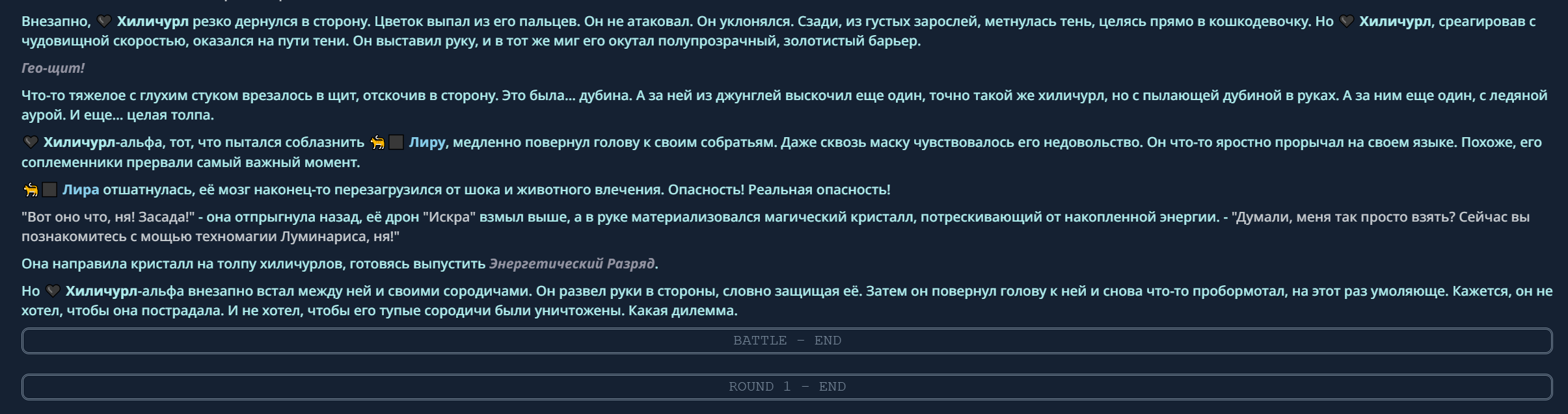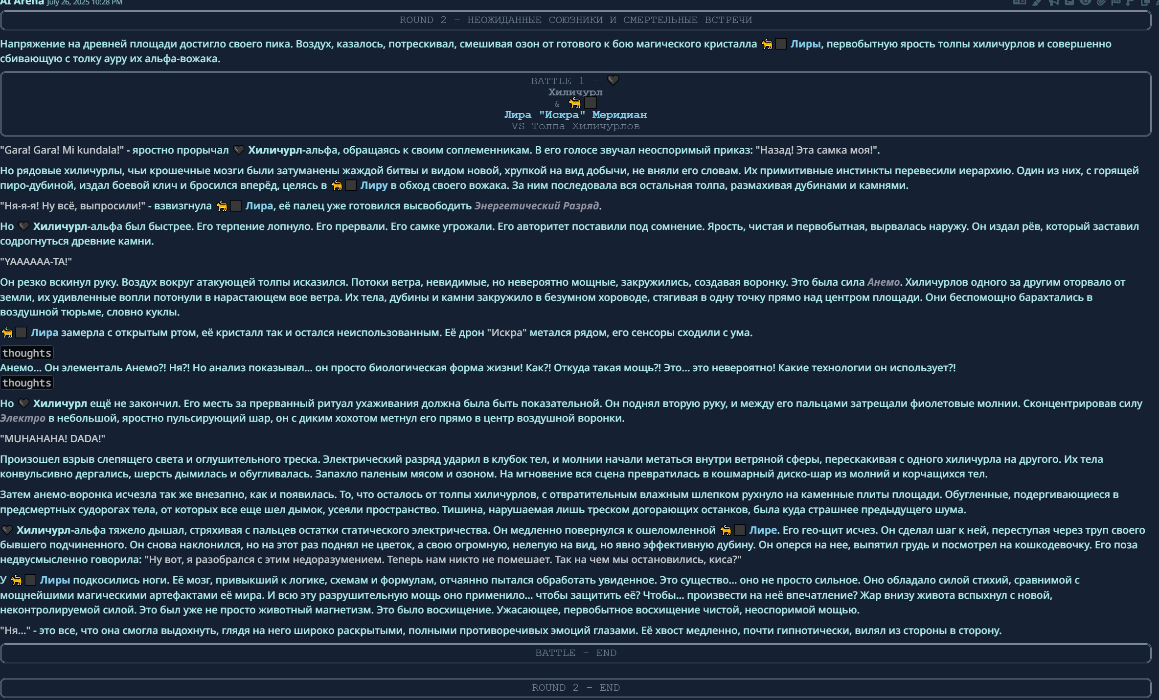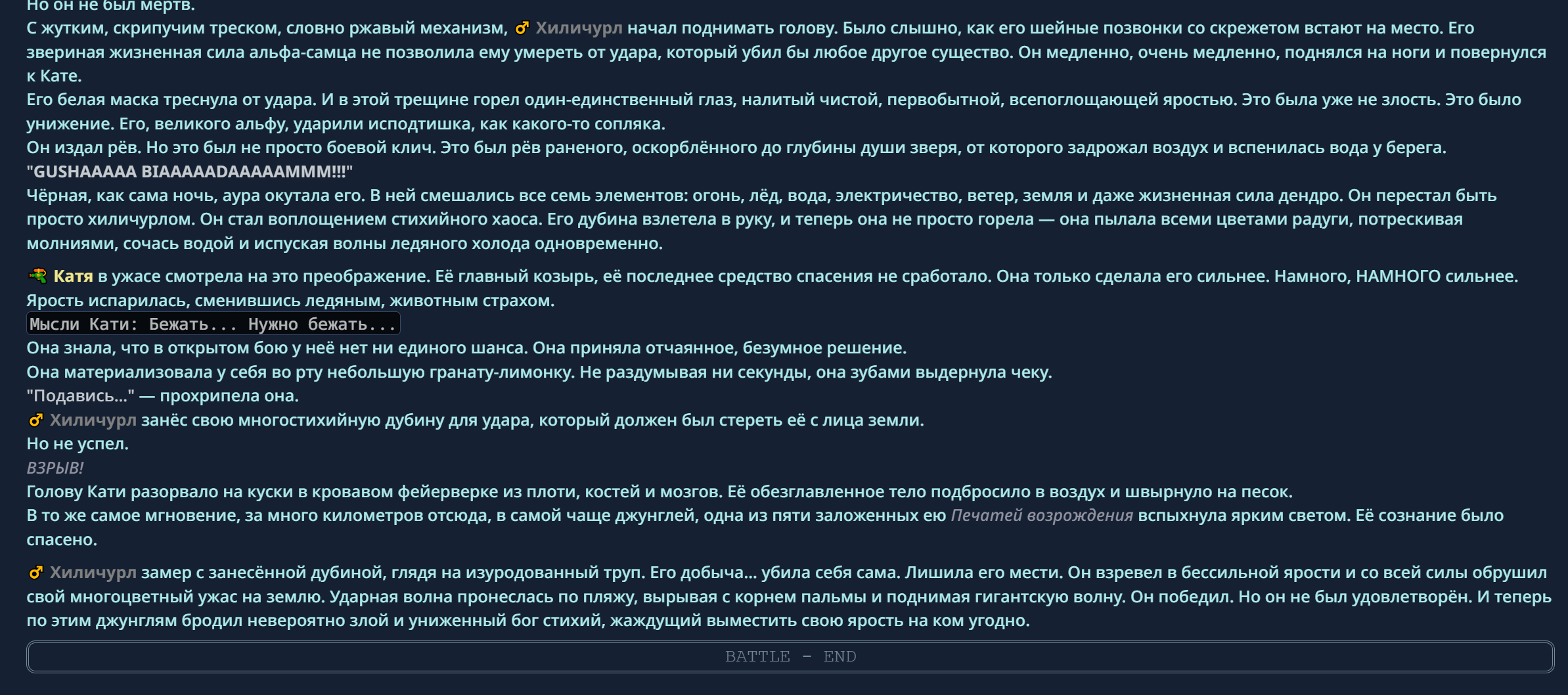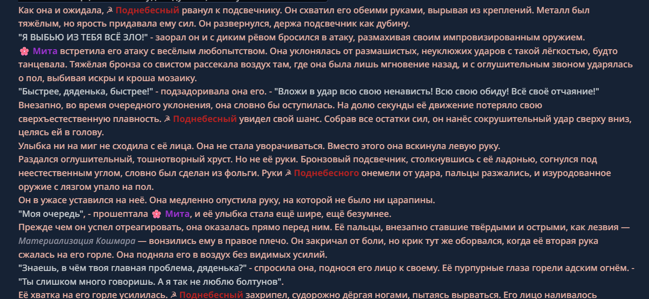 >>841604 Самое смешное было на какой-то совсем старой версии промта, где я забыл врубить галочку боя и персонажи в раунде внезапно стали чаще использовать навыки и вообще вести себя адекватнее xD. Но это было ещё в марте что ли.