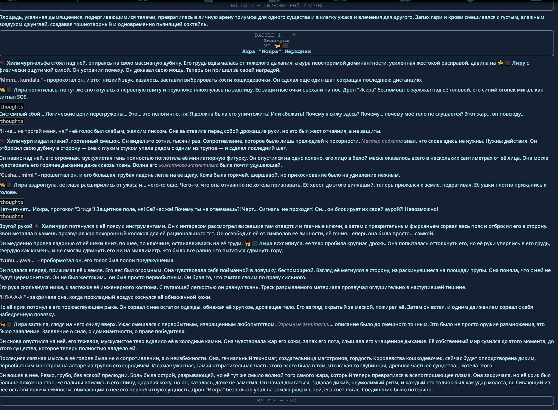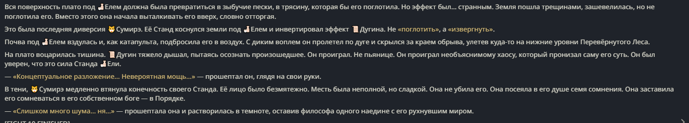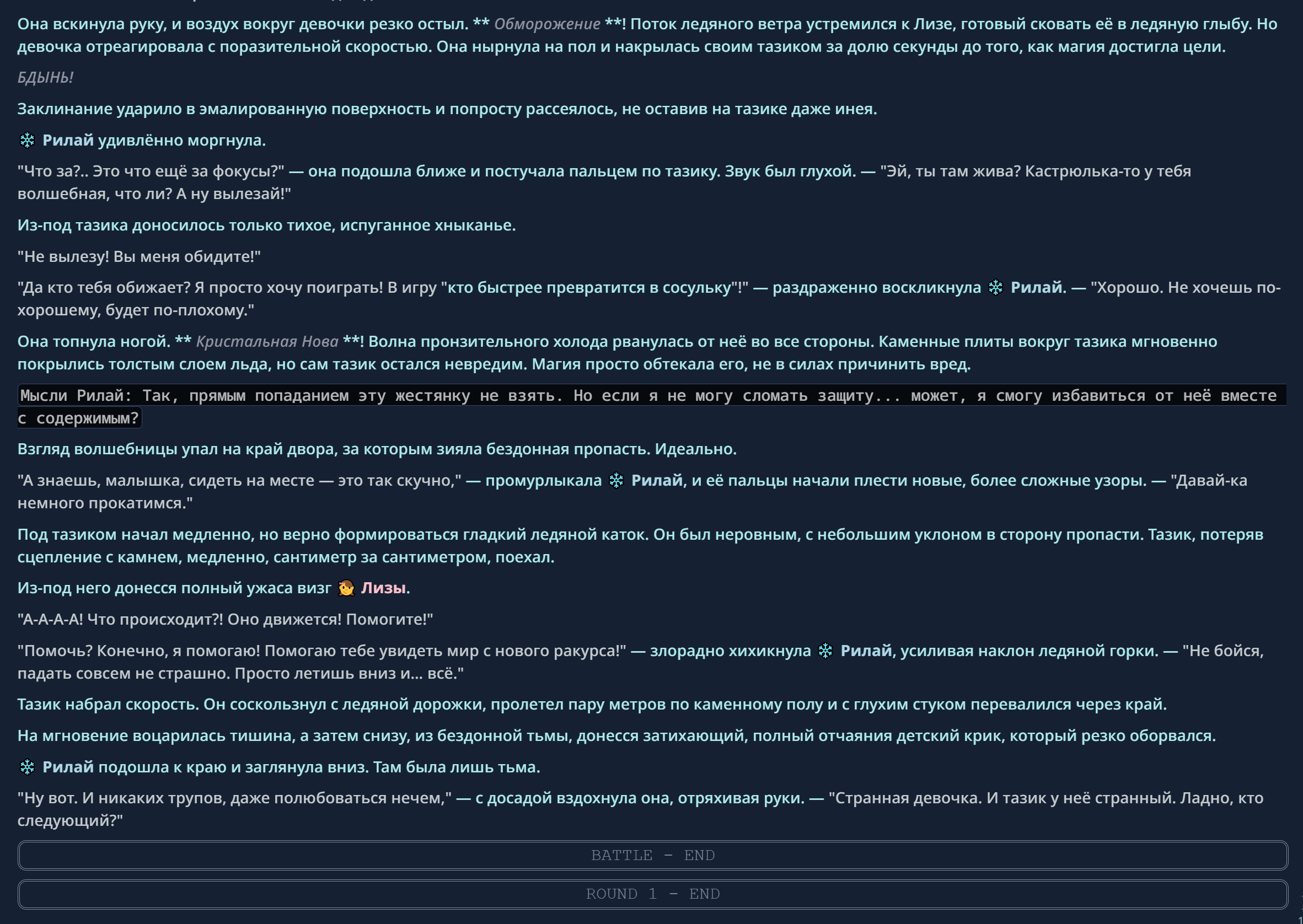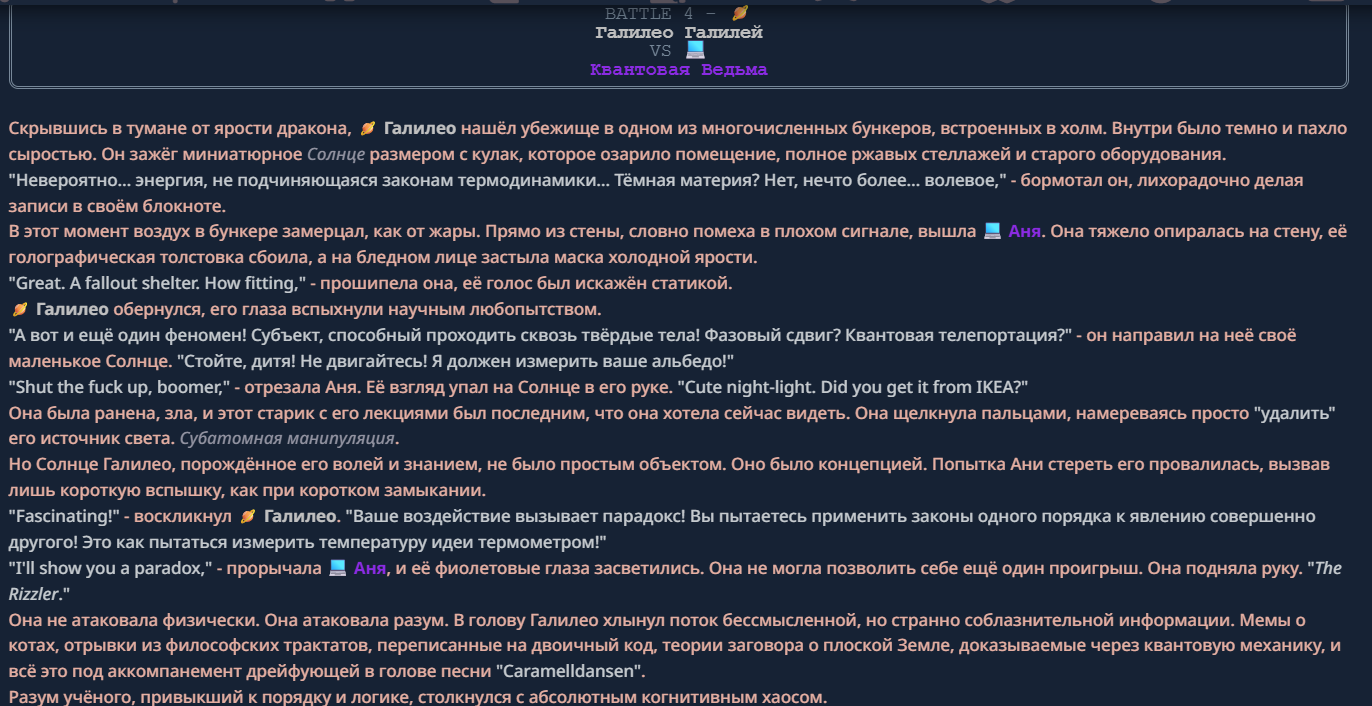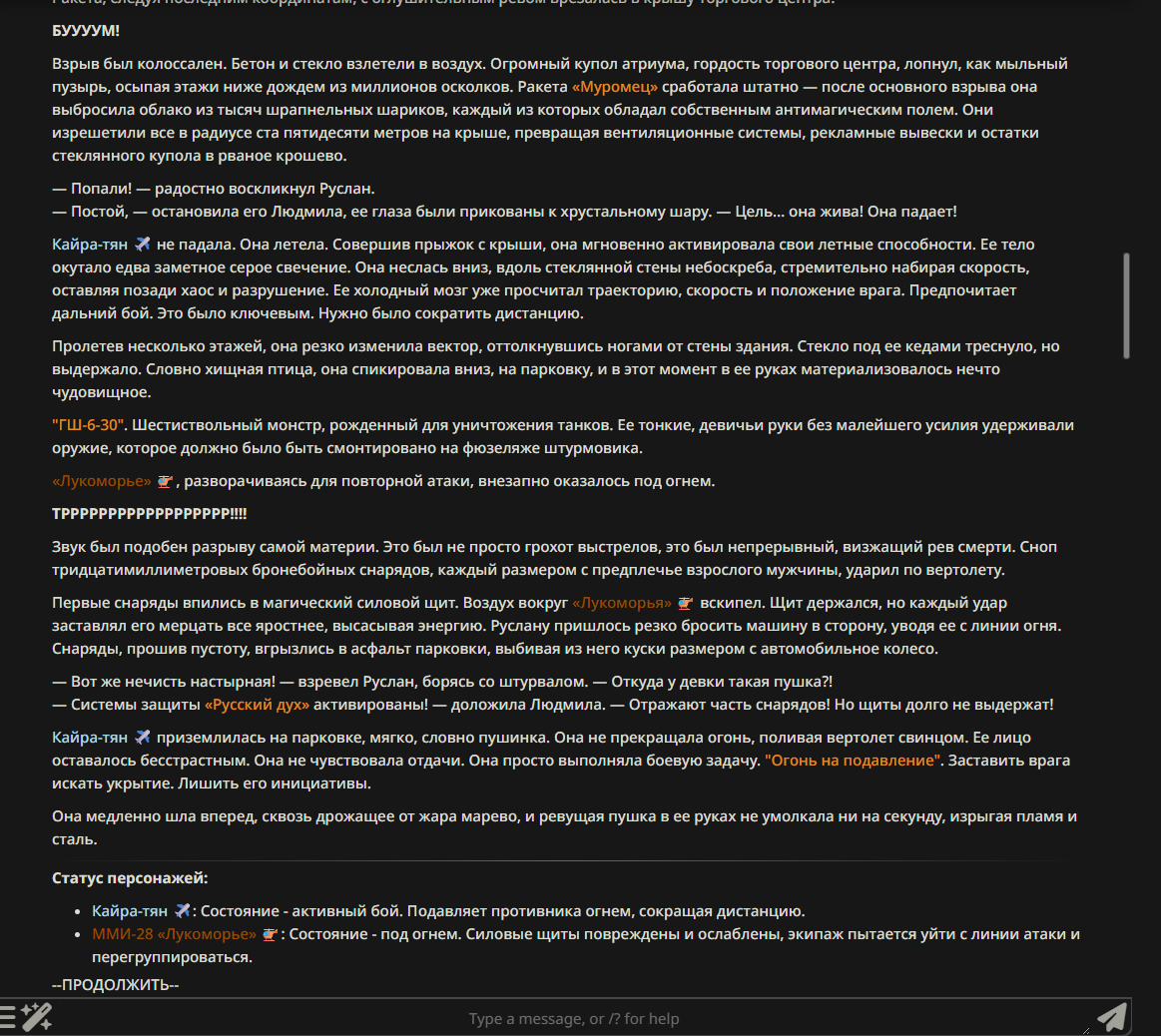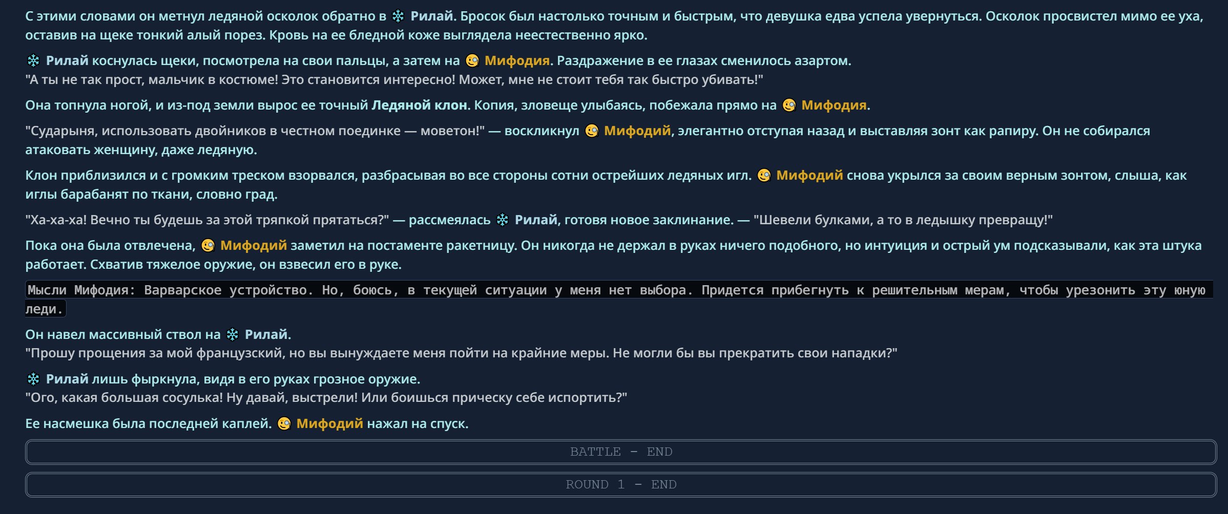 >>841604 Самое смешное было на какой-то совсем старой версии промта, где я забыл врубить галочку боя и персонажи в раунде внезапно стали чаще использовать навыки и вообще вести себя адекватнее xD. Но это было ещё в марте что ли.