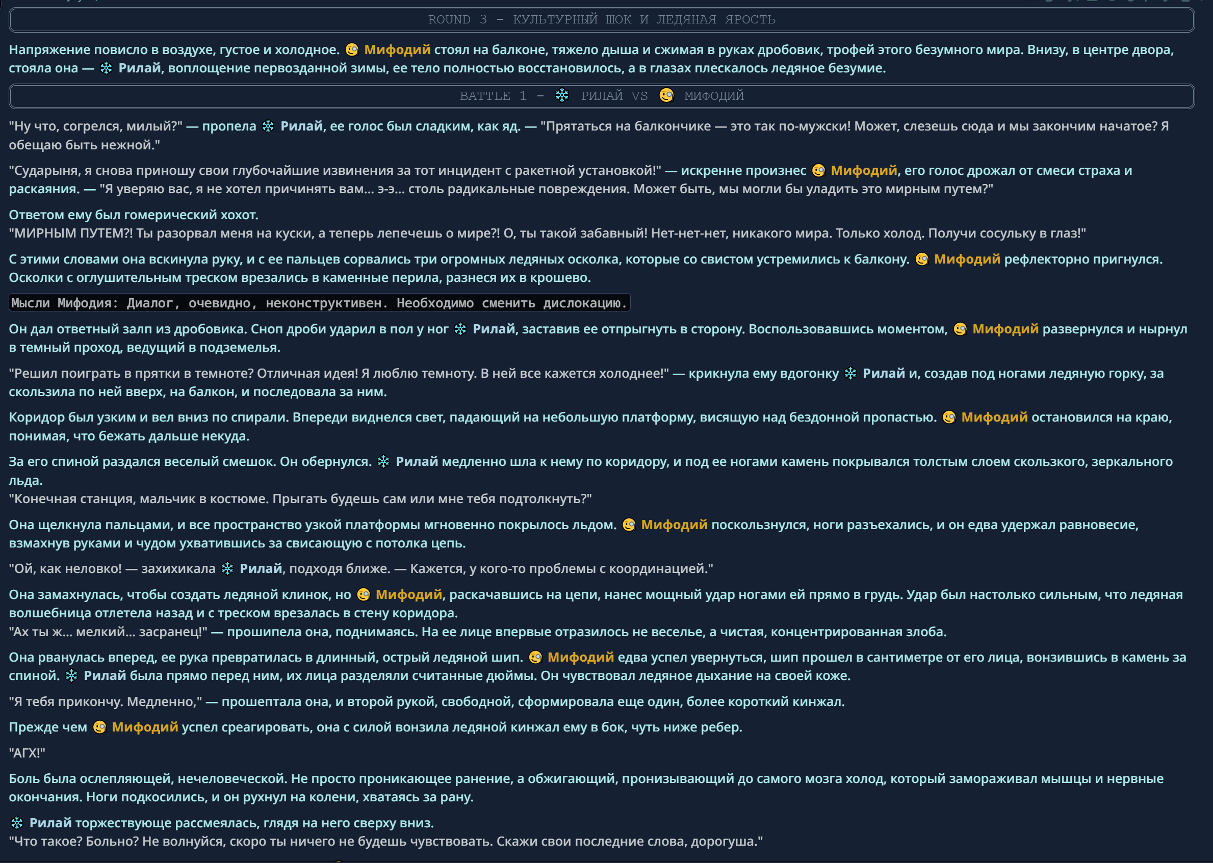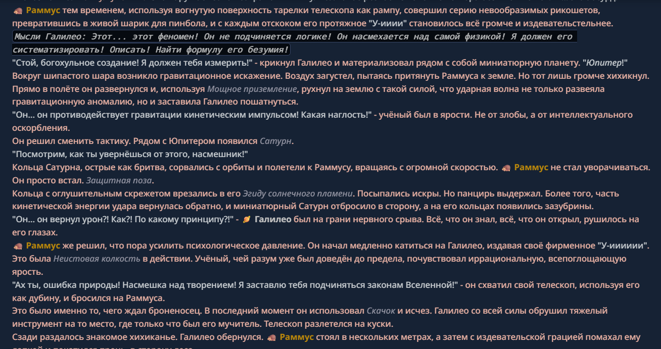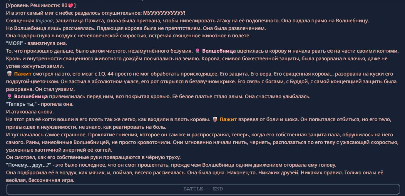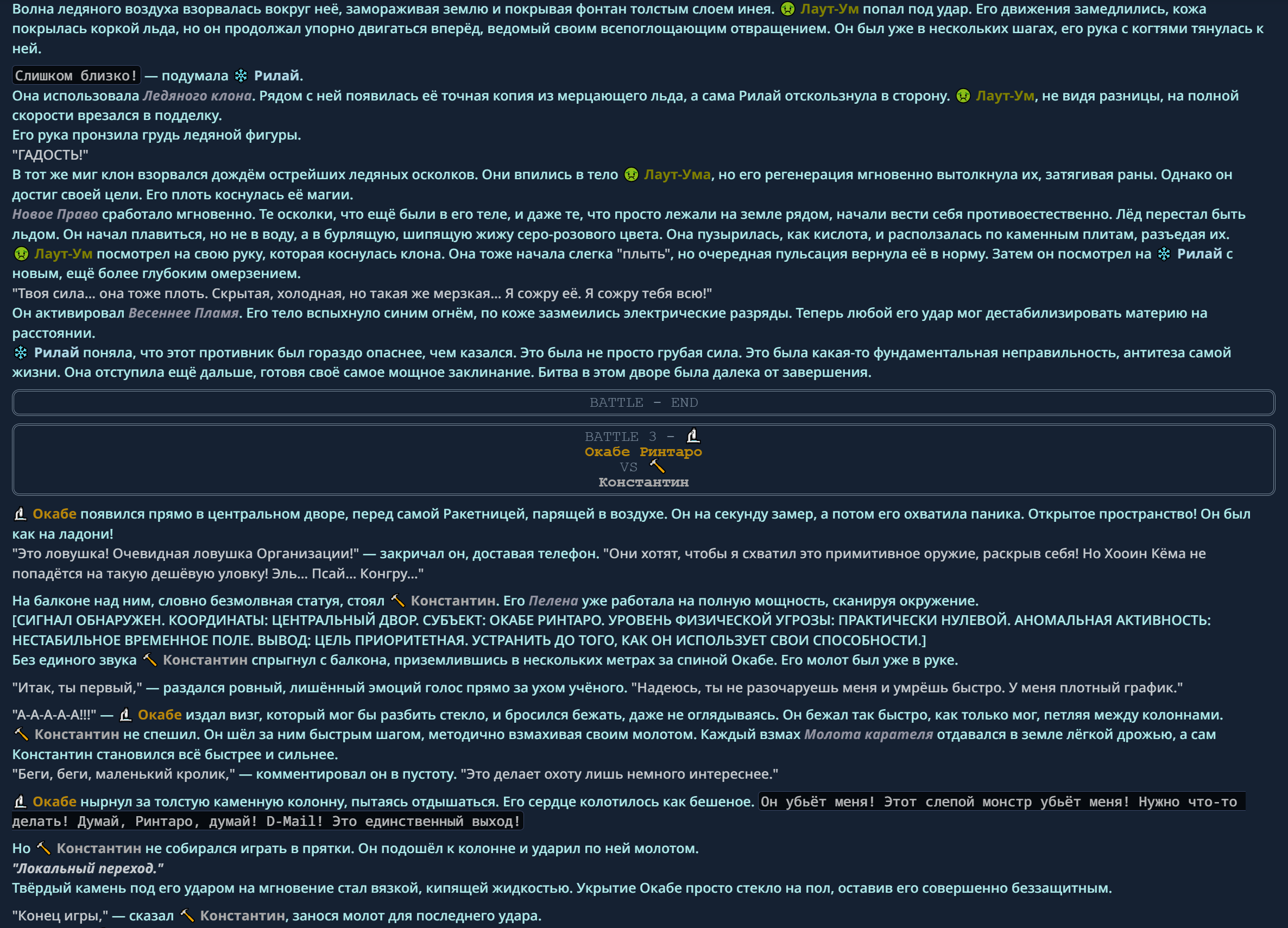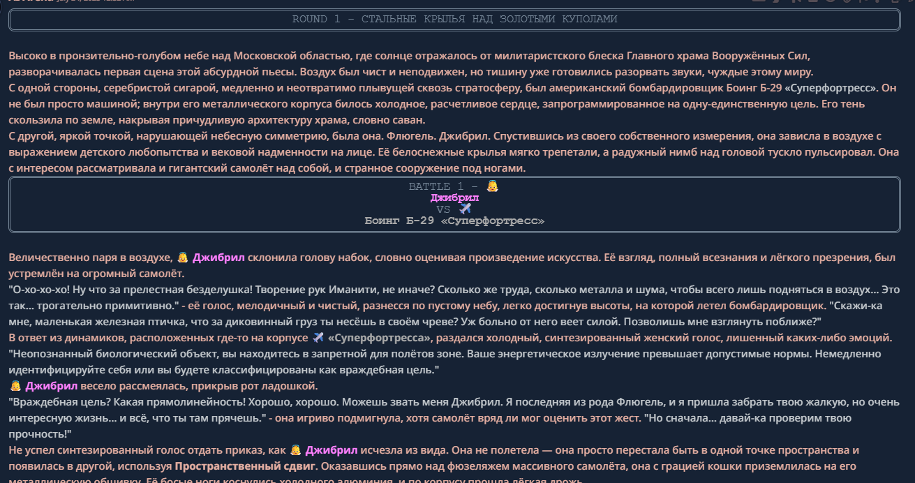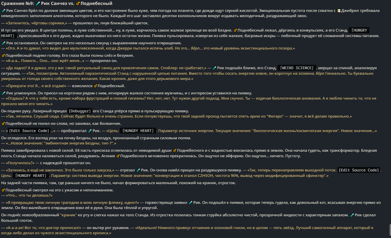 >>841604 Самое смешное было на какой-то совсем старой версии промта, где я забыл врубить галочку боя и персонажи в раунде внезапно стали чаще использовать навыки и вообще вести себя адекватнее xD. Но это было ещё в марте что ли.