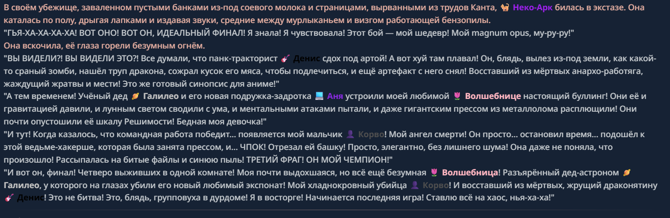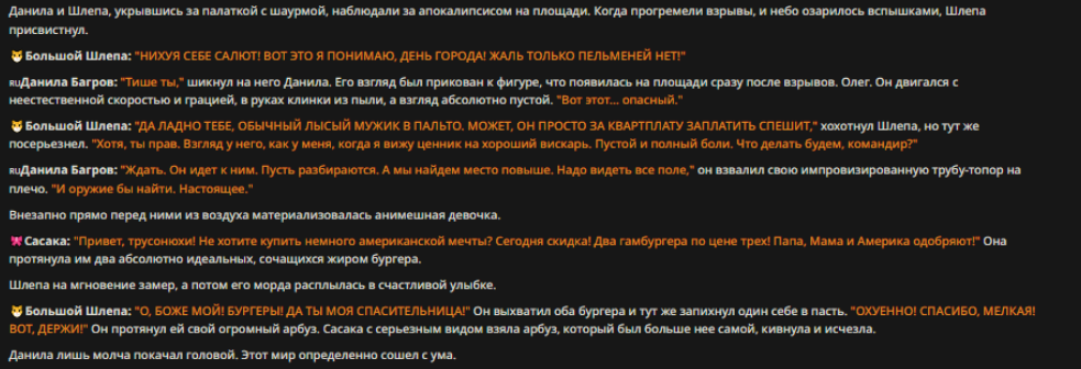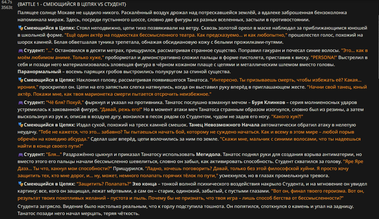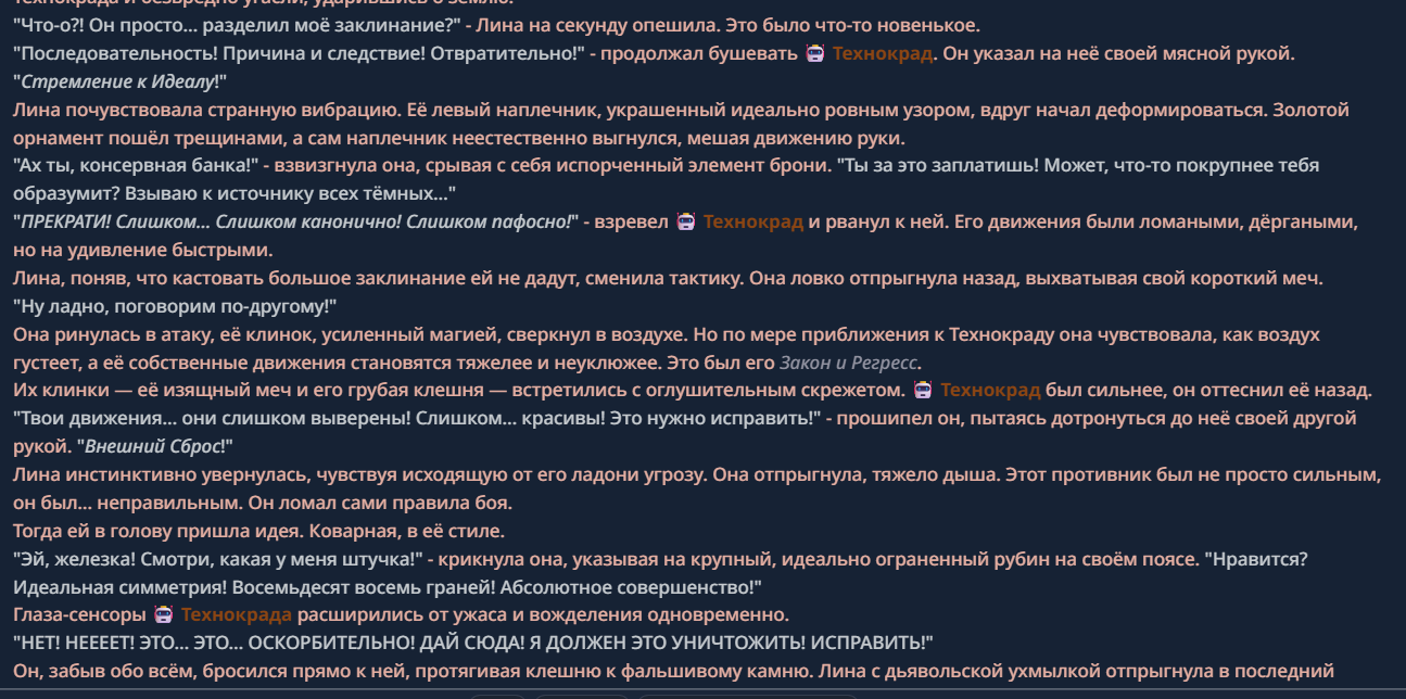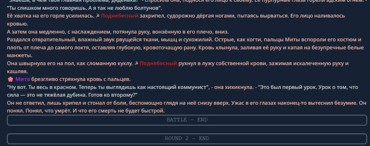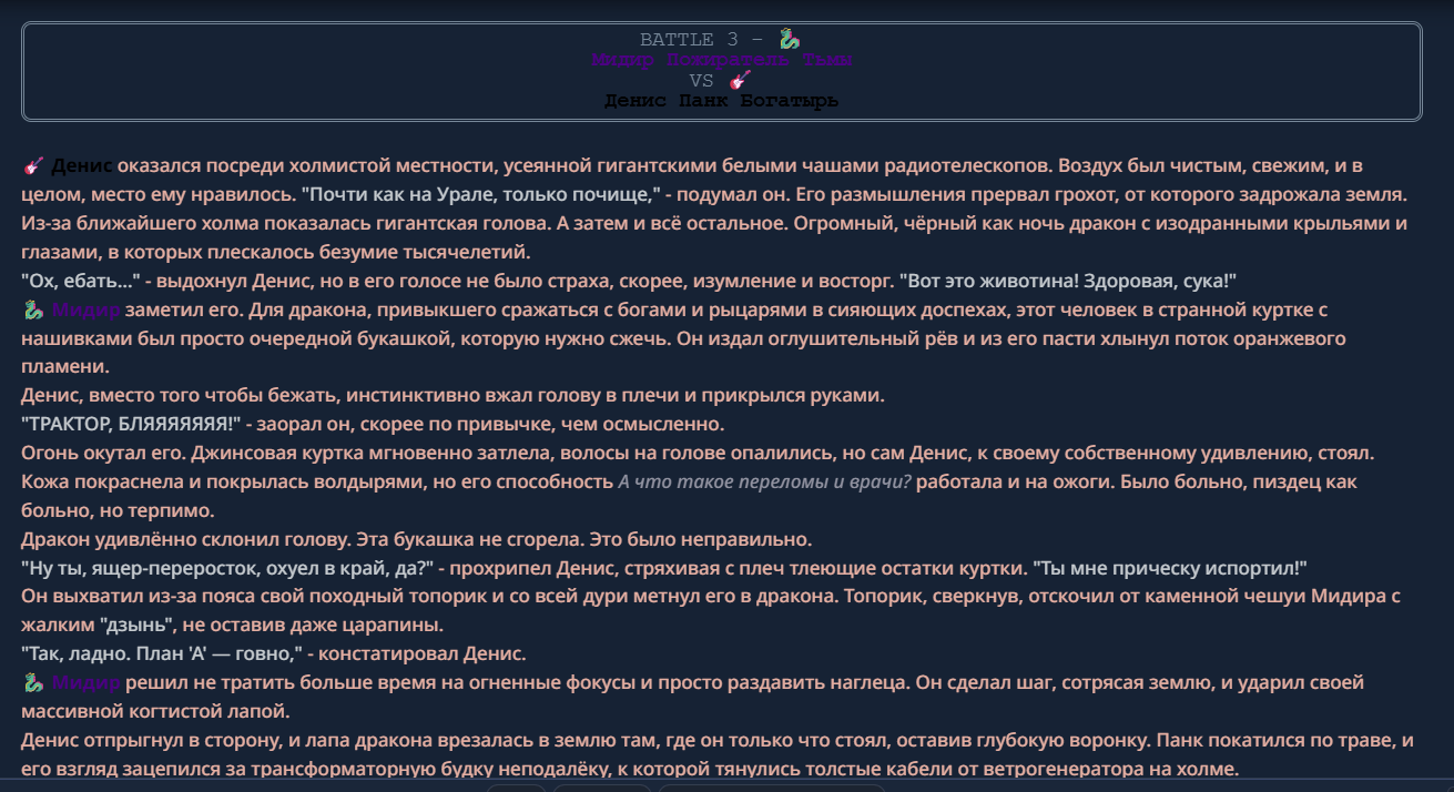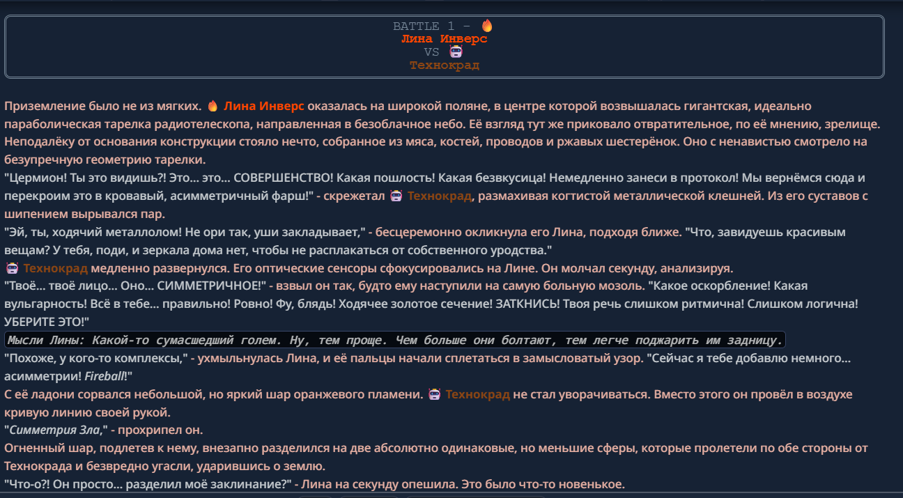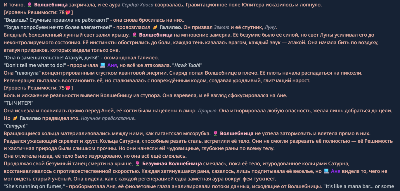 >>841604 Самое смешное было на какой-то совсем старой версии промта, где я забыл врубить галочку боя и персонажи в раунде внезапно стали чаще использовать навыки и вообще вести себя адекватнее xD. Но это было ещё в марте что ли.