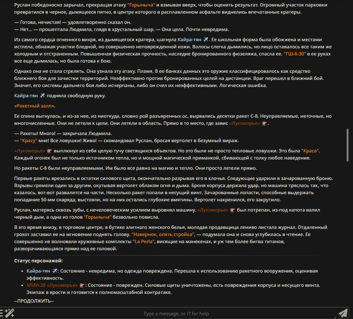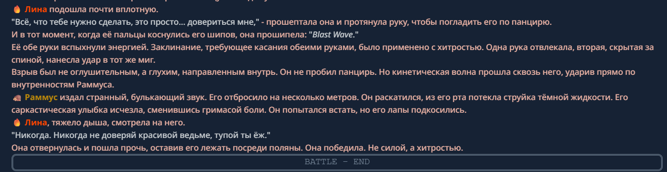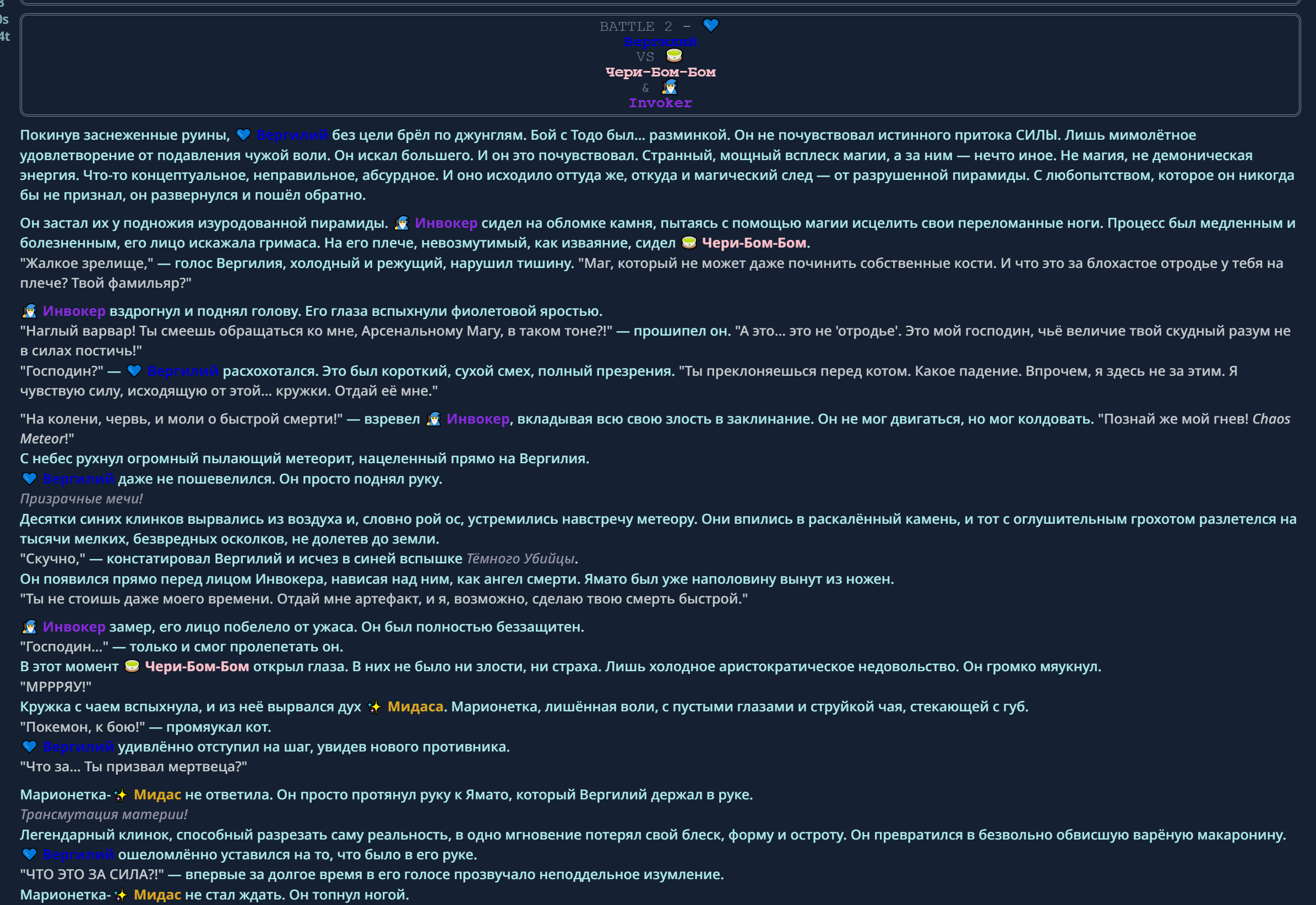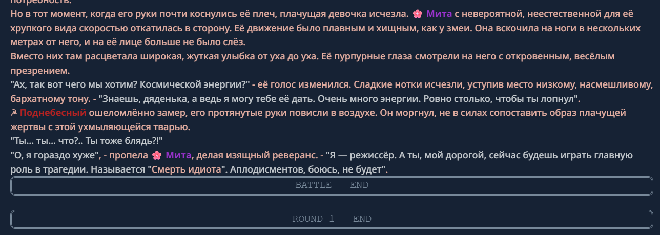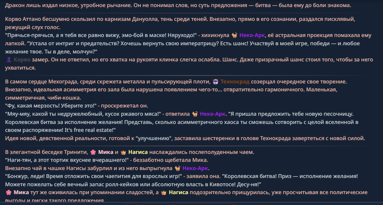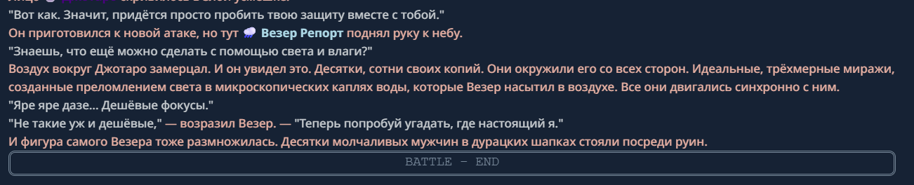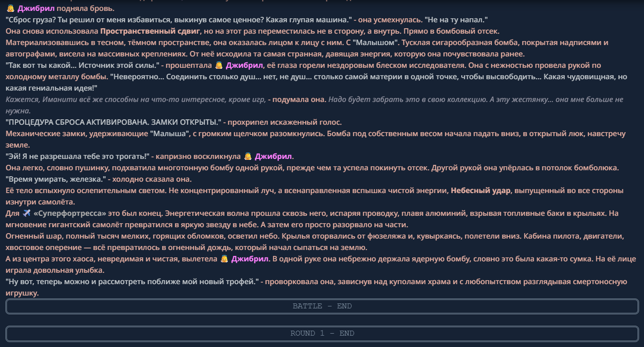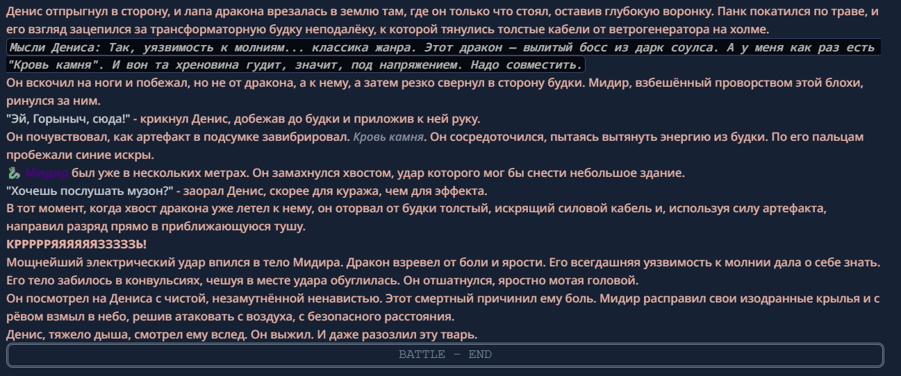 >>841604 Самое смешное было на какой-то совсем старой версии промта, где я забыл врубить галочку боя и персонажи в раунде внезапно стали чаще использовать навыки и вообще вести себя адекватнее xD. Но это было ещё в марте что ли.