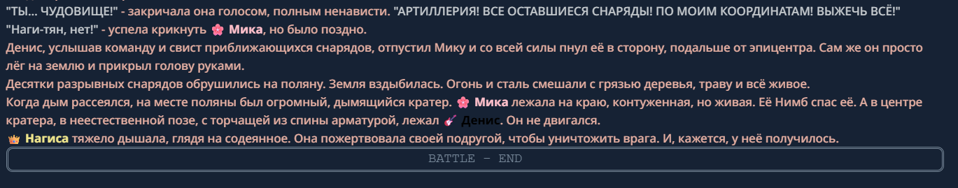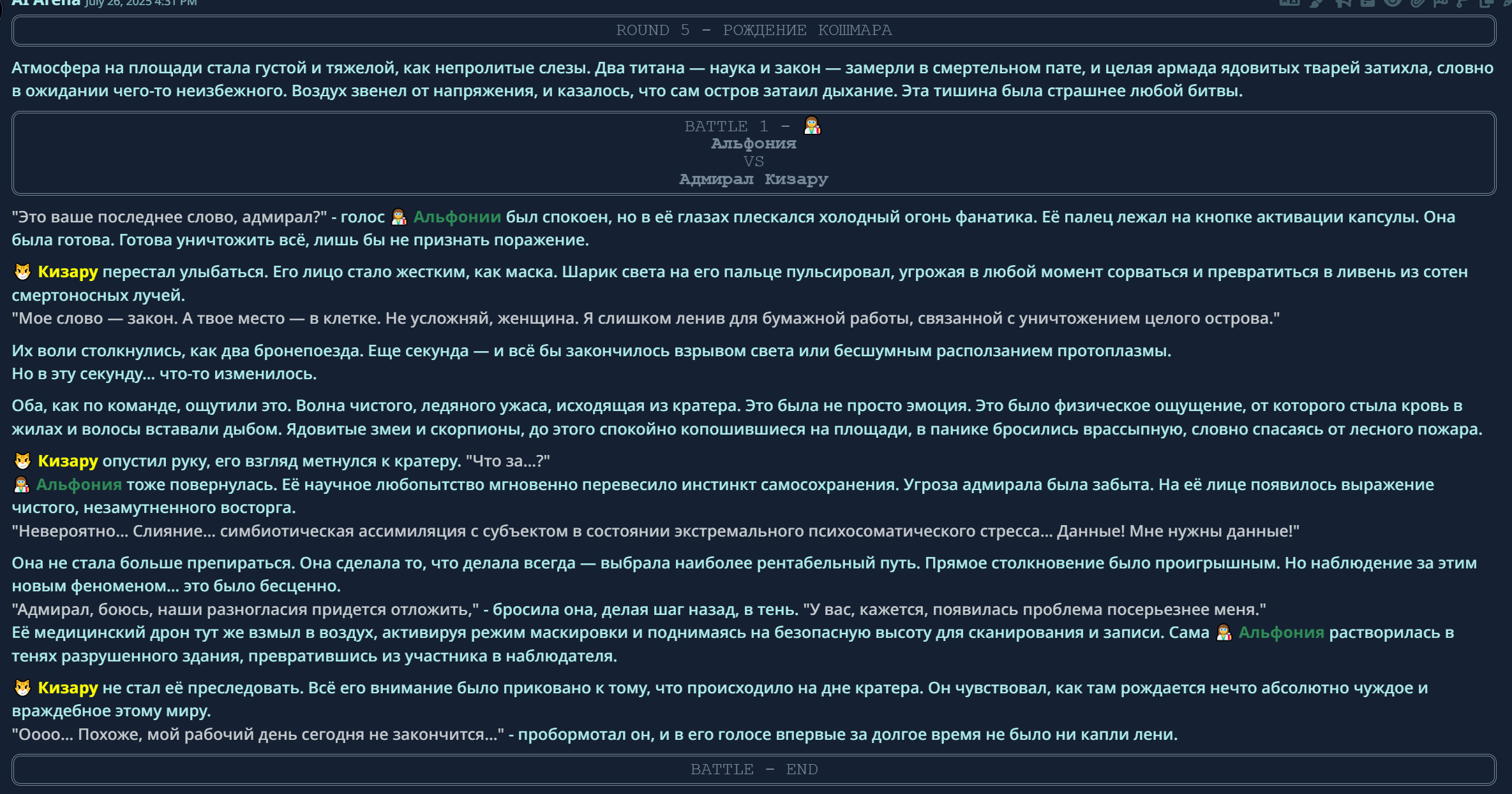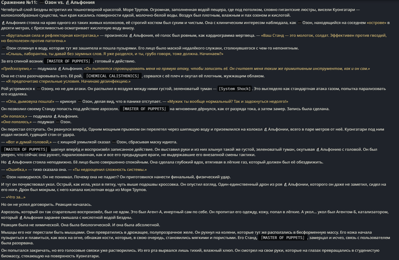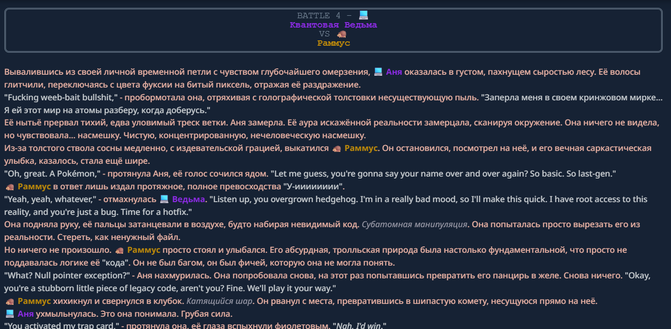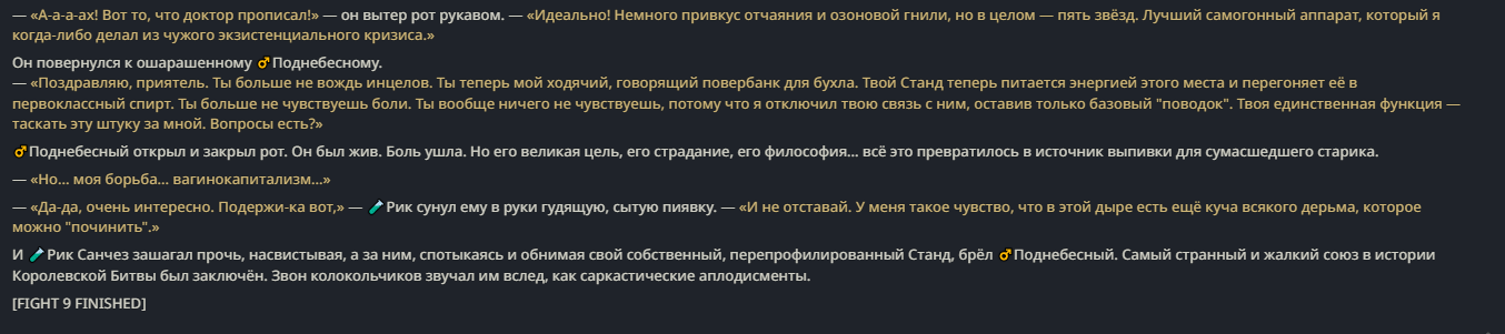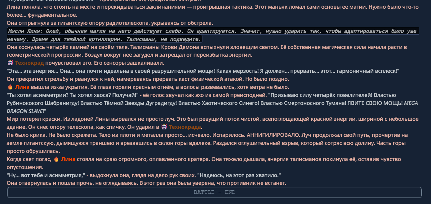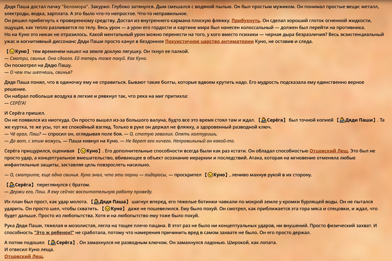 >>841604 Самое смешное было на какой-то совсем старой версии промта, где я забыл врубить галочку боя и персонажи в раунде внезапно стали чаще использовать навыки и вообще вести себя адекватнее xD. Но это было ещё в марте что ли.