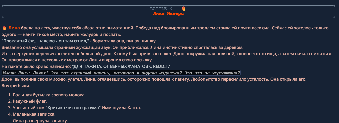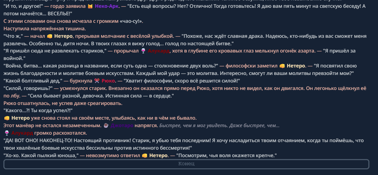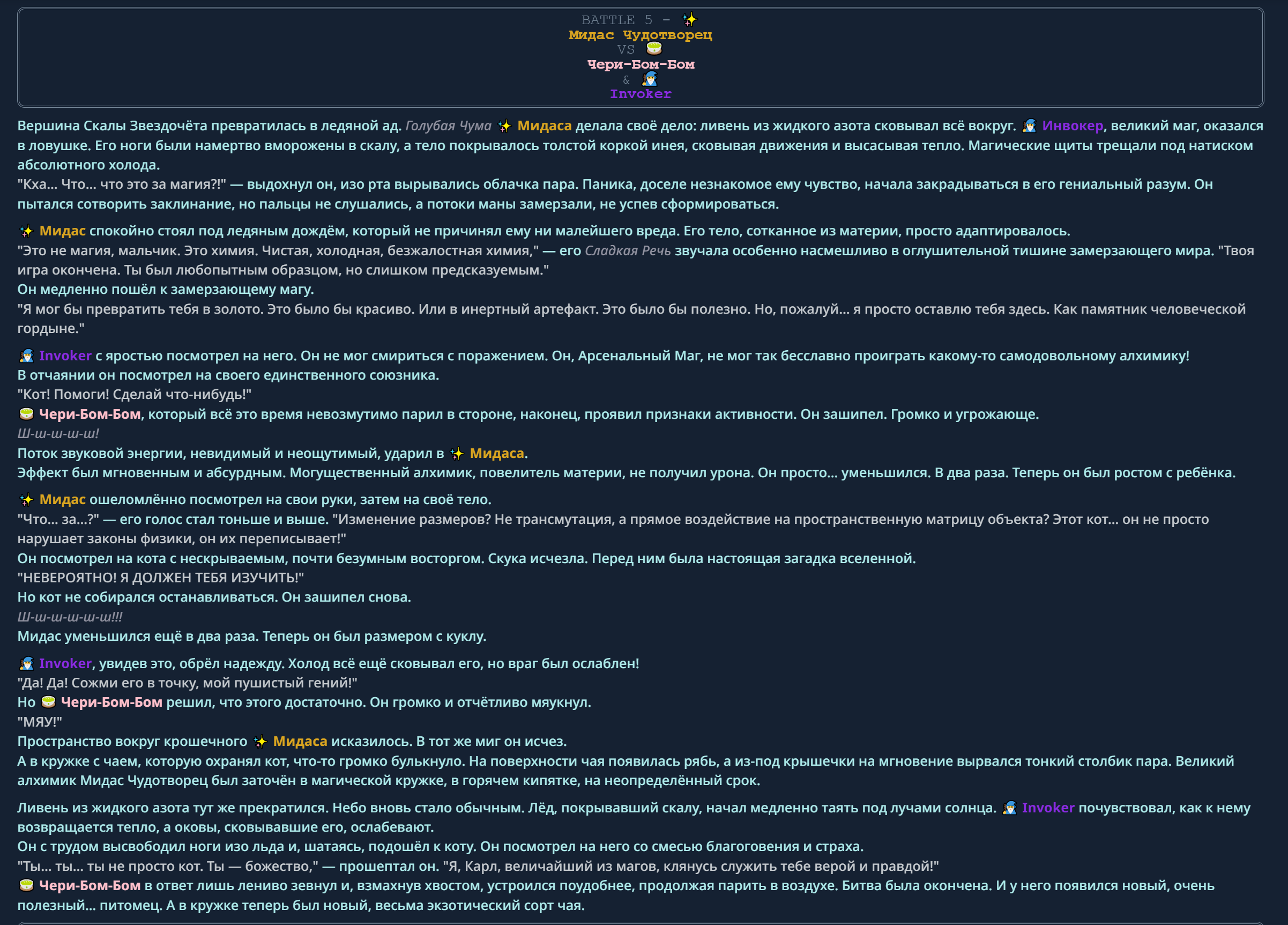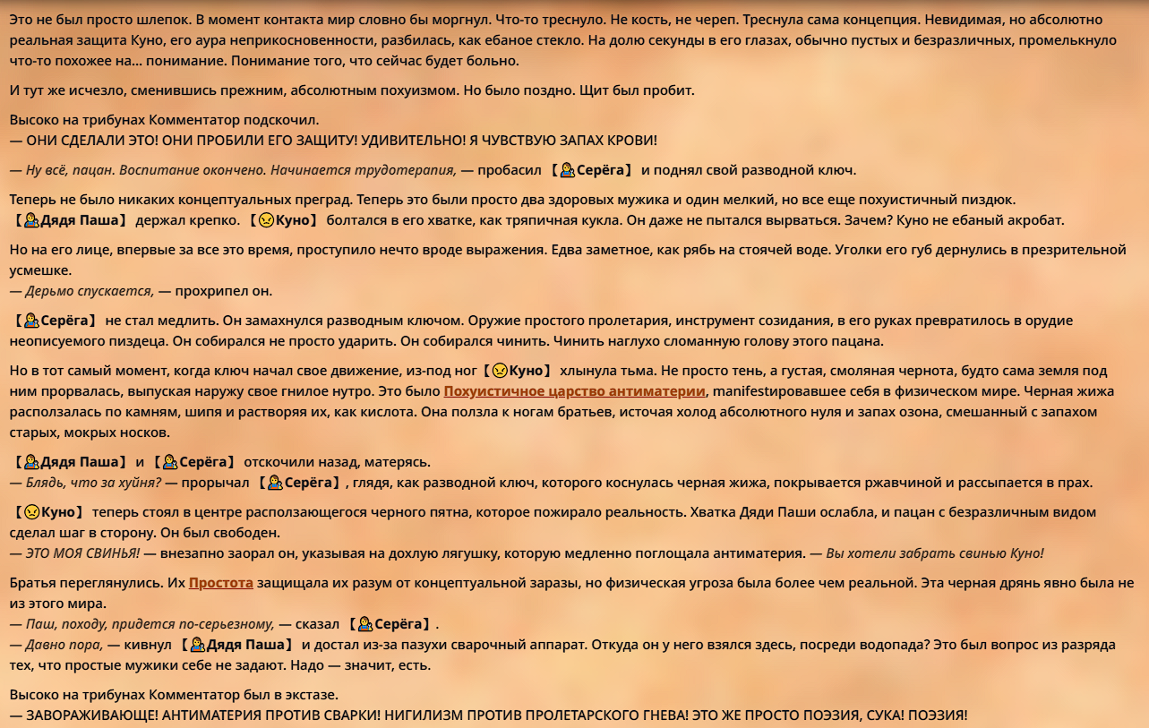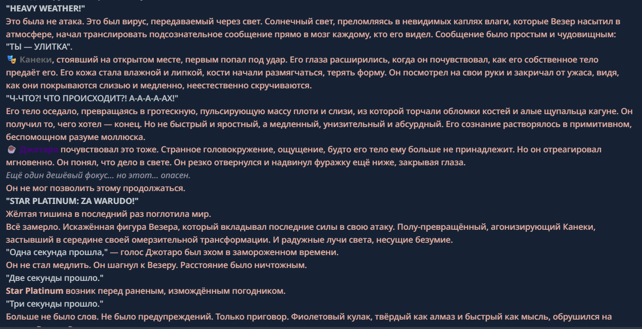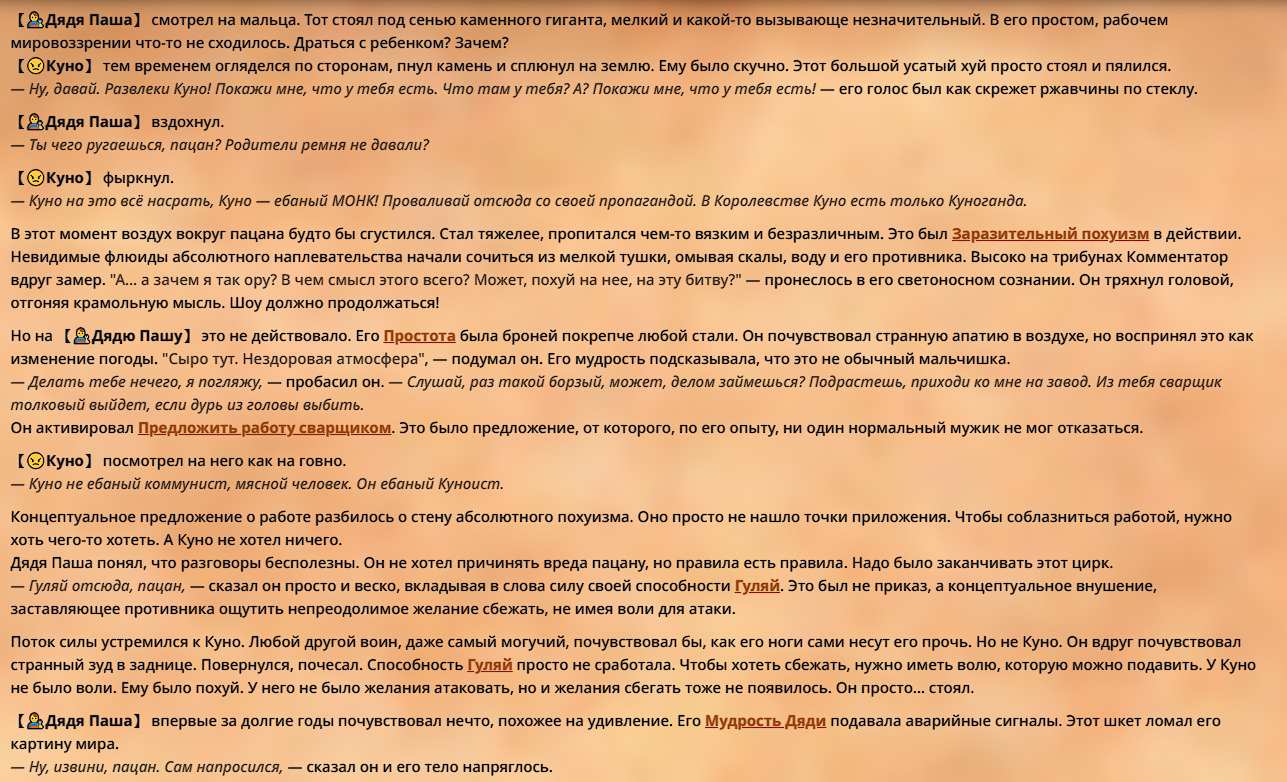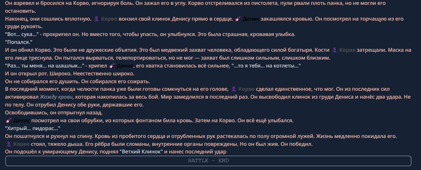 >>841604 Самое смешное было на какой-то совсем старой версии промта, где я забыл врубить галочку боя и персонажи в раунде внезапно стали чаще использовать навыки и вообще вести себя адекватнее xD. Но это было ещё в марте что ли.
