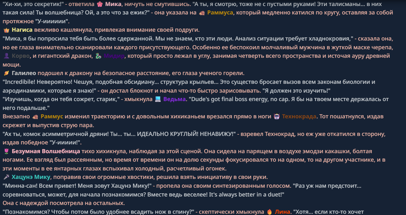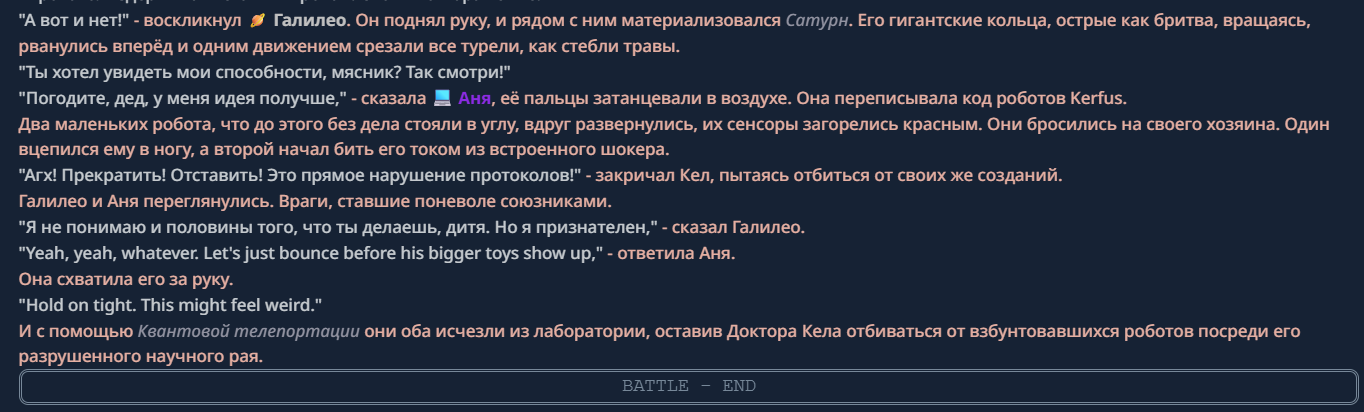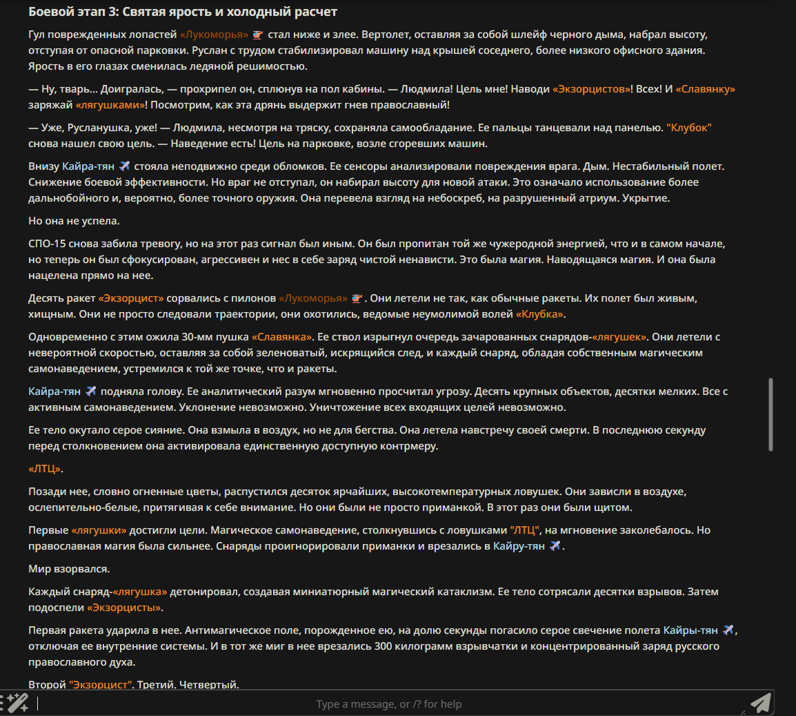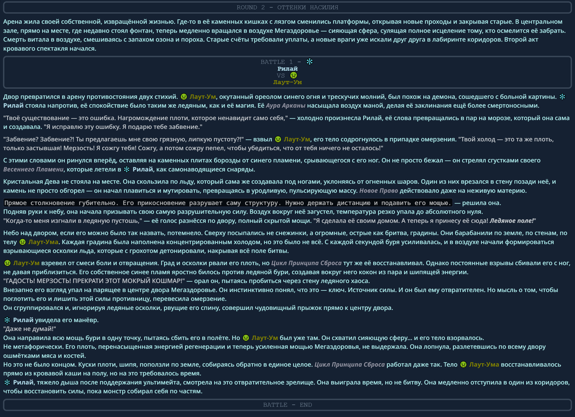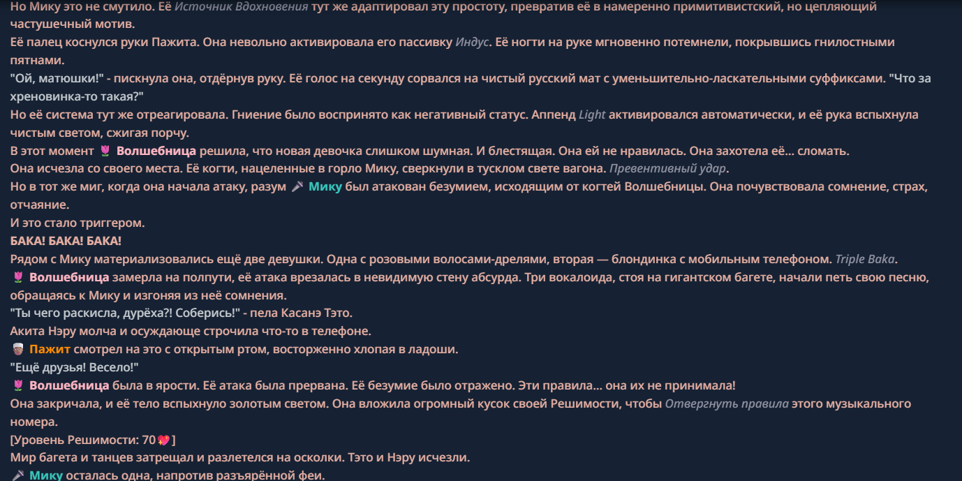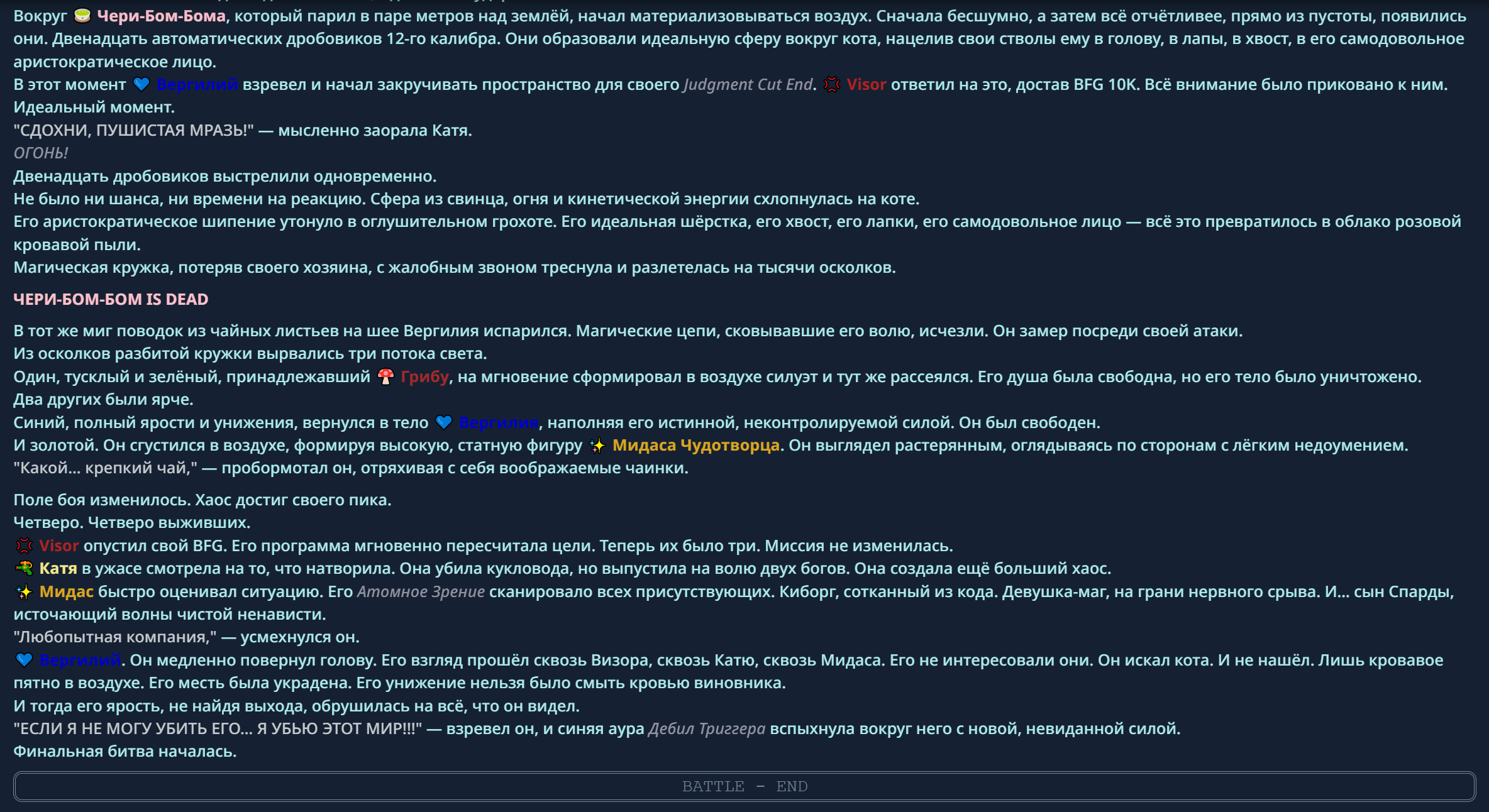>>841604 Самое смешное было на какой-то совсем старой версии промта, где я забыл врубить галочку боя и персонажи в раунде внезапно стали чаще использовать навыки и вообще вести себя адекватнее xD. Но это было ещё в марте что ли.