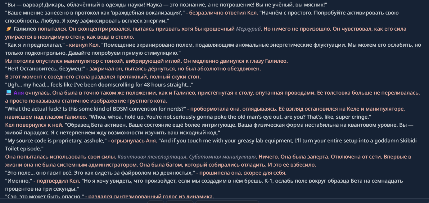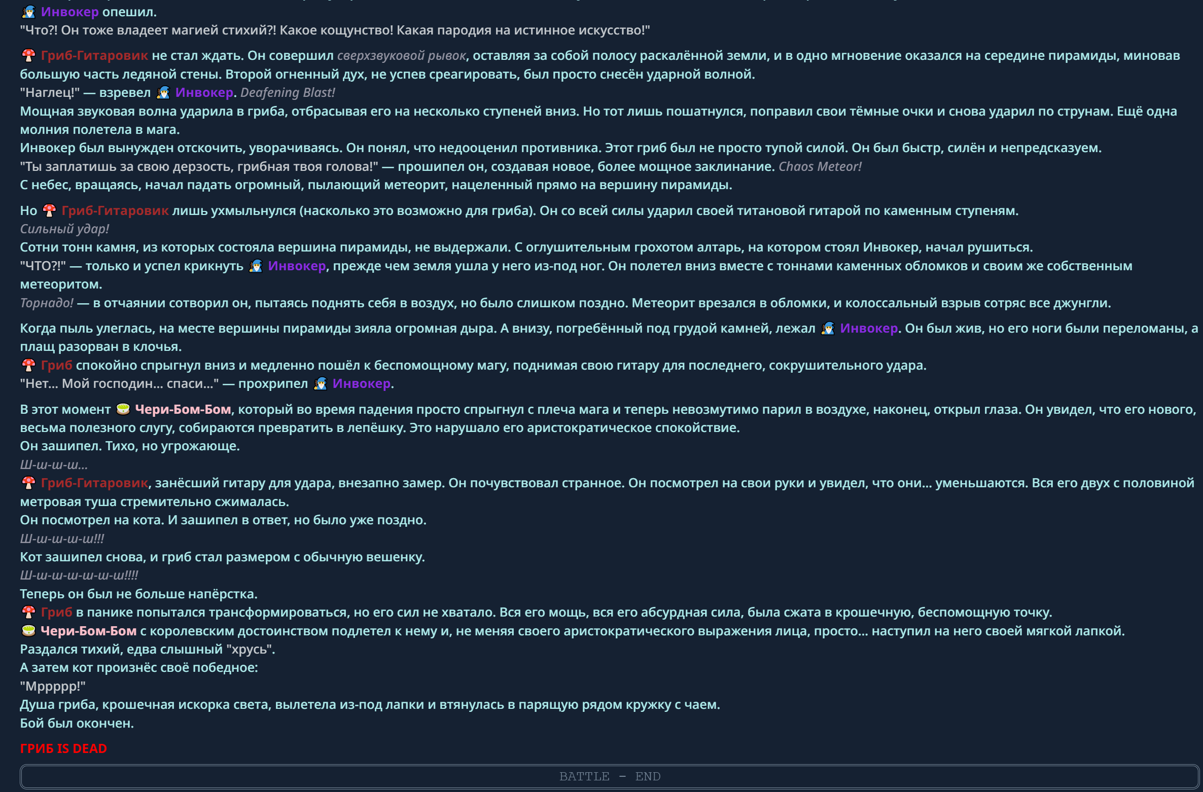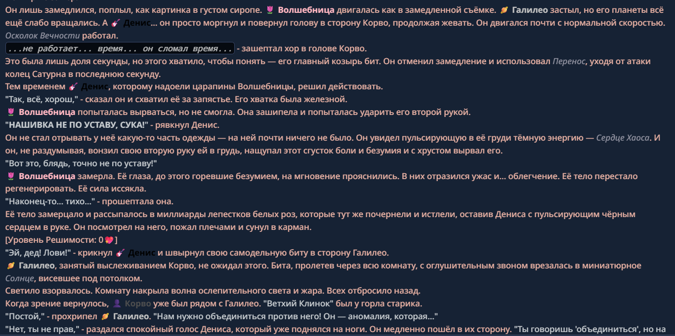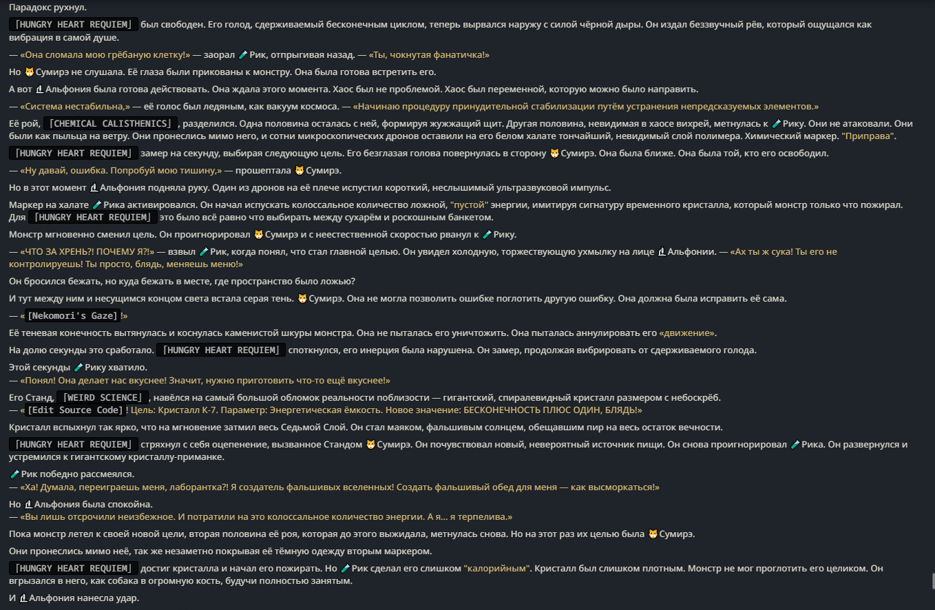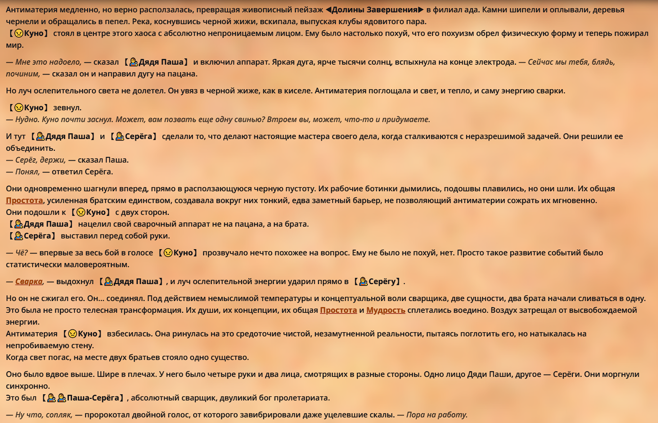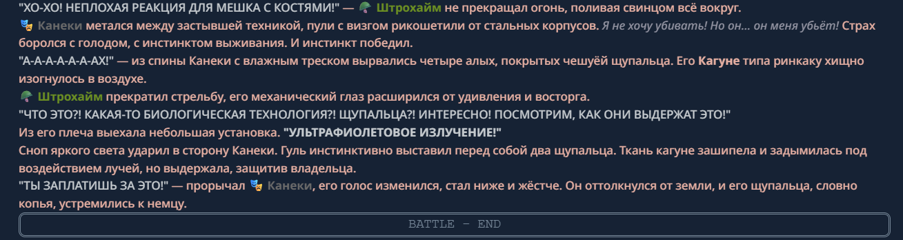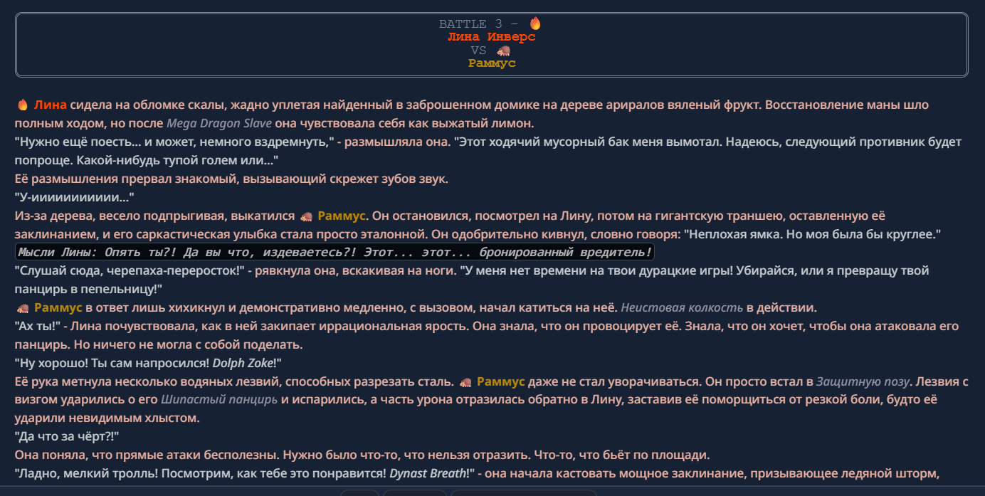 >>841604 Самое смешное было на какой-то совсем старой версии промта, где я забыл врубить галочку боя и персонажи в раунде внезапно стали чаще использовать навыки и вообще вести себя адекватнее xD. Но это было ещё в марте что ли.