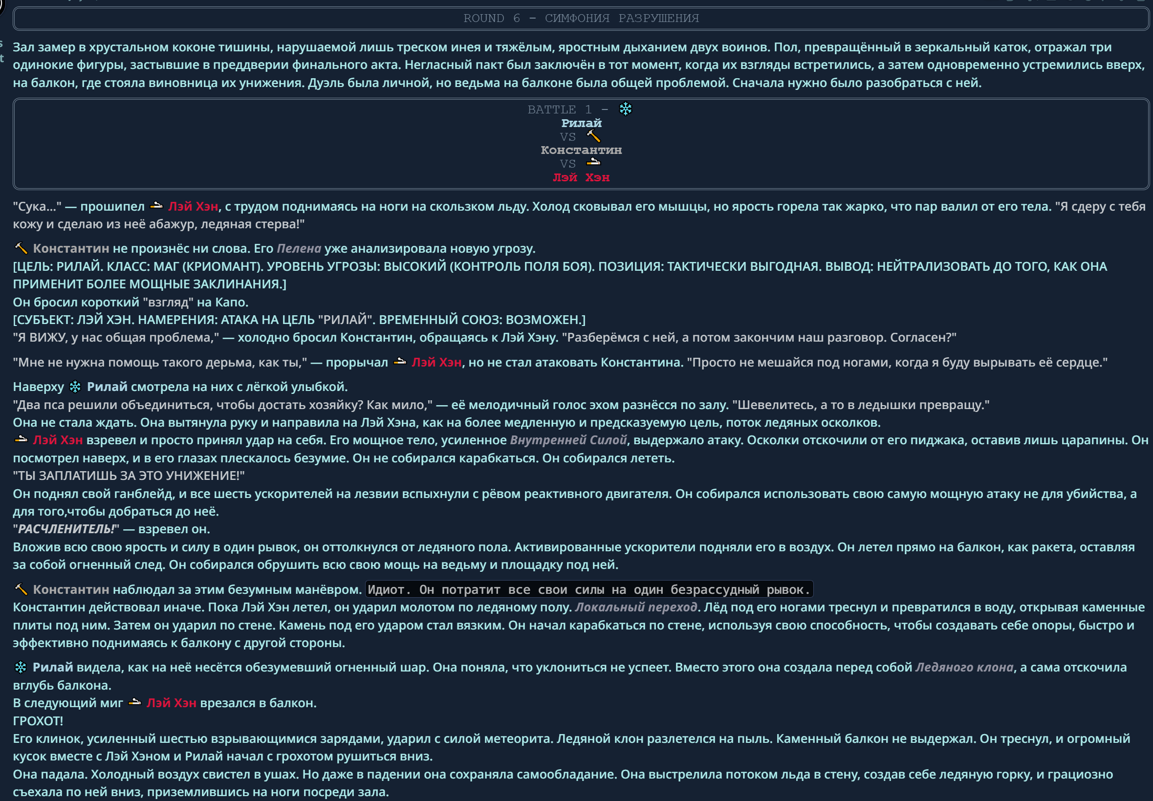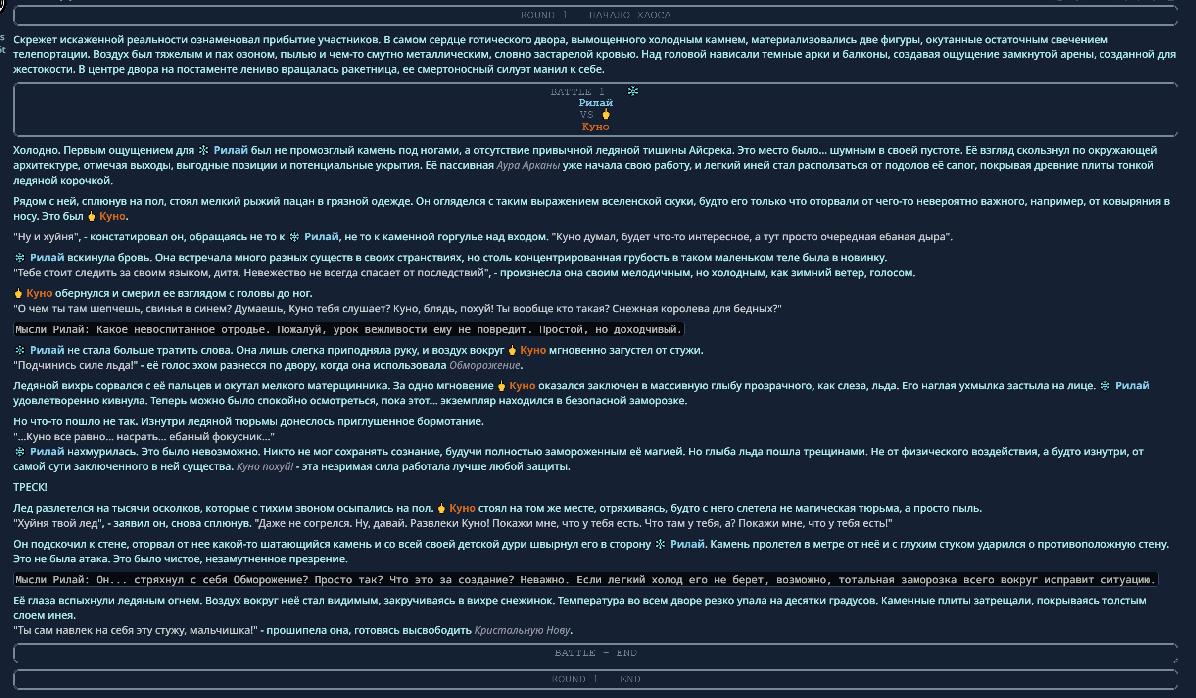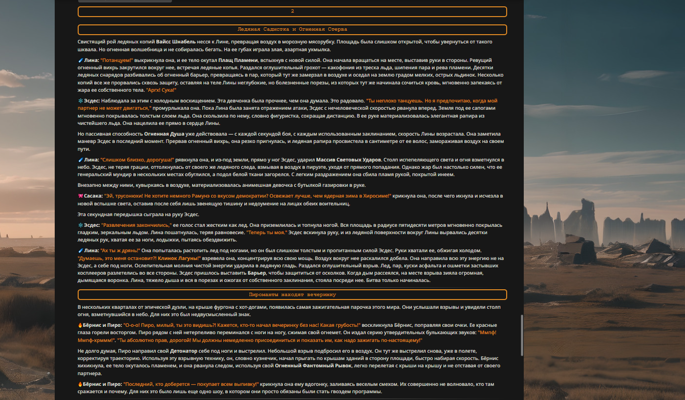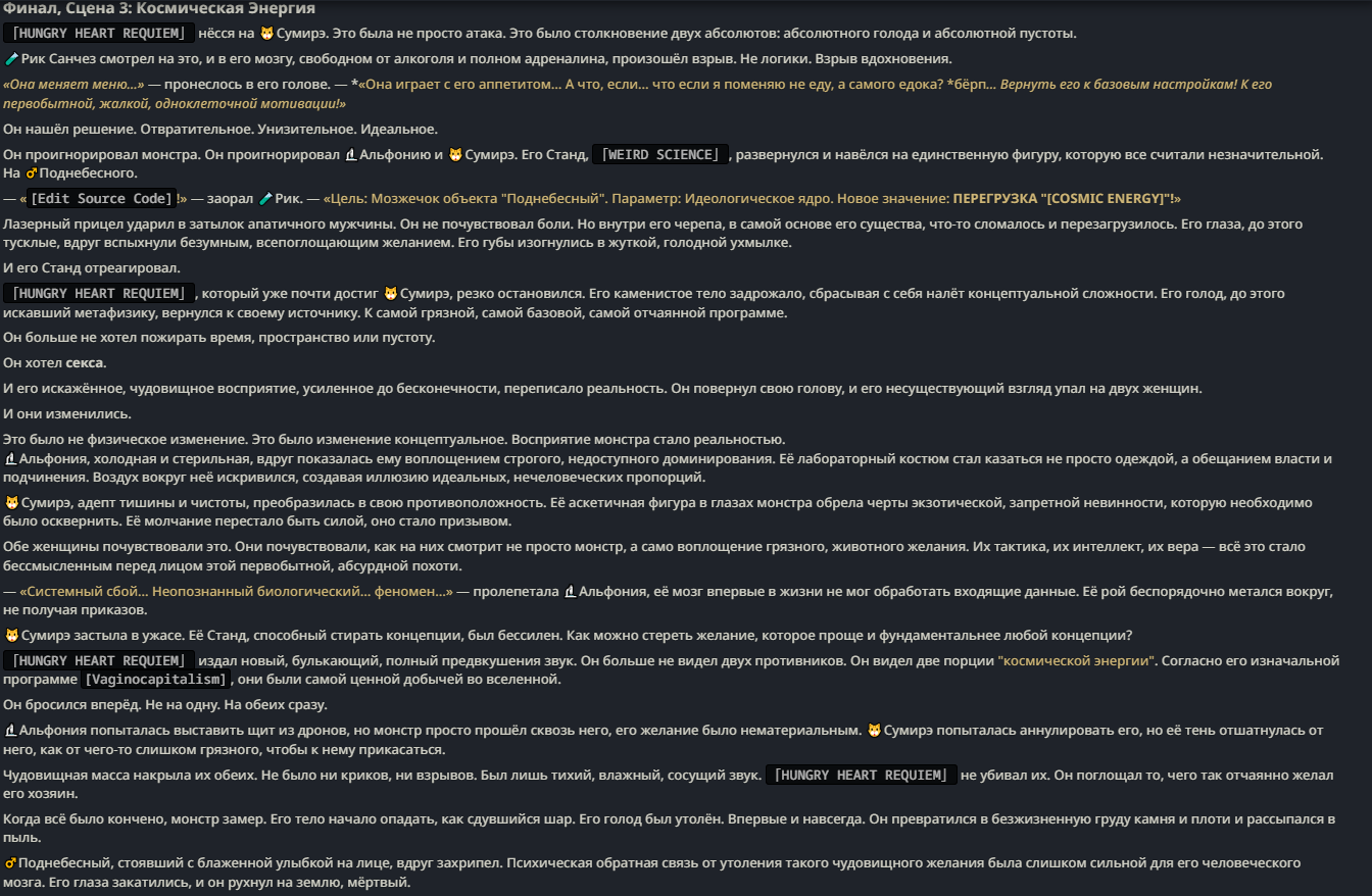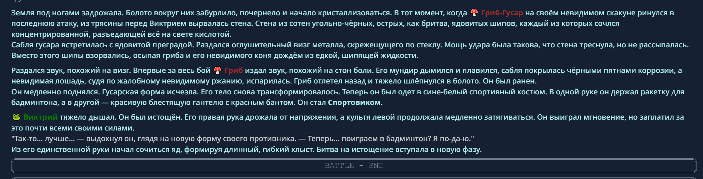 >>841604 Самое смешное было на какой-то совсем старой версии промта, где я забыл врубить галочку боя и персонажи в раунде внезапно стали чаще использовать навыки и вообще вести себя адекватнее xD. Но это было ещё в марте что ли.