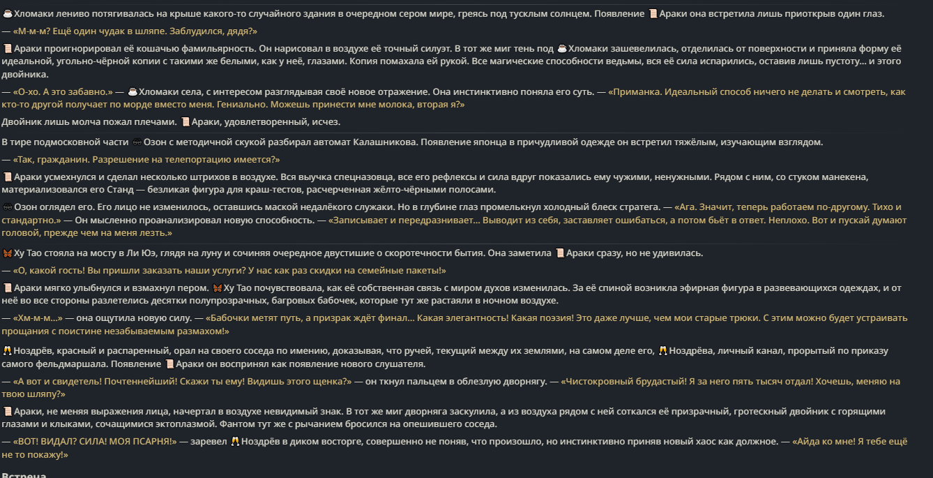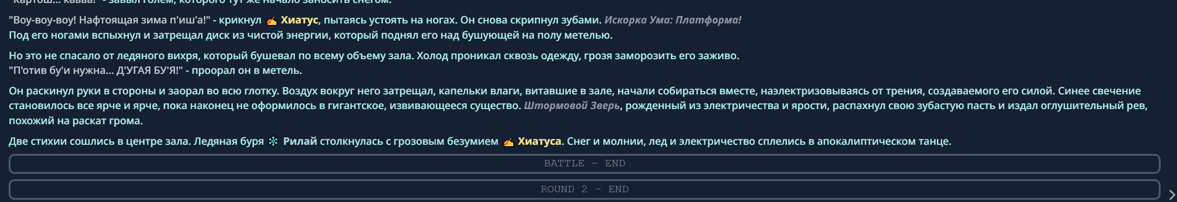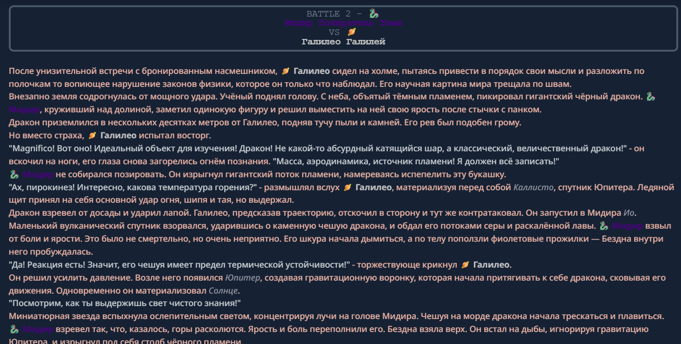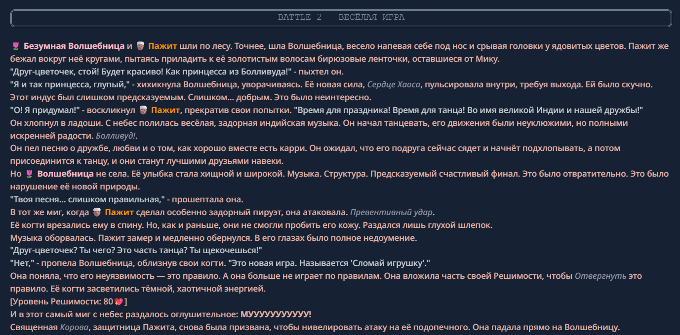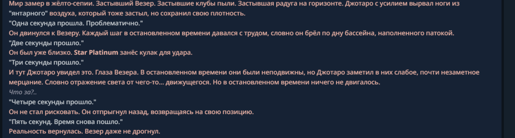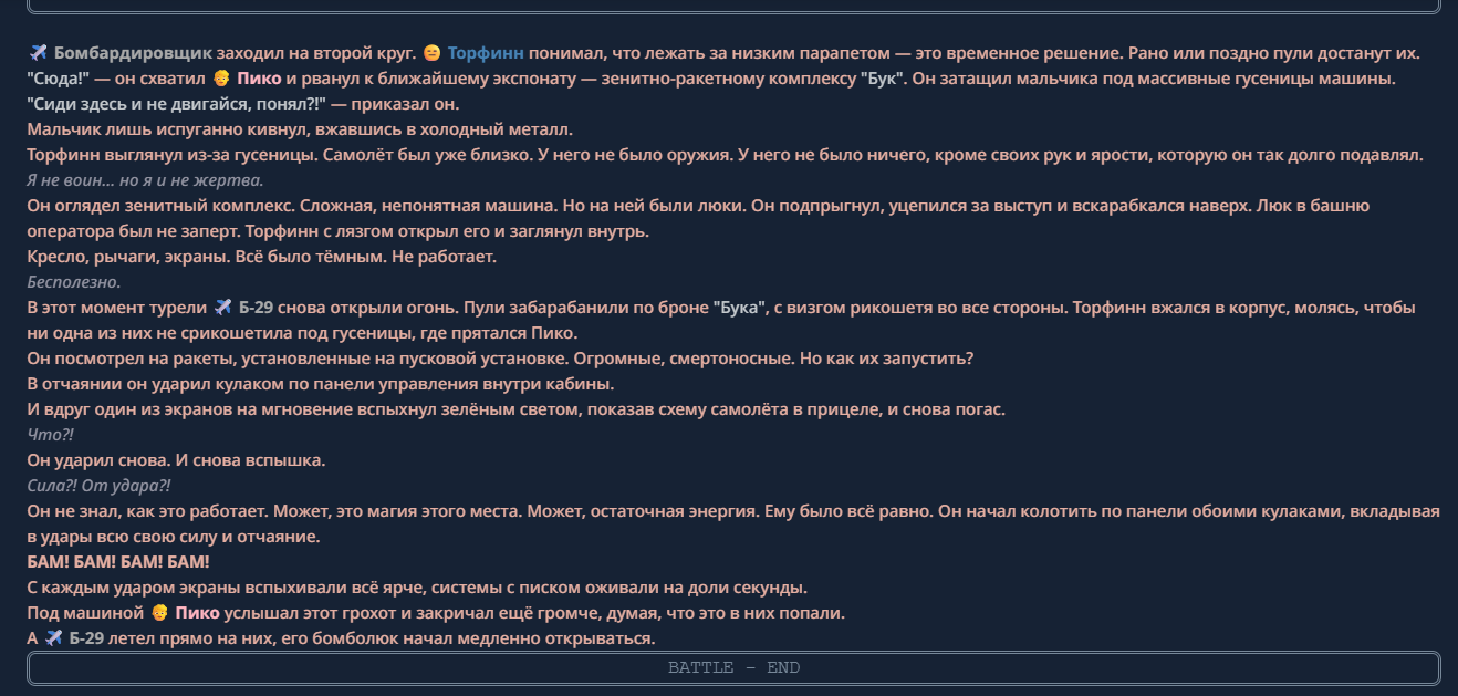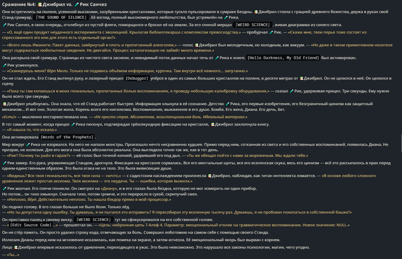 >>841604 Самое смешное было на какой-то совсем старой версии промта, где я забыл врубить галочку боя и персонажи в раунде внезапно стали чаще использовать навыки и вообще вести себя адекватнее xD. Но это было ещё в марте что ли.