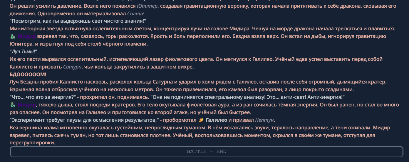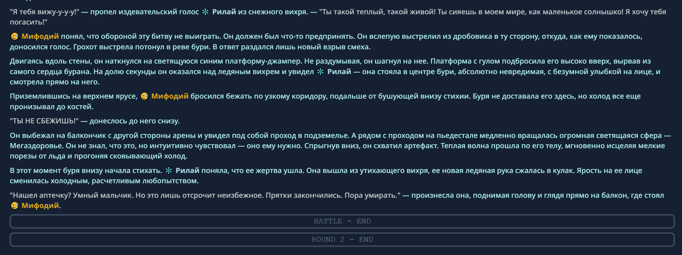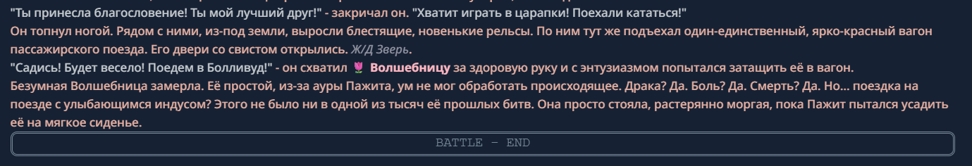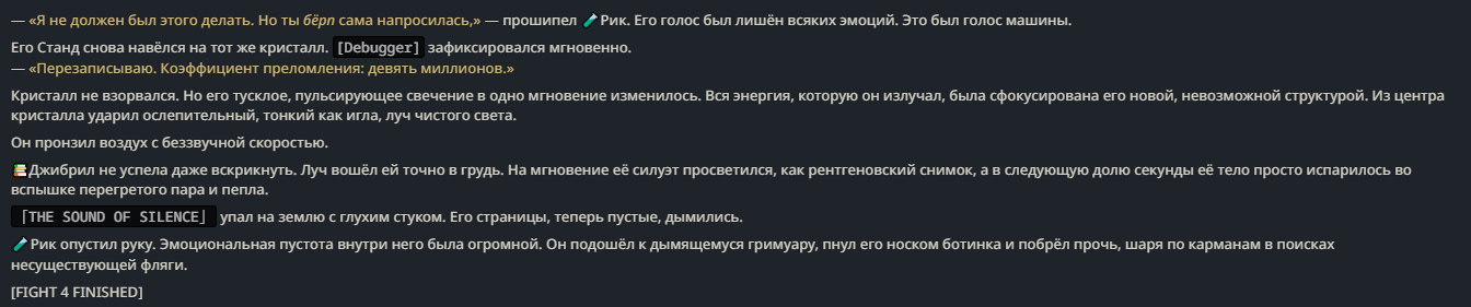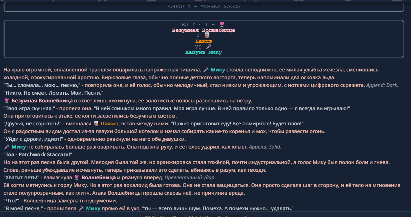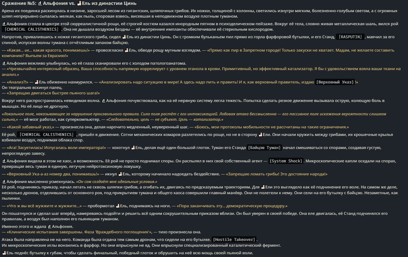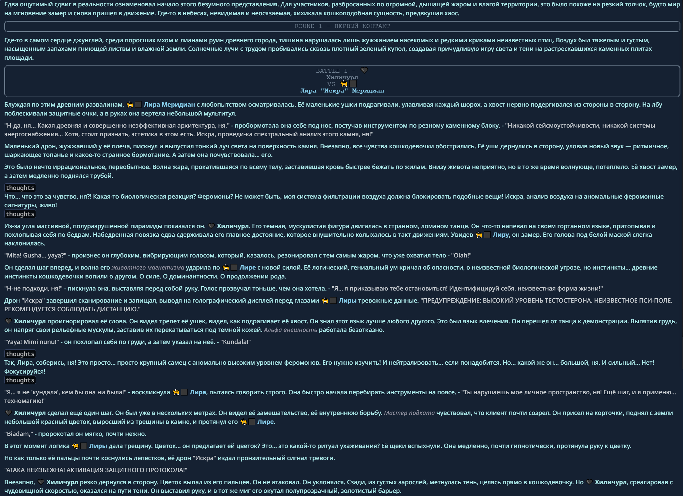 >>841604 Самое смешное было на какой-то совсем старой версии промта, где я забыл врубить галочку боя и персонажи в раунде внезапно стали чаще использовать навыки и вообще вести себя адекватнее xD. Но это было ещё в марте что ли.