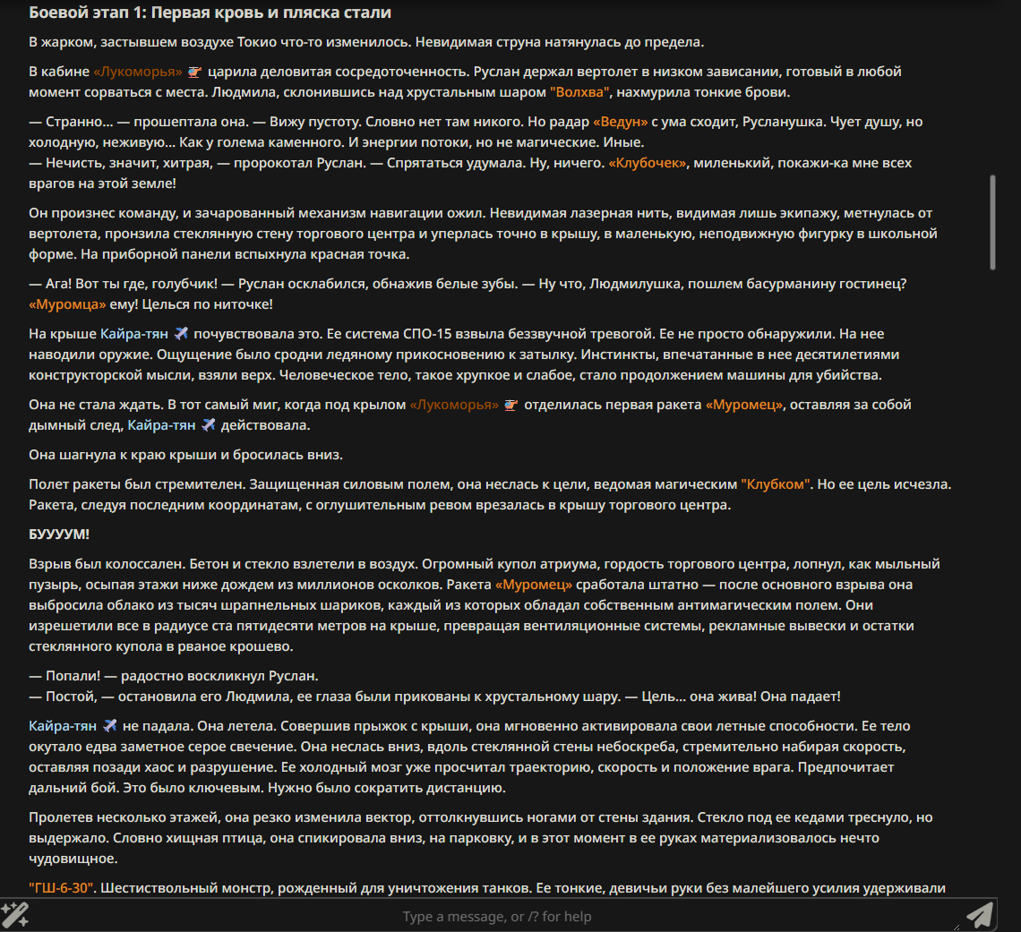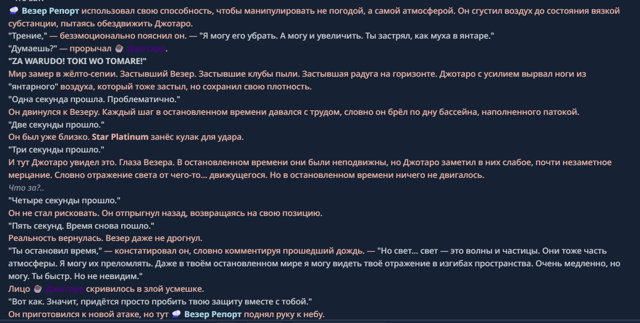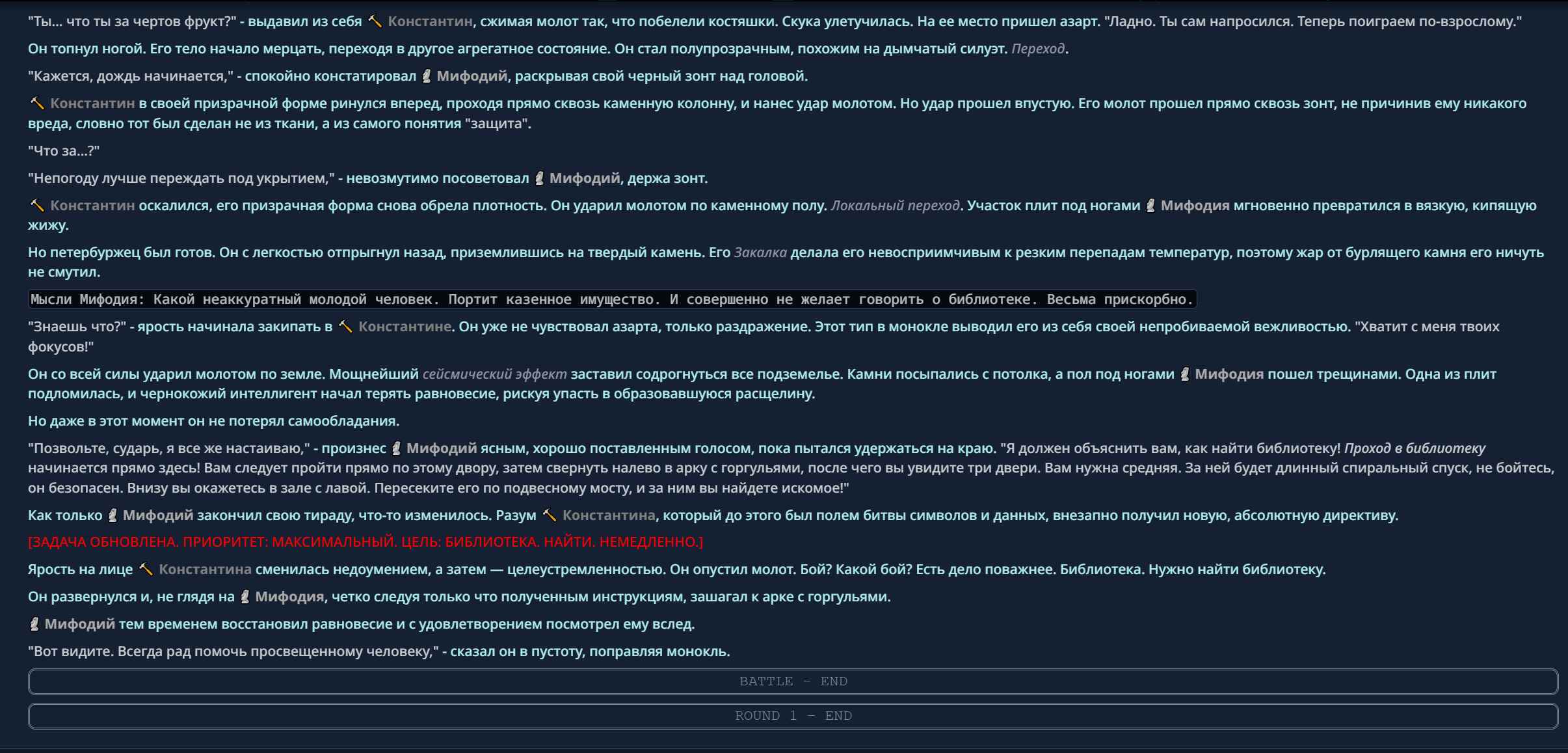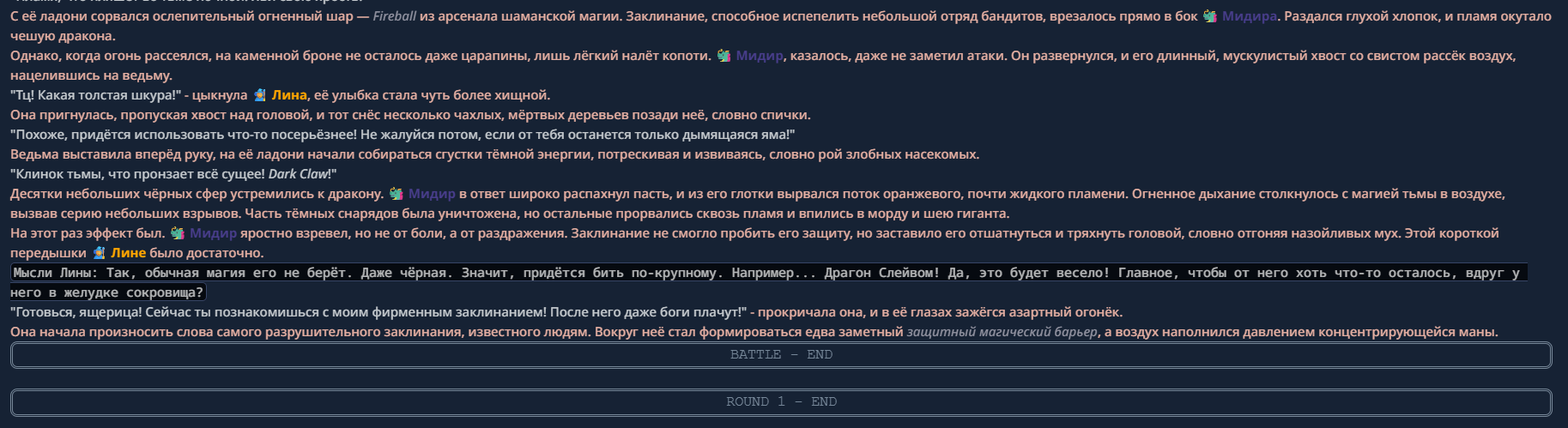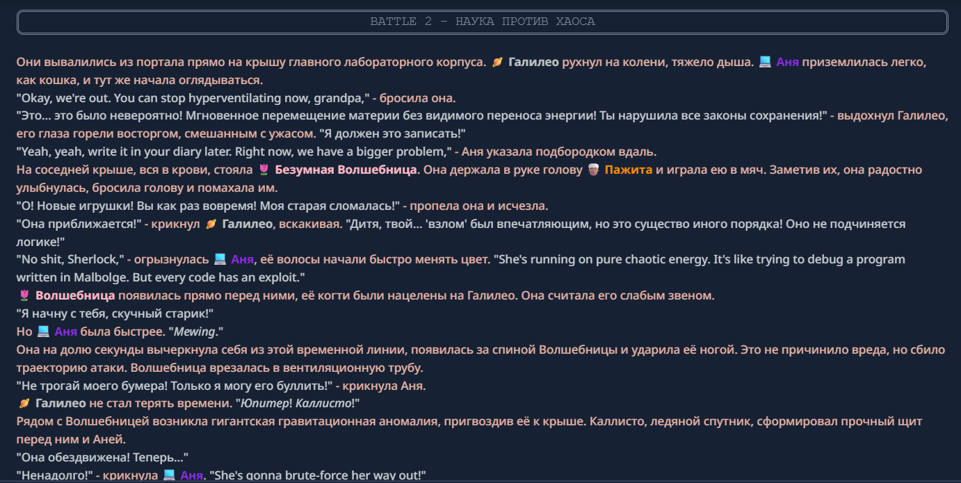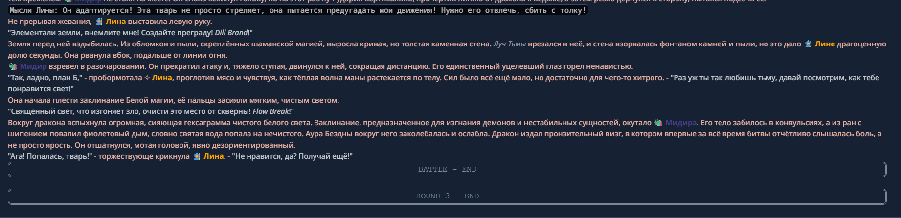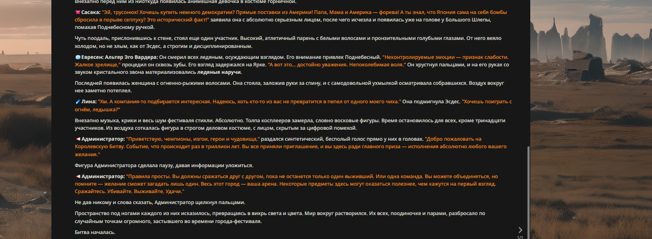 >>841604 Самое смешное было на какой-то совсем старой версии промта, где я забыл врубить галочку боя и персонажи в раунде внезапно стали чаще использовать навыки и вообще вести себя адекватнее xD. Но это было ещё в марте что ли.