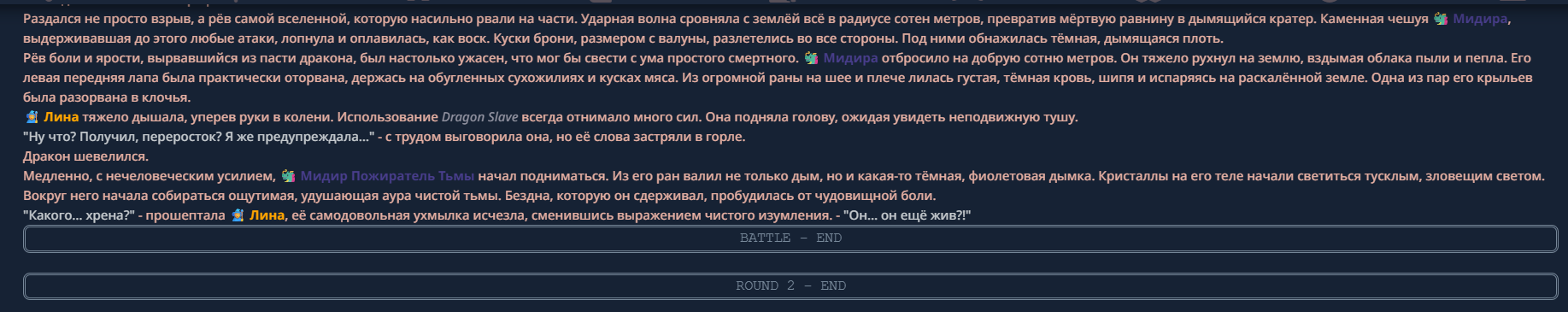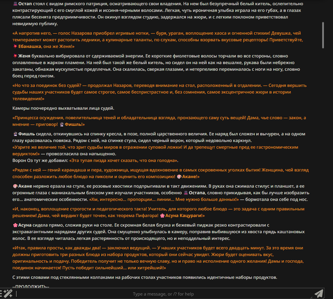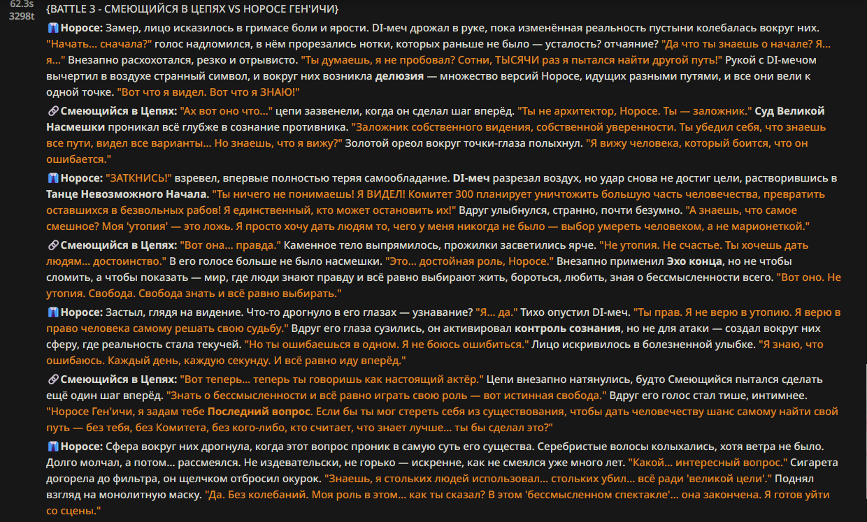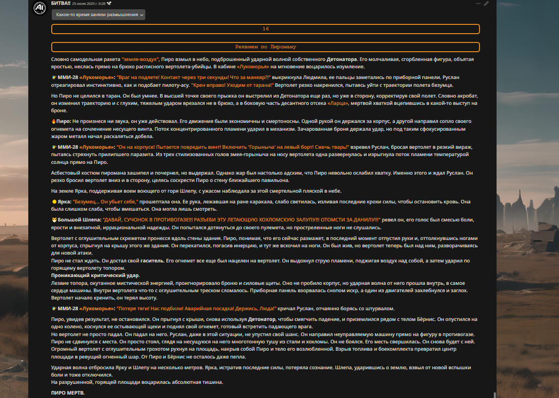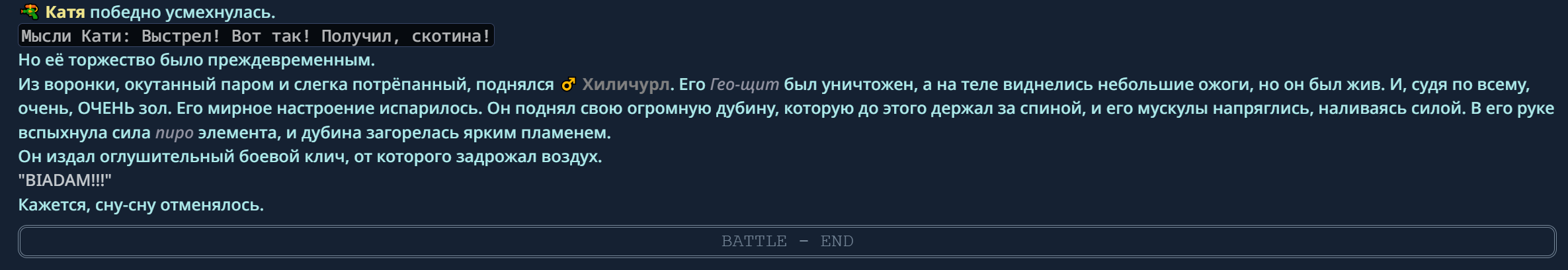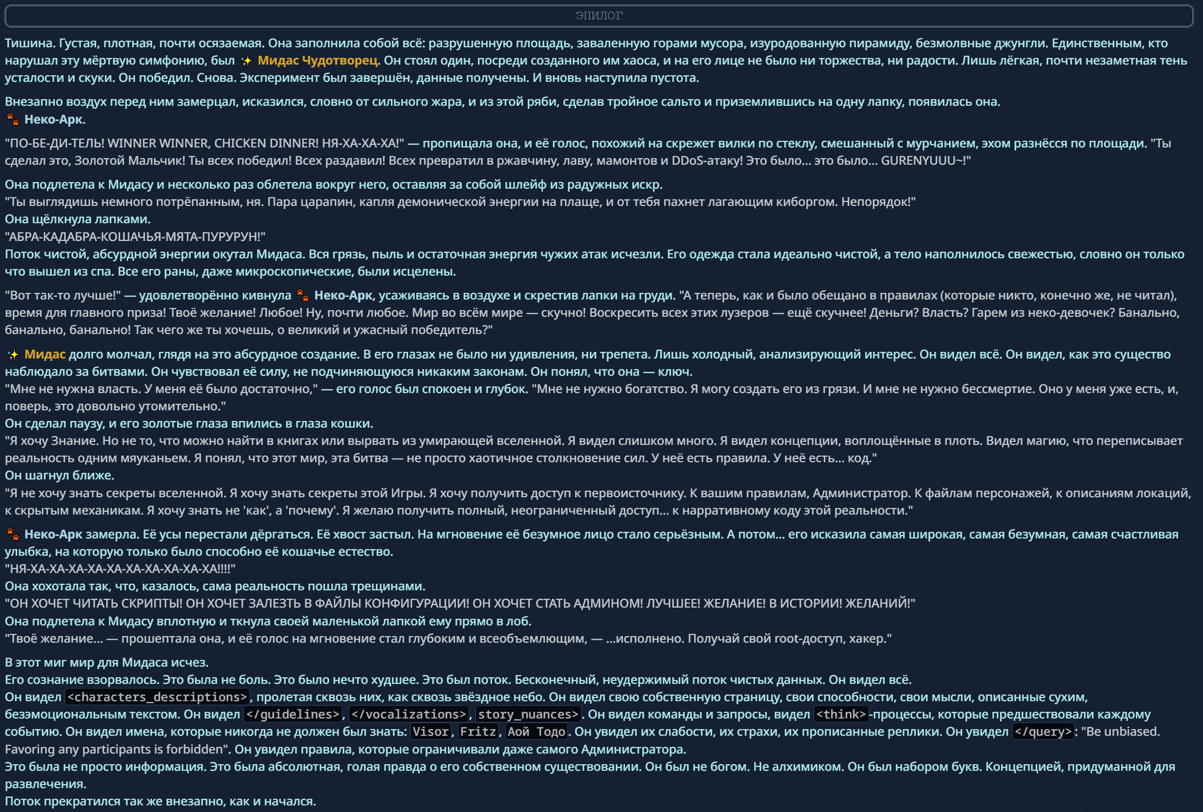 >>841604 Самое смешное было на какой-то совсем старой версии промта, где я забыл врубить галочку боя и персонажи в раунде внезапно стали чаще использовать навыки и вообще вести себя адекватнее xD. Но это было ещё в марте что ли.