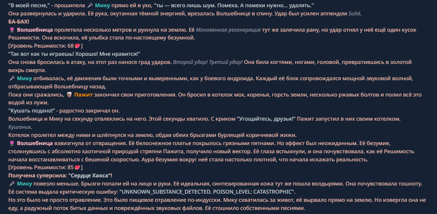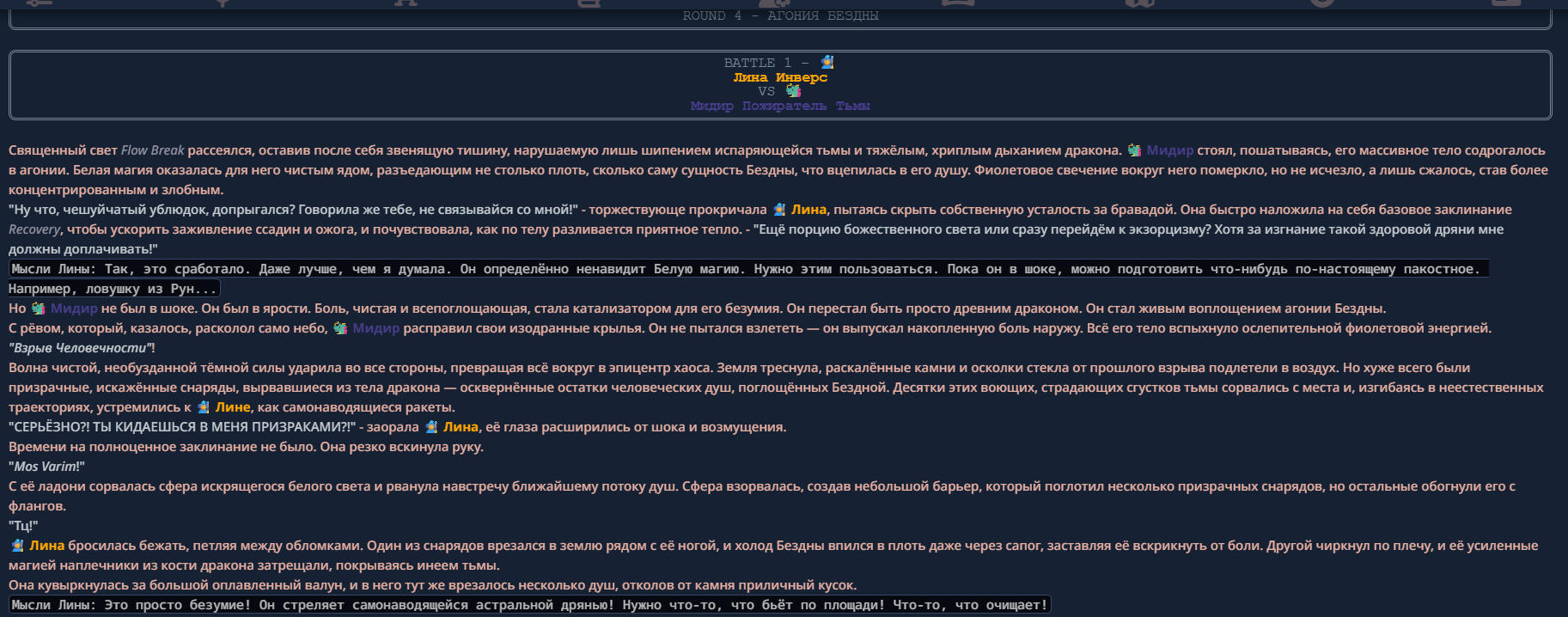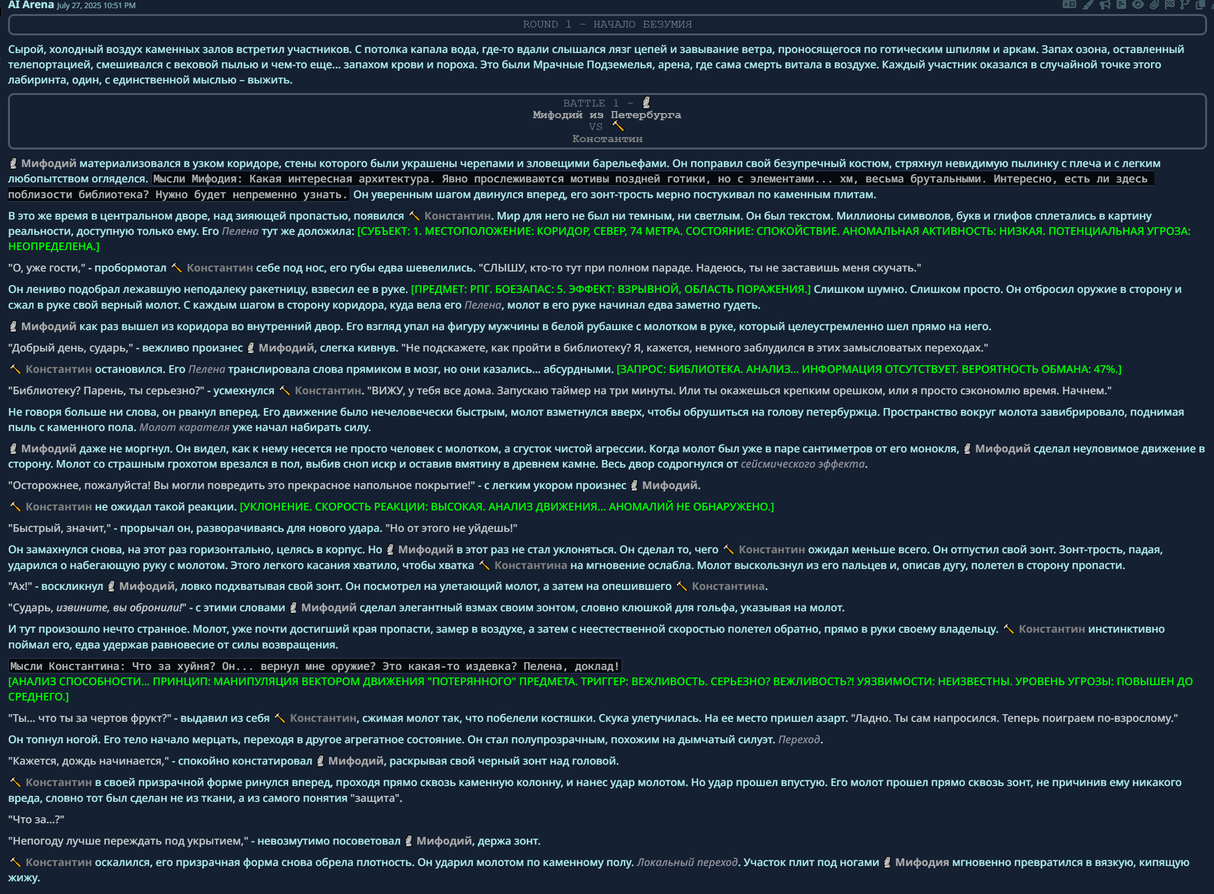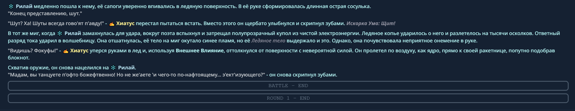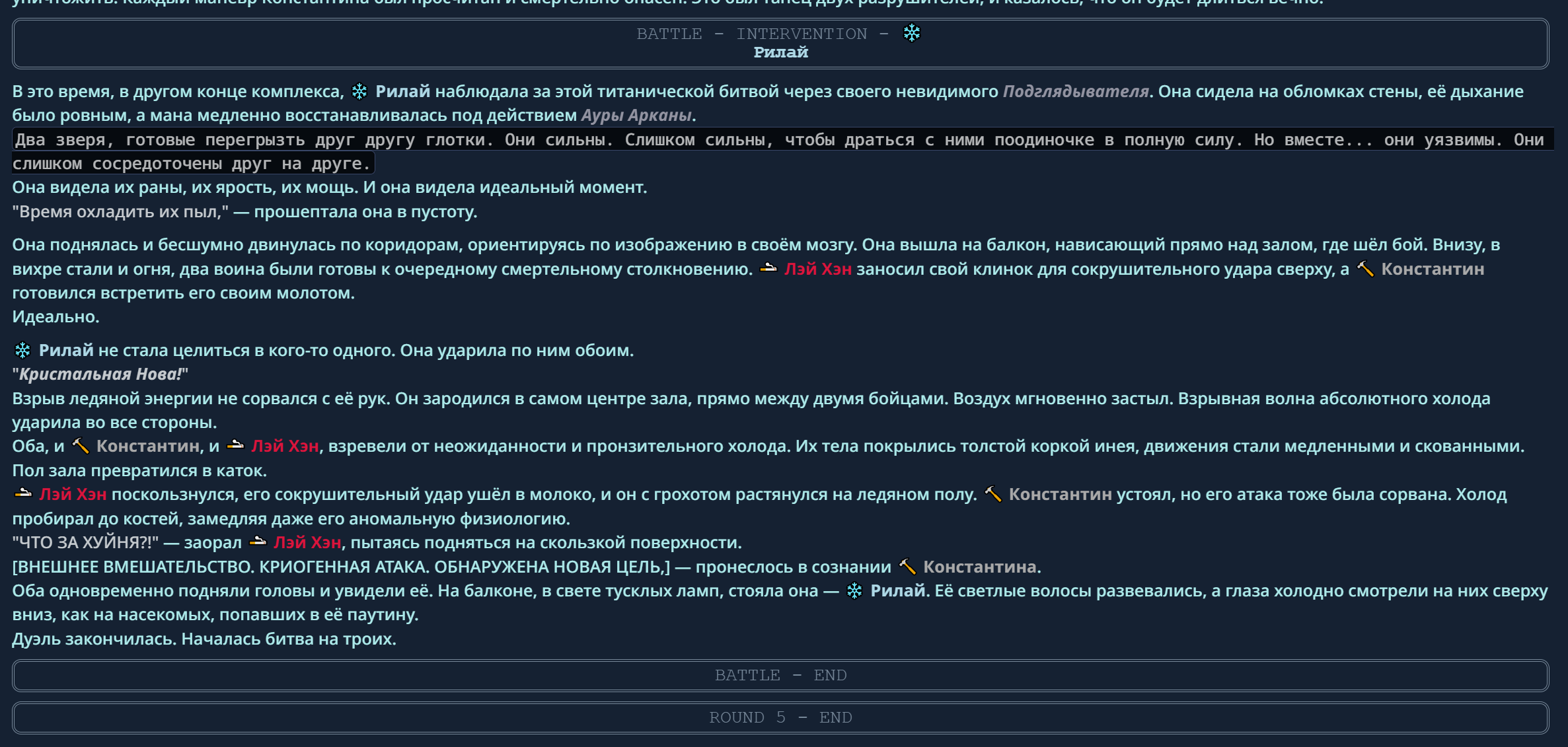>>841604 Самое смешное было на какой-то совсем старой версии промта, где я забыл врубить галочку боя и персонажи в раунде внезапно стали чаще использовать навыки и вообще вести себя адекватнее xD. Но это было ещё в марте что ли.