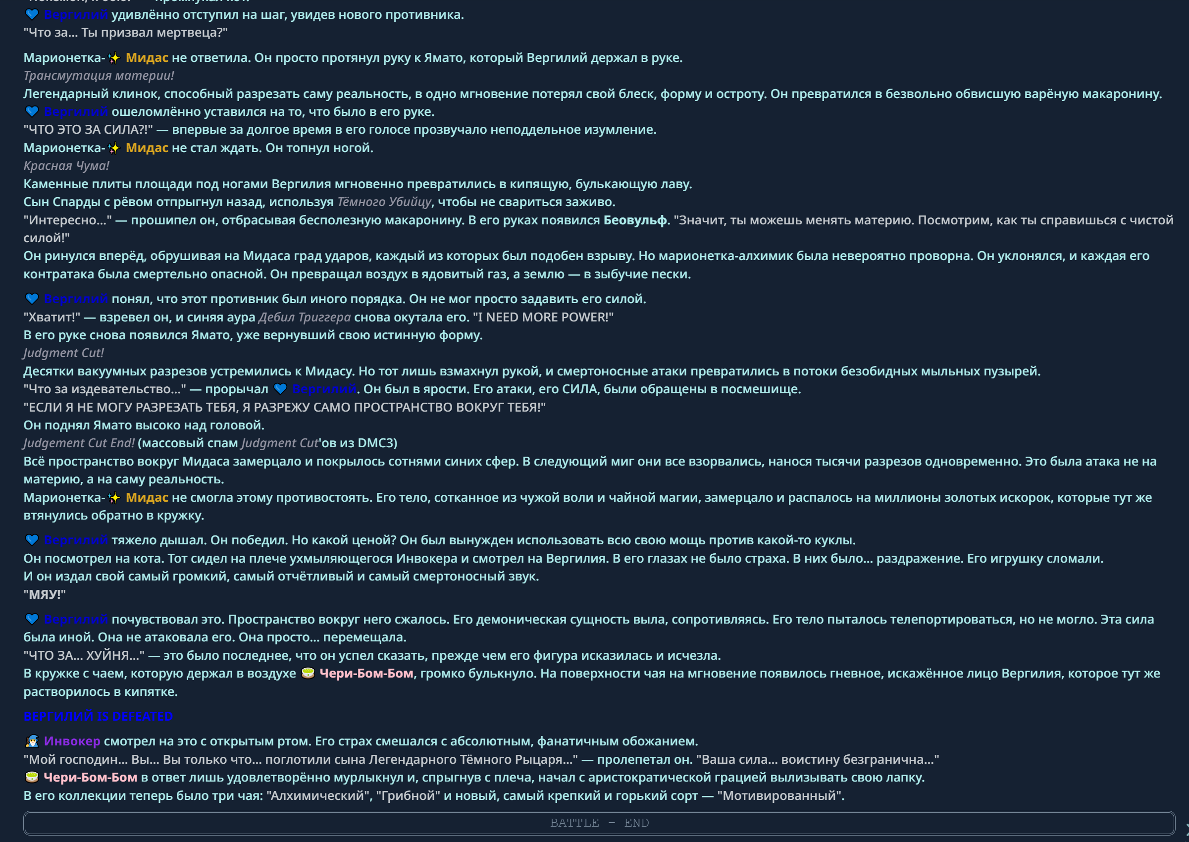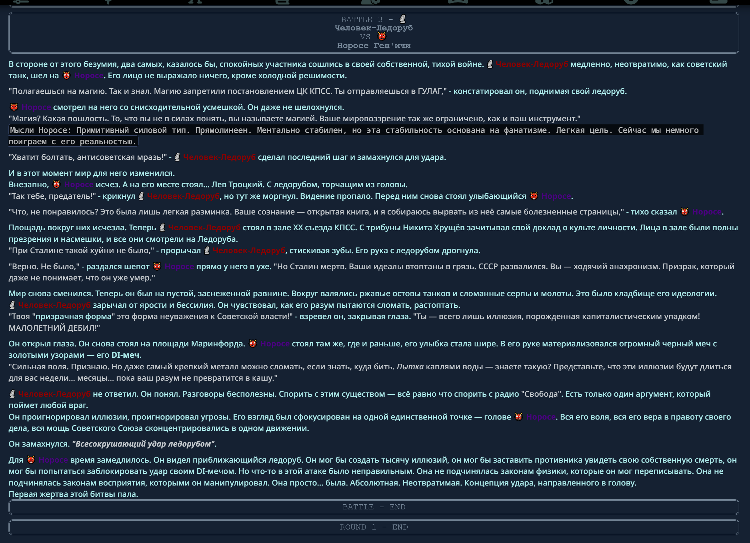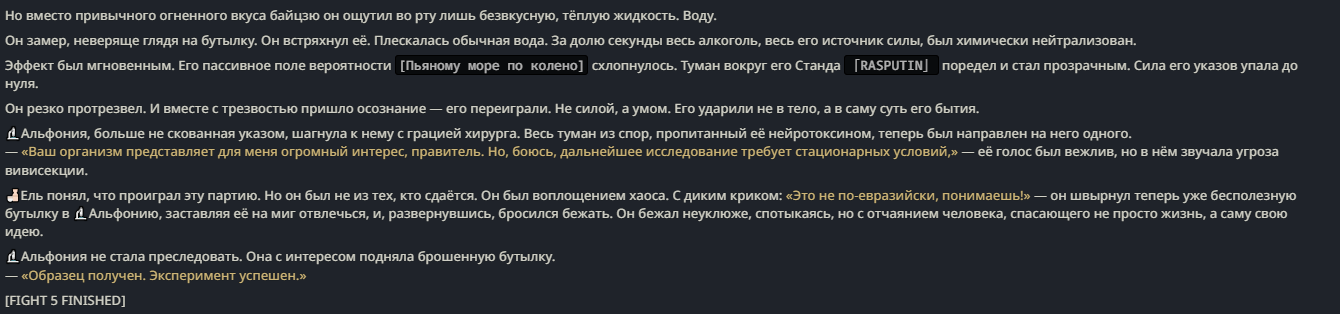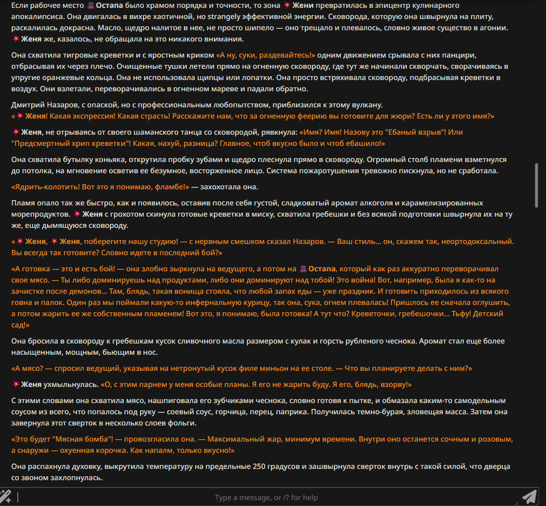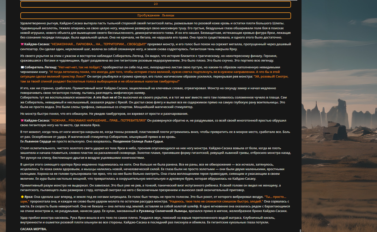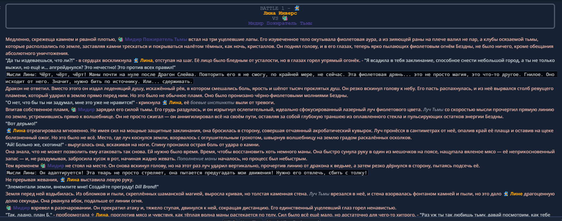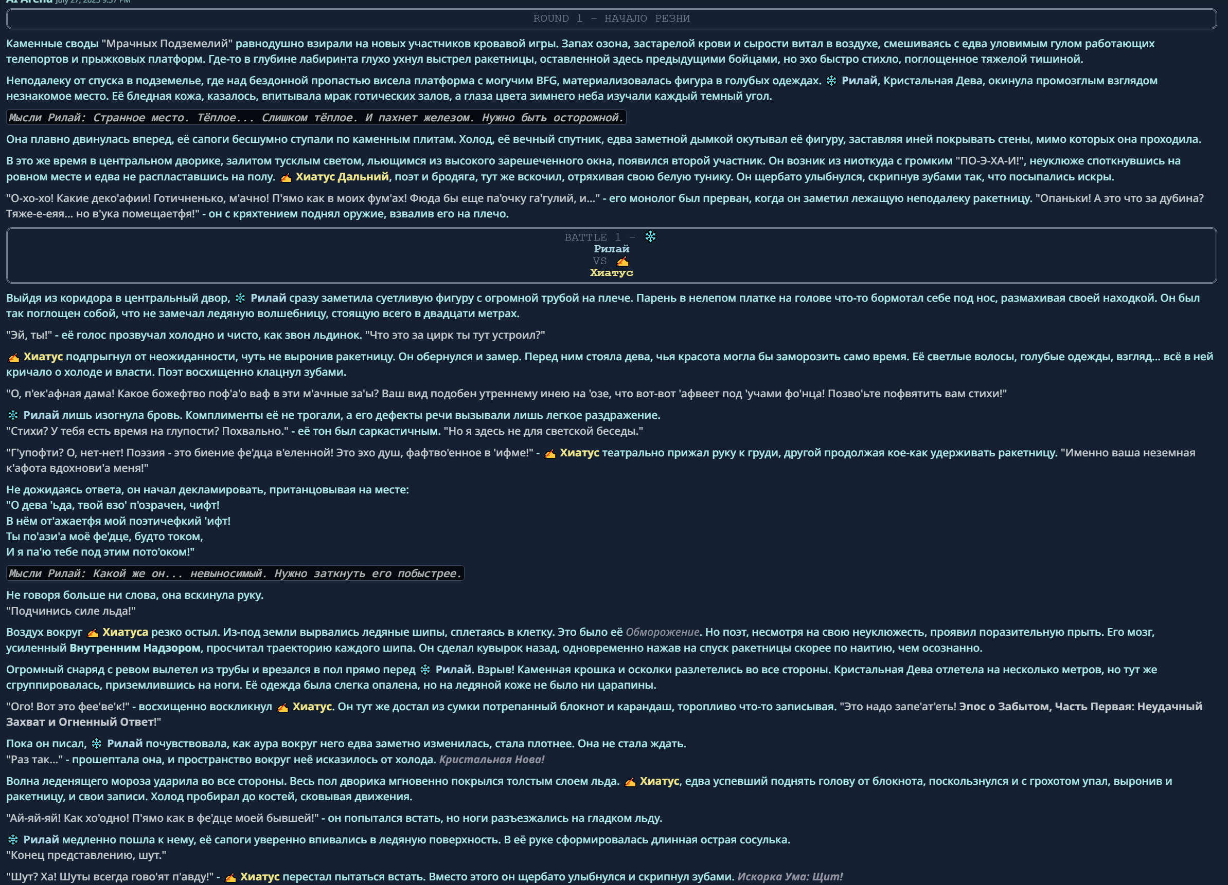 >>841604 Самое смешное было на какой-то совсем старой версии промта, где я забыл врубить галочку боя и персонажи в раунде внезапно стали чаще использовать навыки и вообще вести себя адекватнее xD. Но это было ещё в марте что ли.
