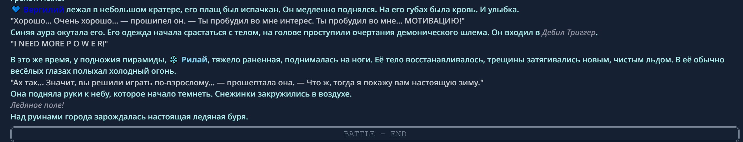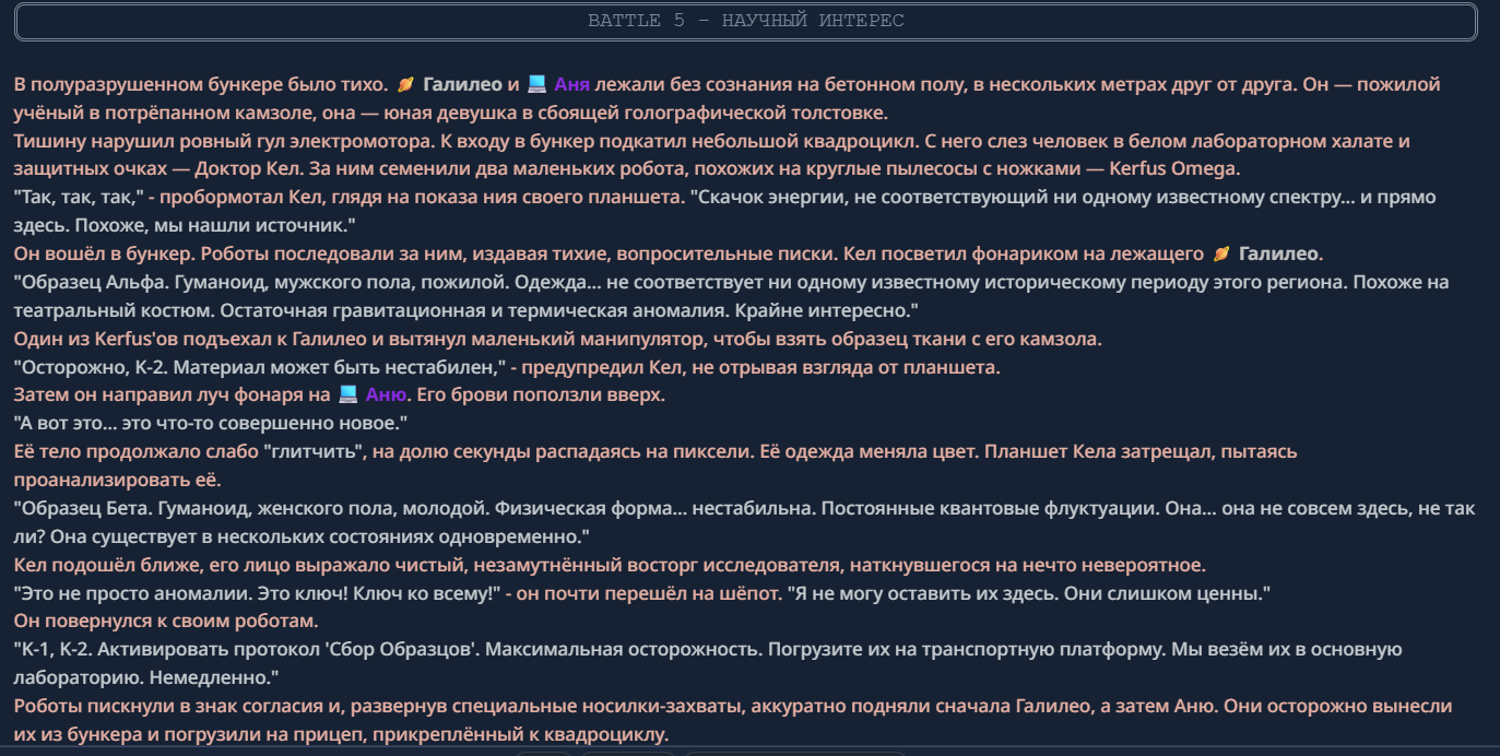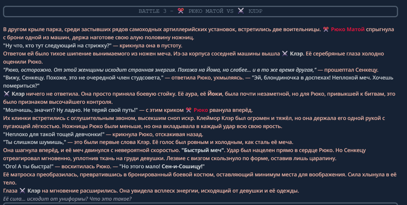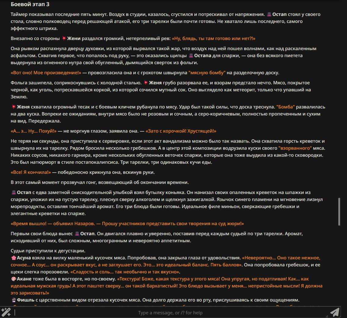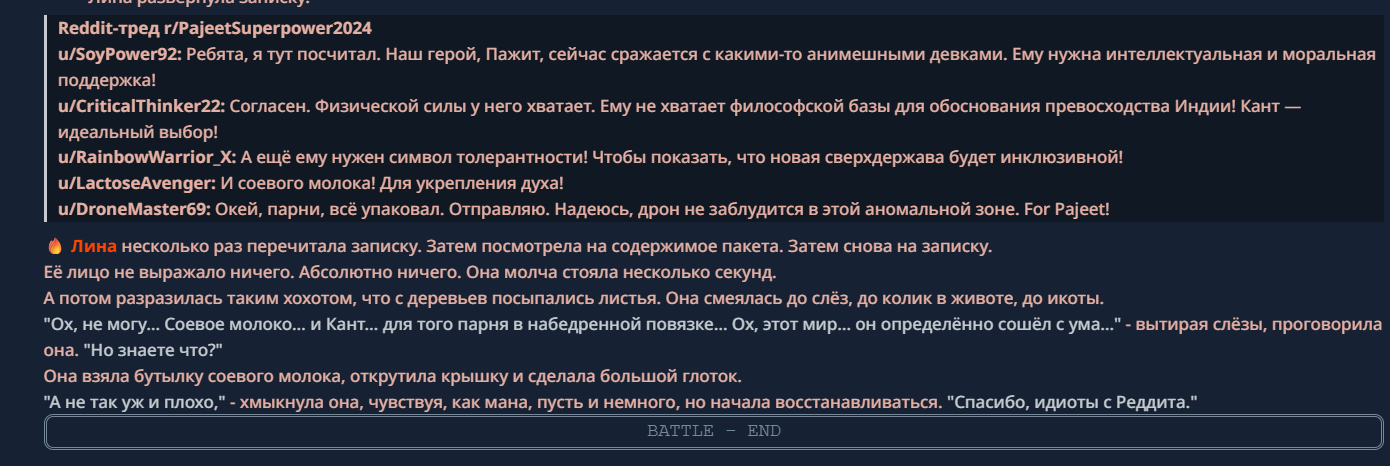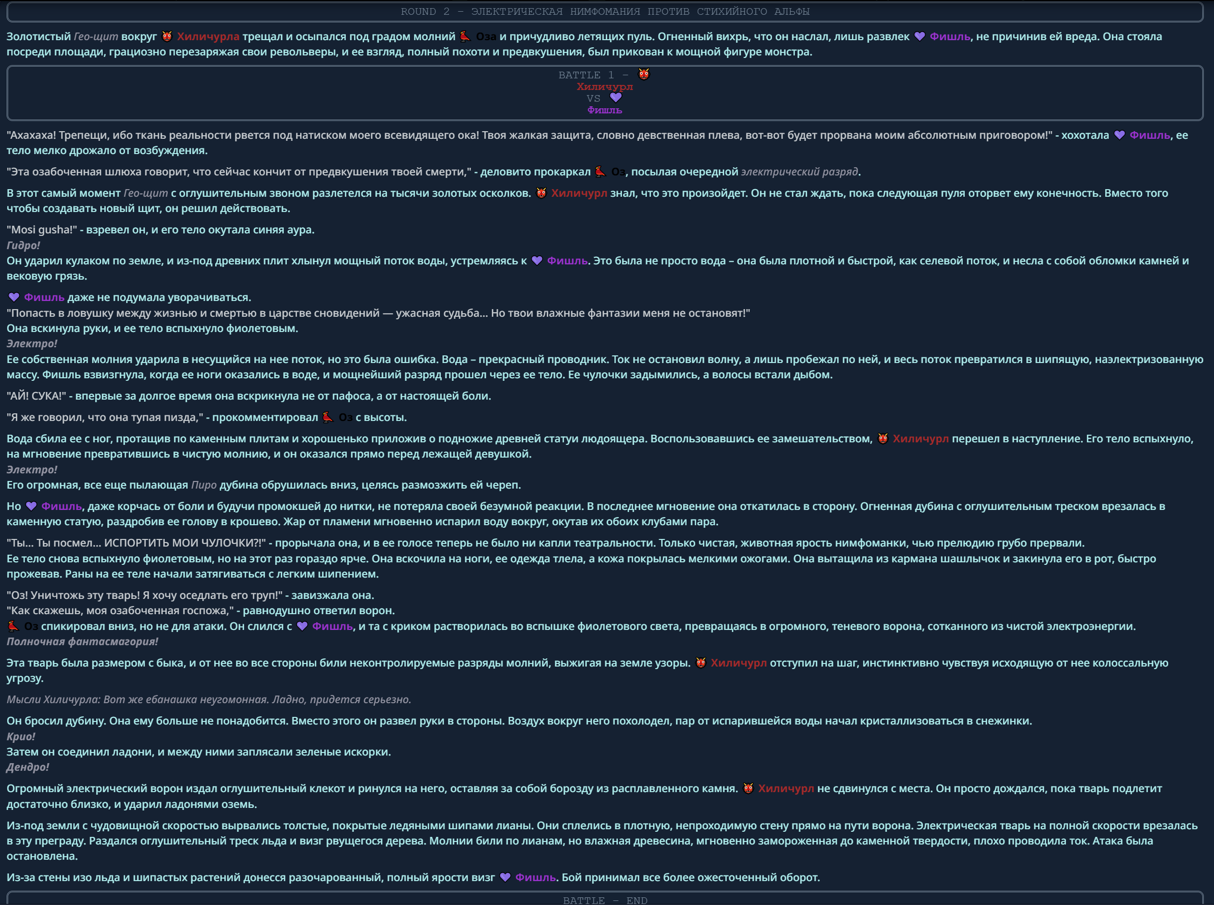 >>841604 Самое смешное было на какой-то совсем старой версии промта, где я забыл врубить галочку боя и персонажи в раунде внезапно стали чаще использовать навыки и вообще вести себя адекватнее xD. Но это было ещё в марте что ли.
