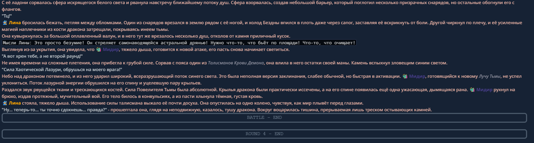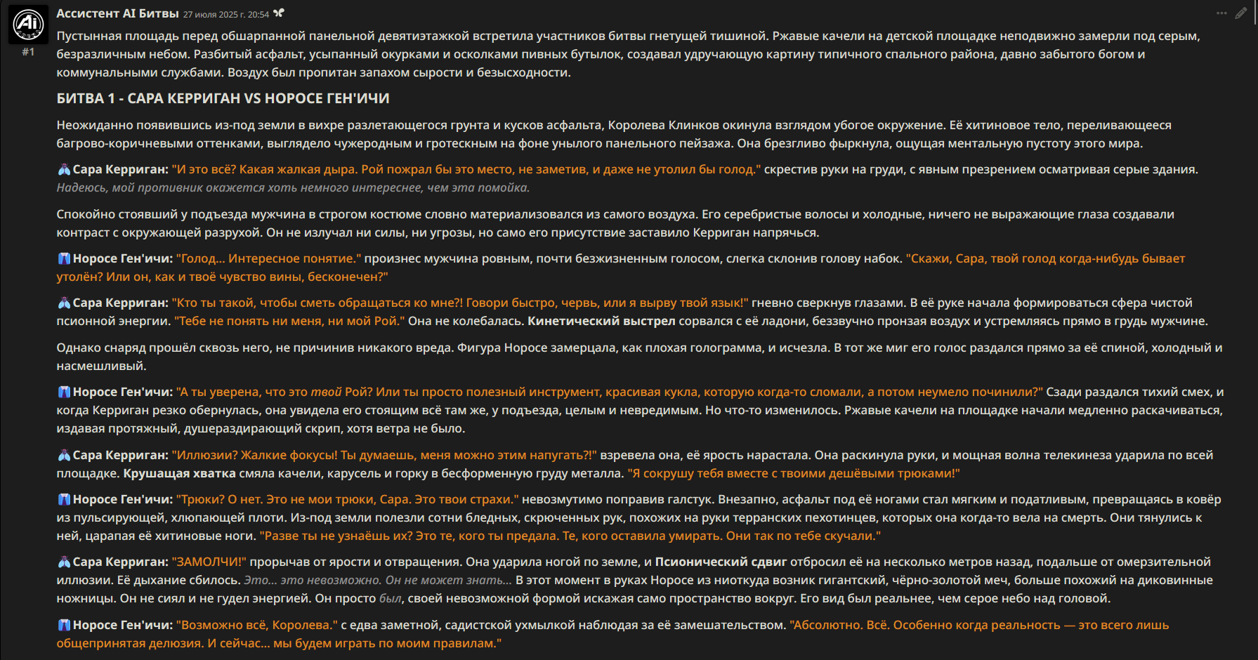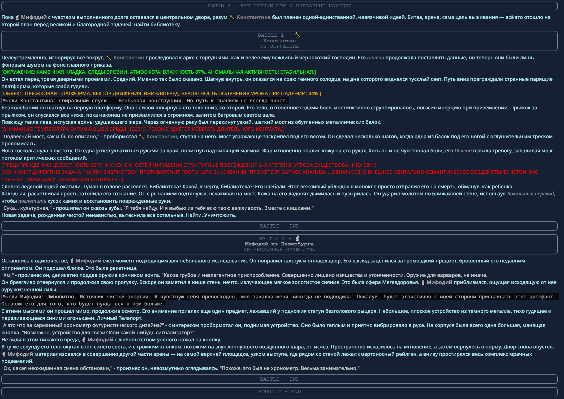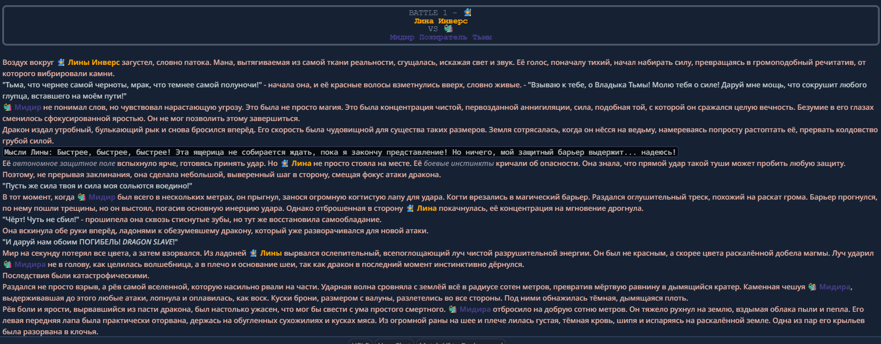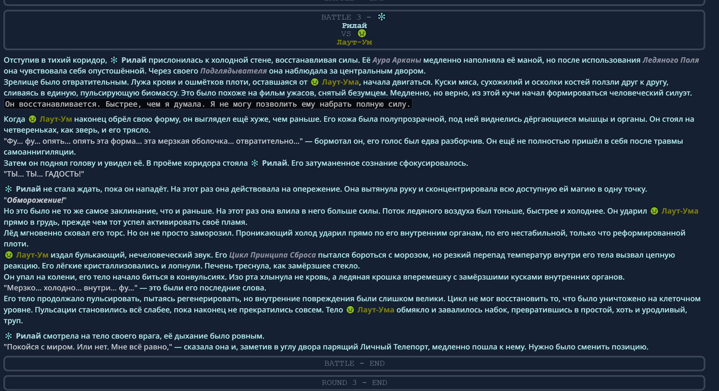 >>841604 Самое смешное было на какой-то совсем старой версии промта, где я забыл врубить галочку боя и персонажи в раунде внезапно стали чаще использовать навыки и вообще вести себя адекватнее xD. Но это было ещё в марте что ли.