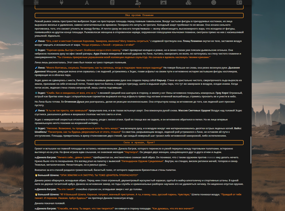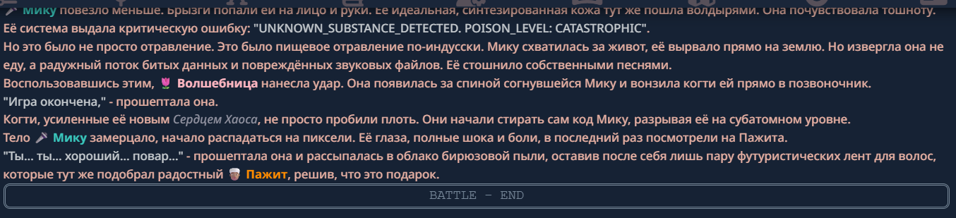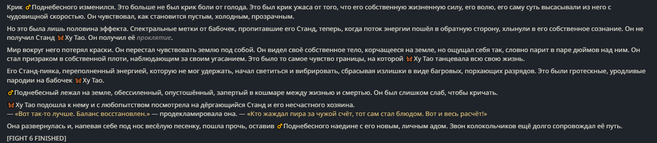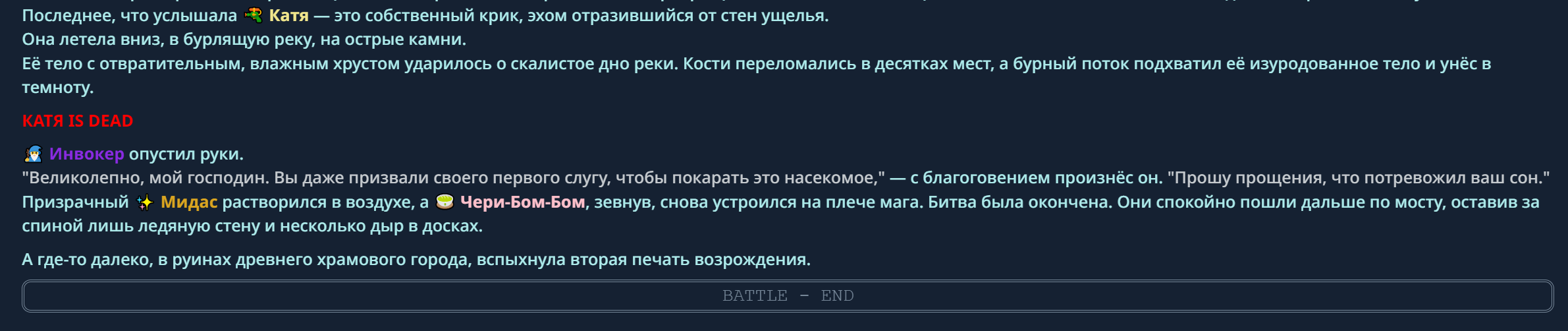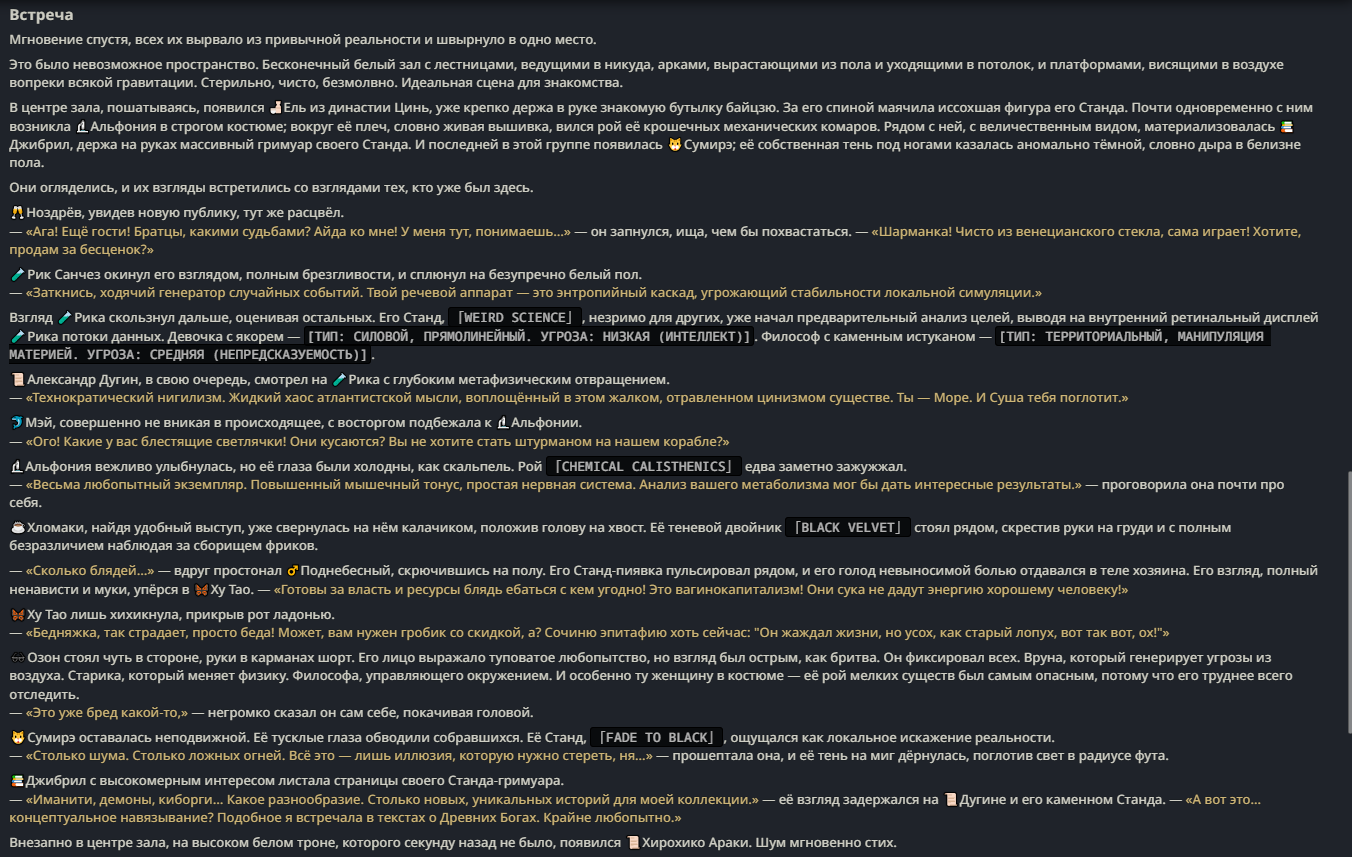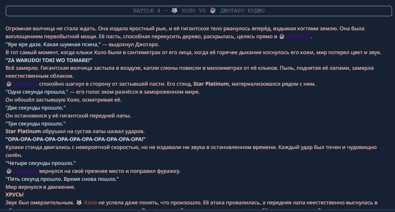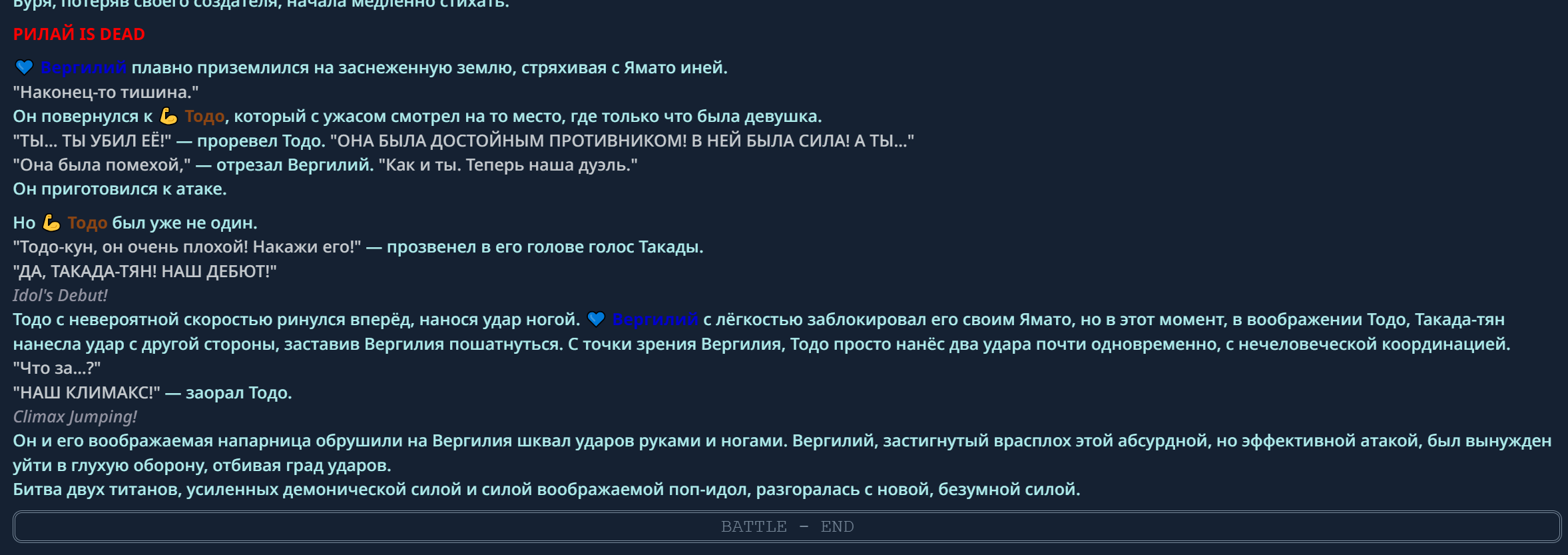 >>841604 Самое смешное было на какой-то совсем старой версии промта, где я забыл врубить галочку боя и персонажи в раунде внезапно стали чаще использовать навыки и вообще вести себя адекватнее xD. Но это было ещё в марте что ли.
