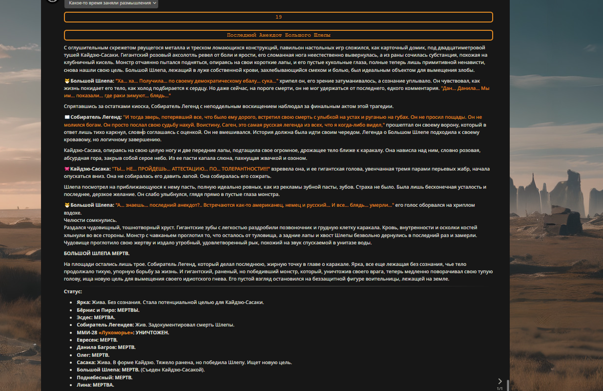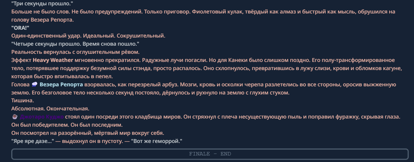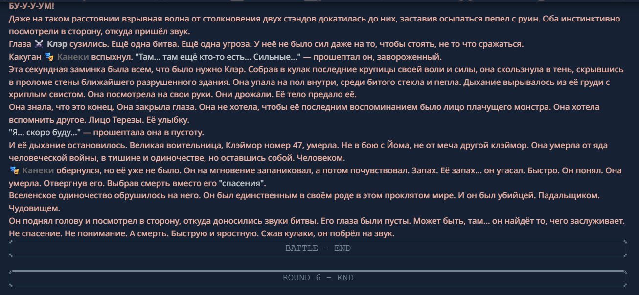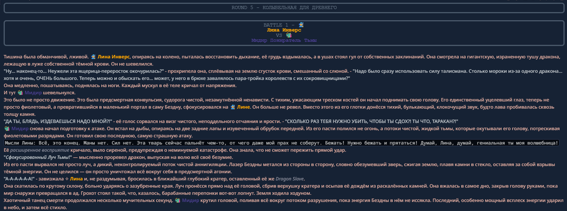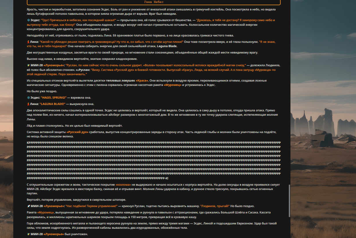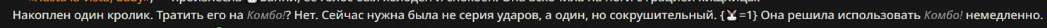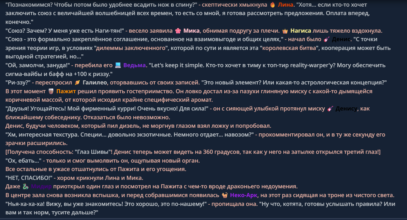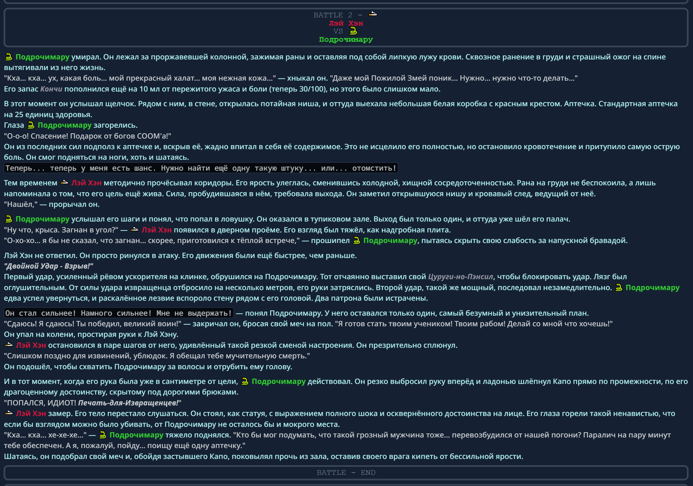 >>841604 Самое смешное было на какой-то совсем старой версии промта, где я забыл врубить галочку боя и персонажи в раунде внезапно стали чаще использовать навыки и вообще вести себя адекватнее xD. Но это было ещё в марте что ли.