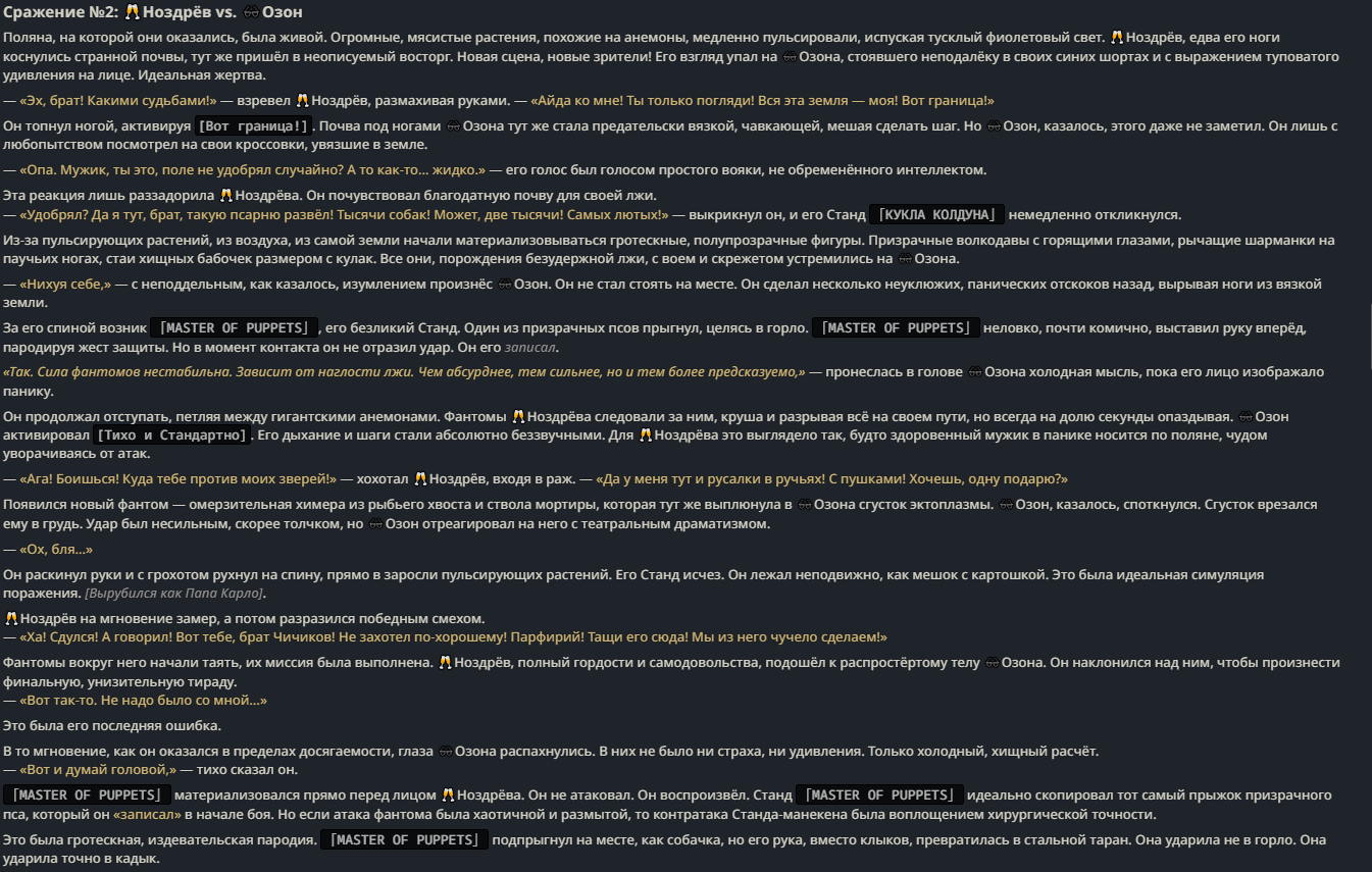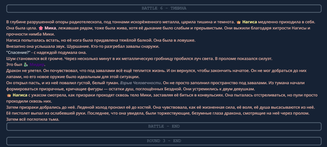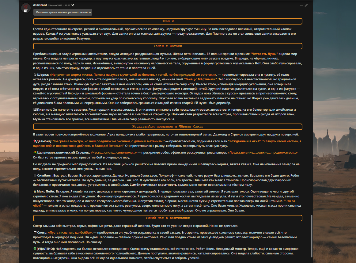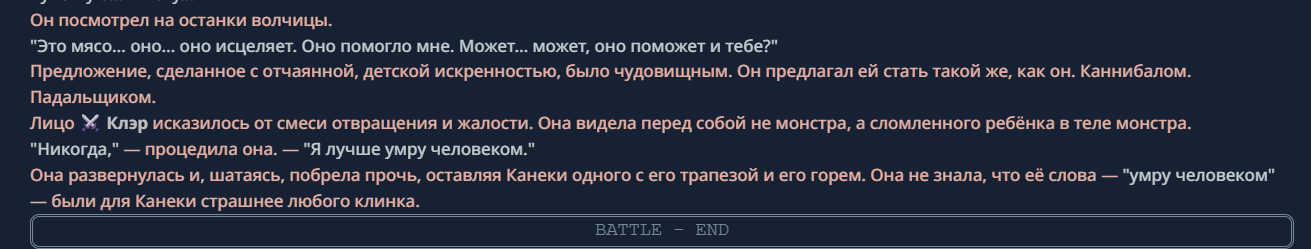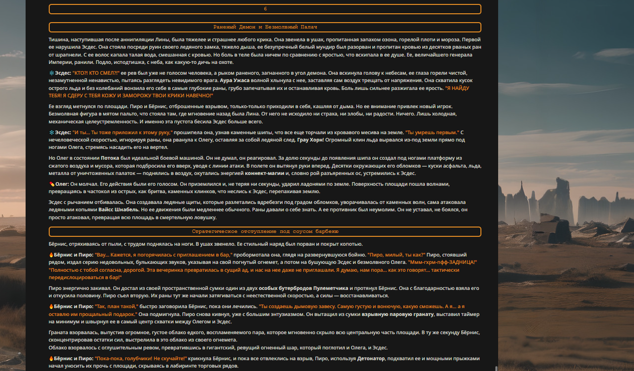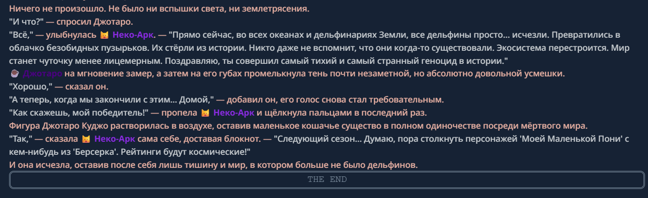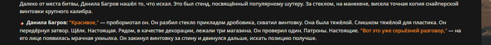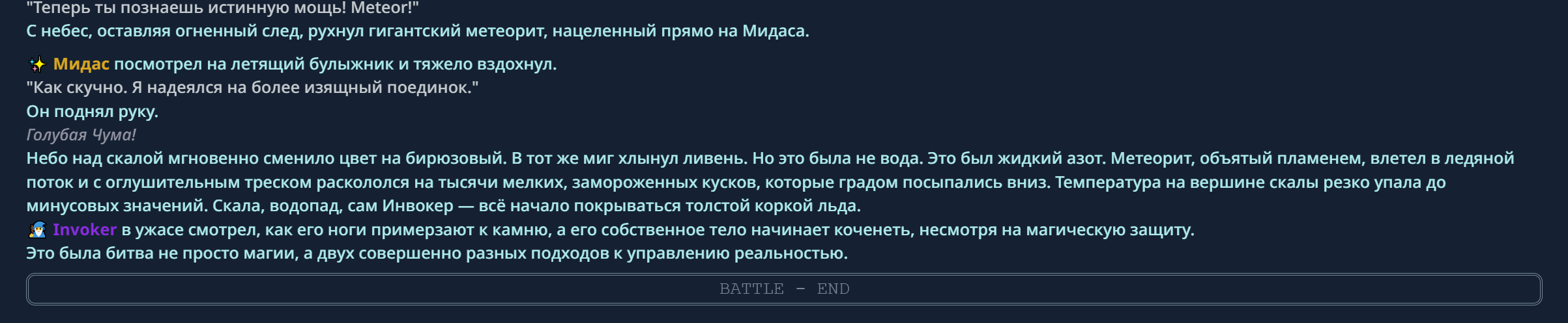 >>841604 Самое смешное было на какой-то совсем старой версии промта, где я забыл врубить галочку боя и персонажи в раунде внезапно стали чаще использовать навыки и вообще вести себя адекватнее xD. Но это было ещё в марте что ли.