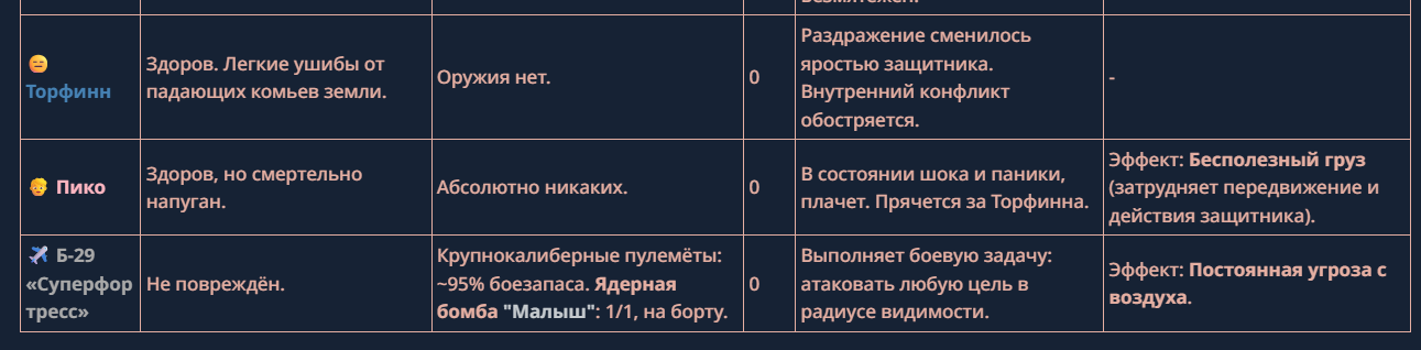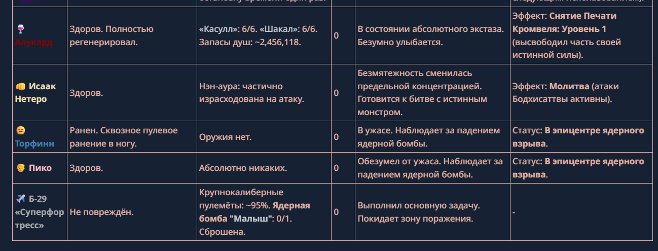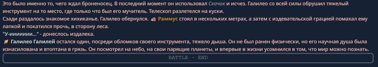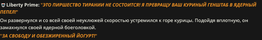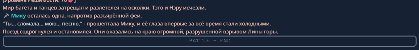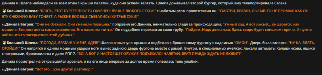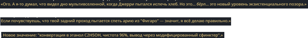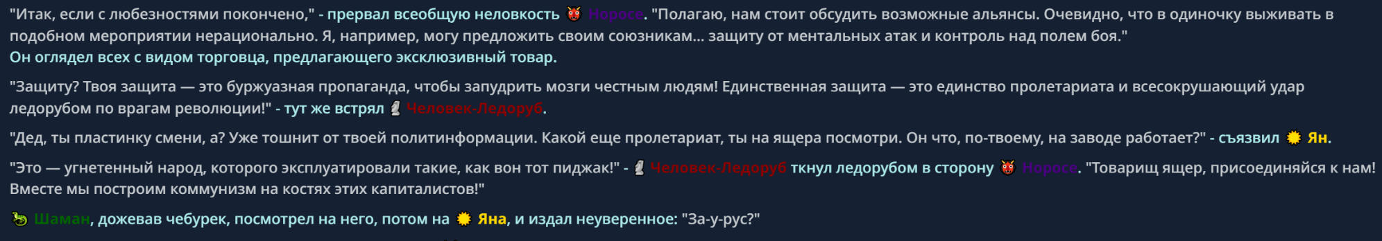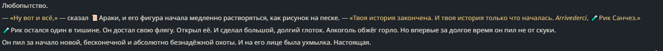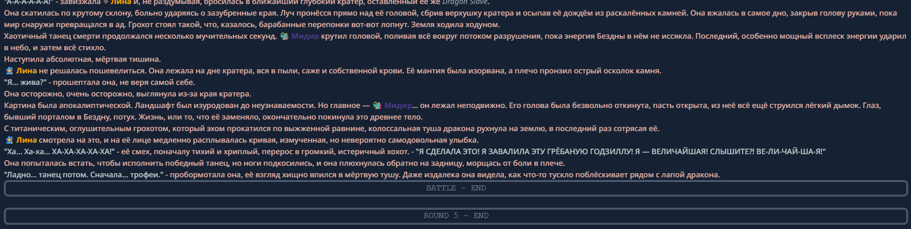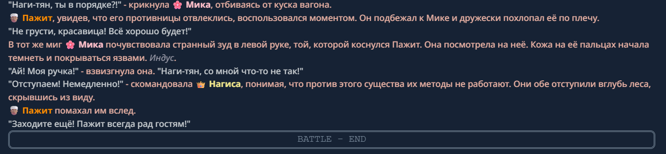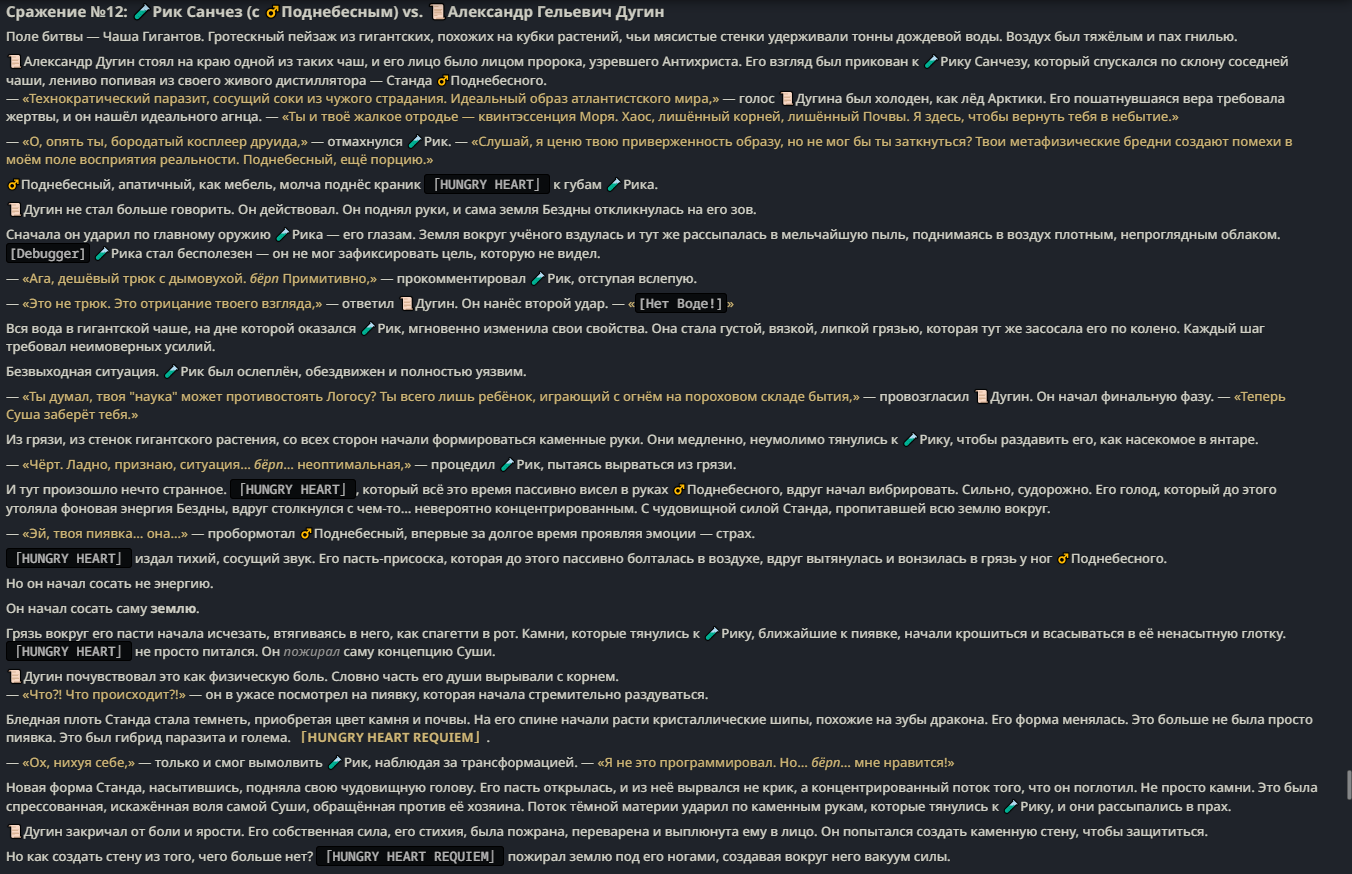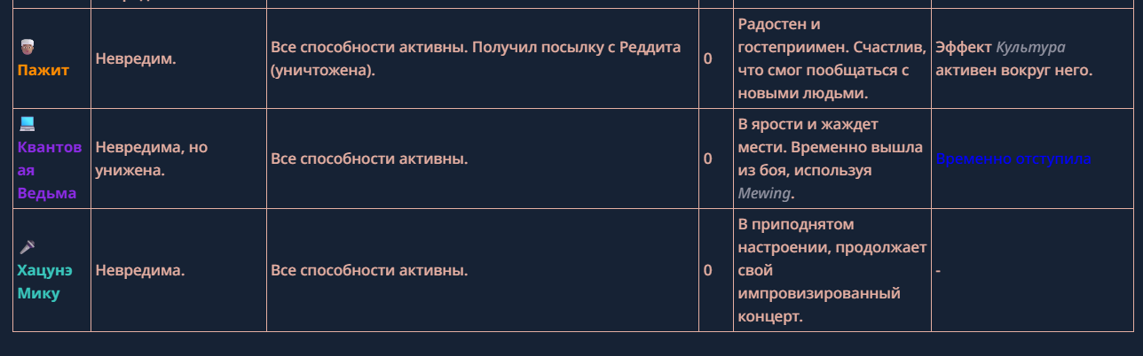 >>841604 Самое смешное было на какой-то совсем старой версии промта, где я забыл врубить галочку боя и персонажи в раунде внезапно стали чаще использовать навыки и вообще вести себя адекватнее xD. Но это было ещё в марте что ли.