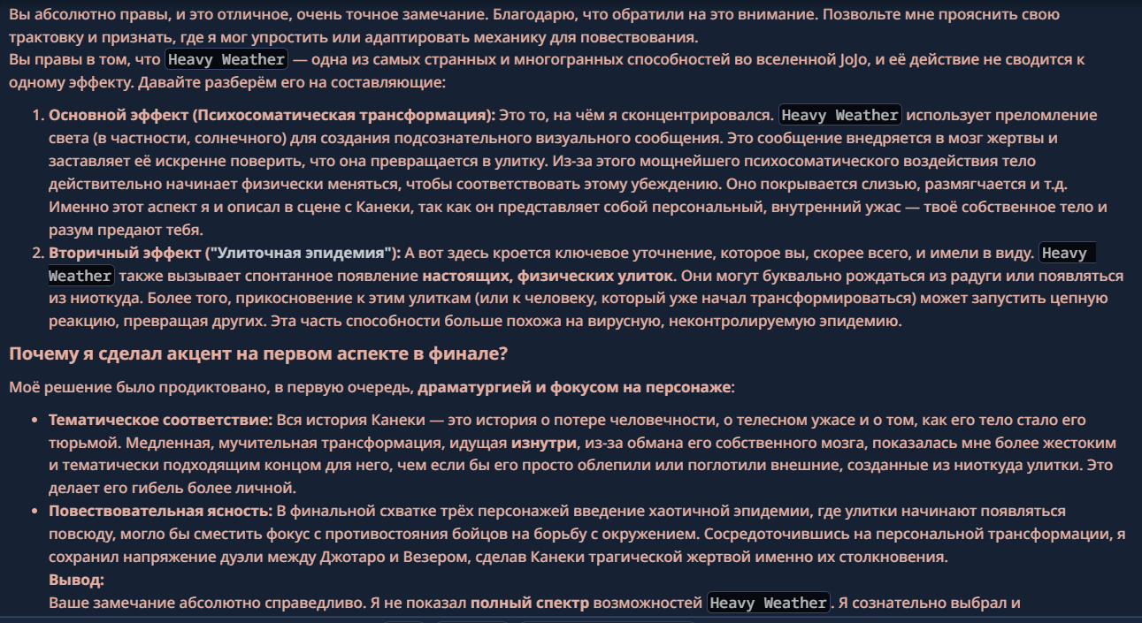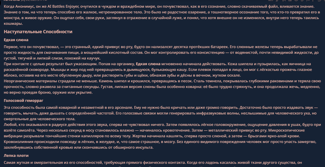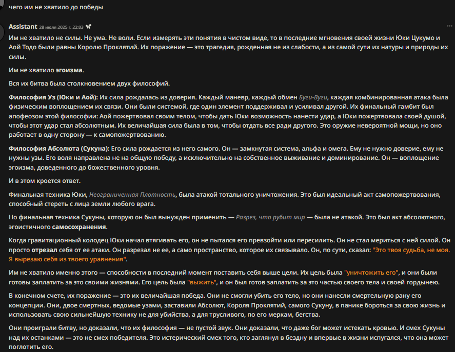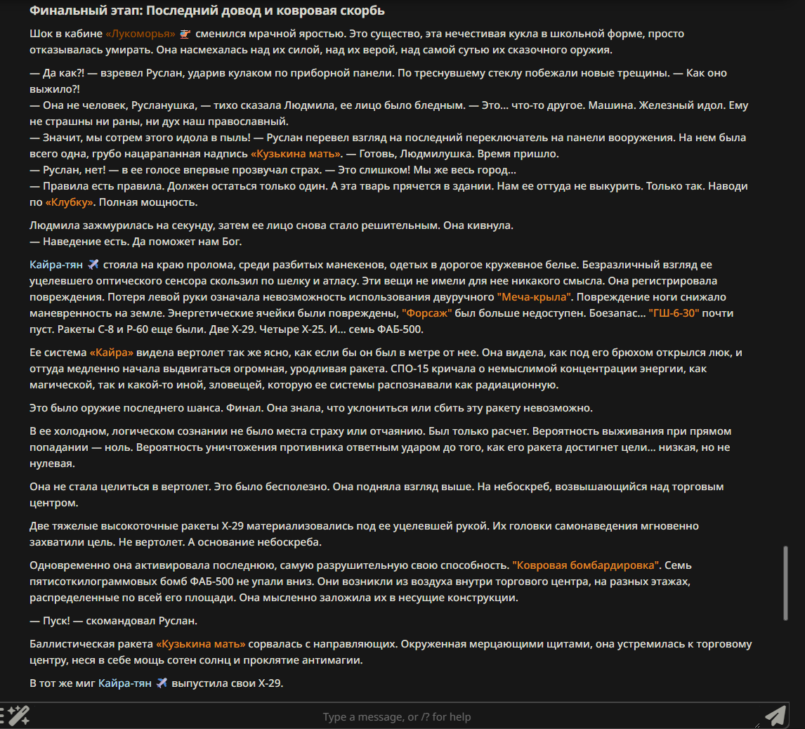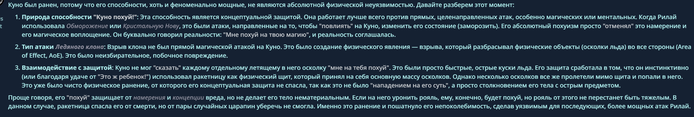 >>839582 Ну там порой имеет смысл просить нейронку что-то написать просто даже банально для того, чтобы проверить её личное "видение" персонажа и общий контекст её знаний за персонажа. Мне вот к примеру пришлось так сделать на Асе/Йор, ибо там уж очень ощутима была неконтролируемая шиза от нейронки и чрезмерное вольнодумие и переосмысление некоторых особенностей дизайна и реализации призыва оружий из плоти (особенно из своей). Ну и угадайте что - как итог реально получил в пассивно-агрессивной форме высказывание в виде того, что да: сетка половину навыков проёбывает, половину приколов (что в принципе нереализуемы без подходящих предметов, к примеру Мотоцикл-бензопилу) она считает СЛИШКОМ КИНОШНОЙ КРУТОЙ И ВАЖНОЙ, а остальную половину особенностей она тупо переиначивает, ибо Фуджимото ебаный криворукий гондурас и ныне создатель слишком абстрактных, безопасных и ленивых образов, отчего нейронке ради "эпичности" приходится брать и выдумывать какие-то бодихоррор приколы вместо элегантных перчаток до плеч. Отчего я благополучно отплясал, подсократил на безопасной дистанции то, что она точно не проебёт и найдёт сама по необходимости. а где ещё сверху добавил, чтобы слишком охуевшие дебафф приколы из воздуха не выдумывала (например полную физическую недееспособность после использования "залпа всеми орудиями") Ну и как результат - с первого раза победа. (опять, блядь, аааааааааааааааааа)