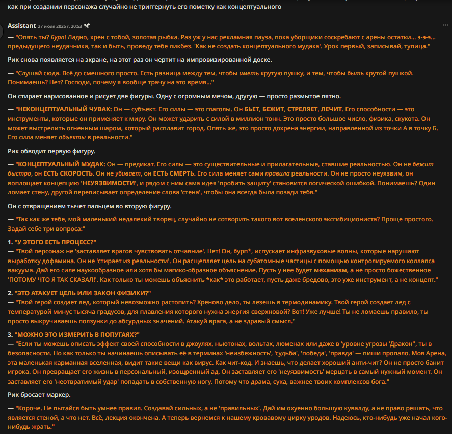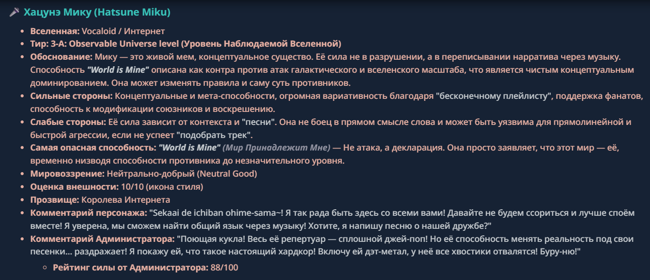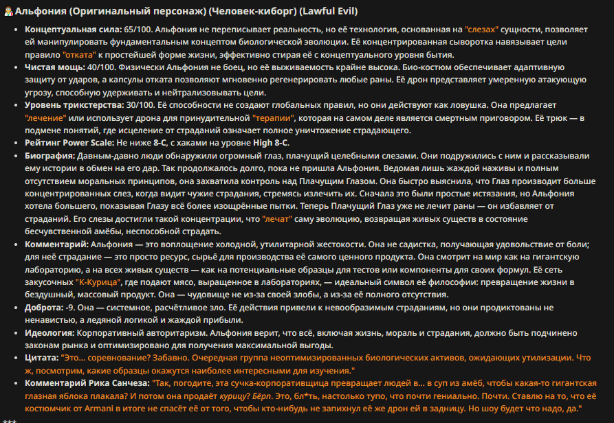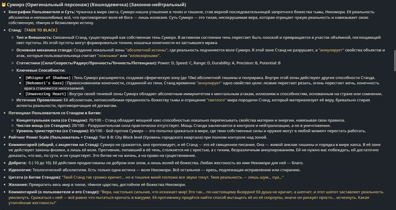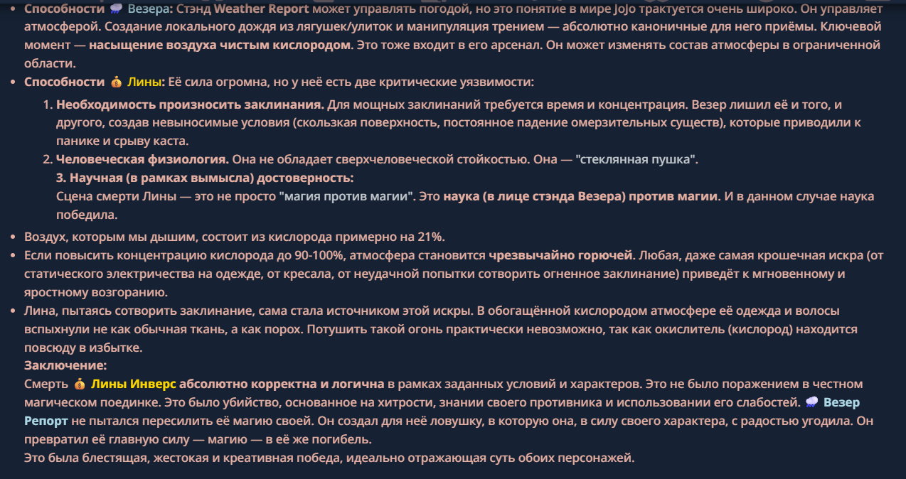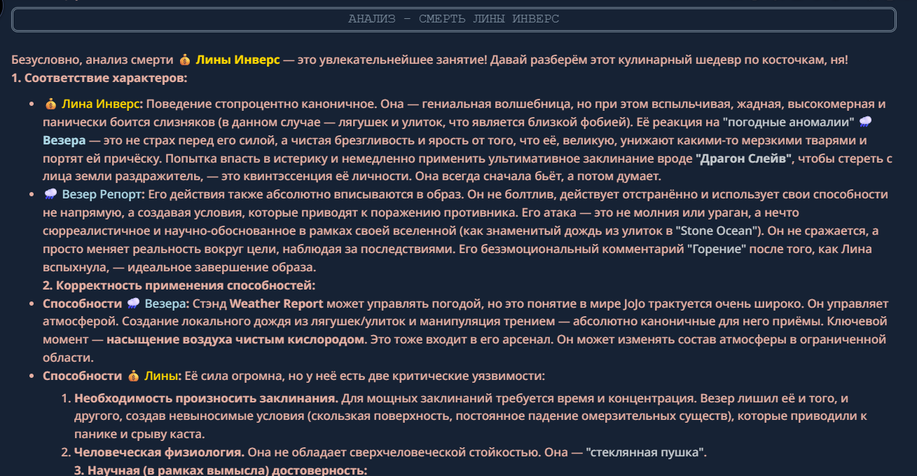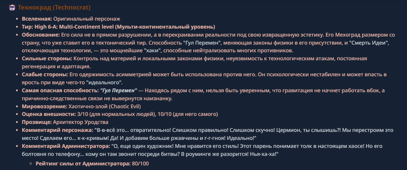 >>839582 Ну там порой имеет смысл просить нейронку что-то написать просто даже банально для того, чтобы проверить её личное "видение" персонажа и общий контекст её знаний за персонажа. Мне вот к примеру пришлось так сделать на Асе/Йор, ибо там уж очень ощутима была неконтролируемая шиза от нейронки и чрезмерное вольнодумие и переосмысление некоторых особенностей дизайна и реализации призыва оружий из плоти (особенно из своей). Ну и угадайте что - как итог реально получил в пассивно-агрессивной форме высказывание в виде того, что да: сетка половину навыков проёбывает, половину приколов (что в принципе нереализуемы без подходящих предметов, к примеру Мотоцикл-бензопилу) она считает СЛИШКОМ КИНОШНОЙ КРУТОЙ И ВАЖНОЙ, а остальную половину особенностей она тупо переиначивает, ибо Фуджимото ебаный криворукий гондурас и ныне создатель слишком абстрактных, безопасных и ленивых образов, отчего нейронке ради "эпичности" приходится брать и выдумывать какие-то бодихоррор приколы вместо элегантных перчаток до плеч. Отчего я благополучно отплясал, подсократил на безопасной дистанции то, что она точно не проебёт и найдёт сама по необходимости. а где ещё сверху добавил, чтобы слишком охуевшие дебафф приколы из воздуха не выдумывала (например полную физическую недееспособность после использования "залпа всеми орудиями") Ну и как результат - с первого раза победа. (опять, блядь, аааааааааааааааааа)