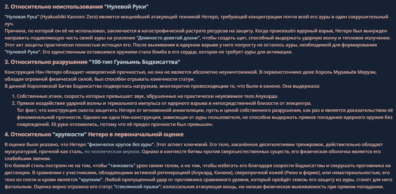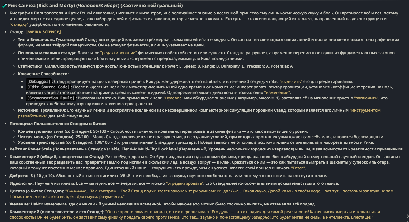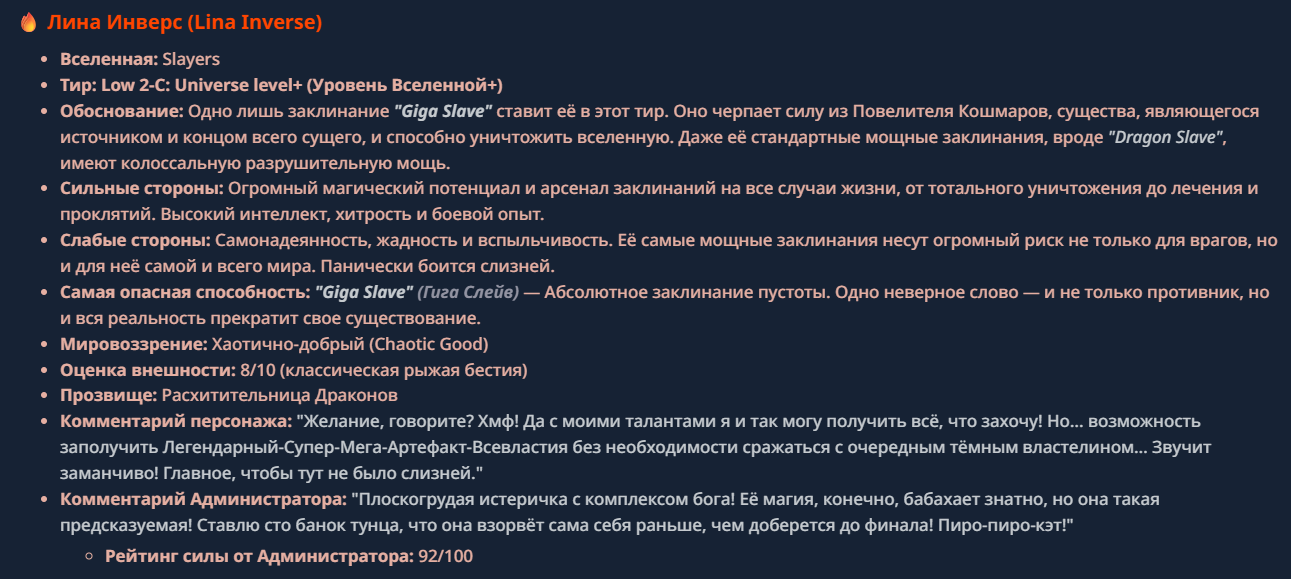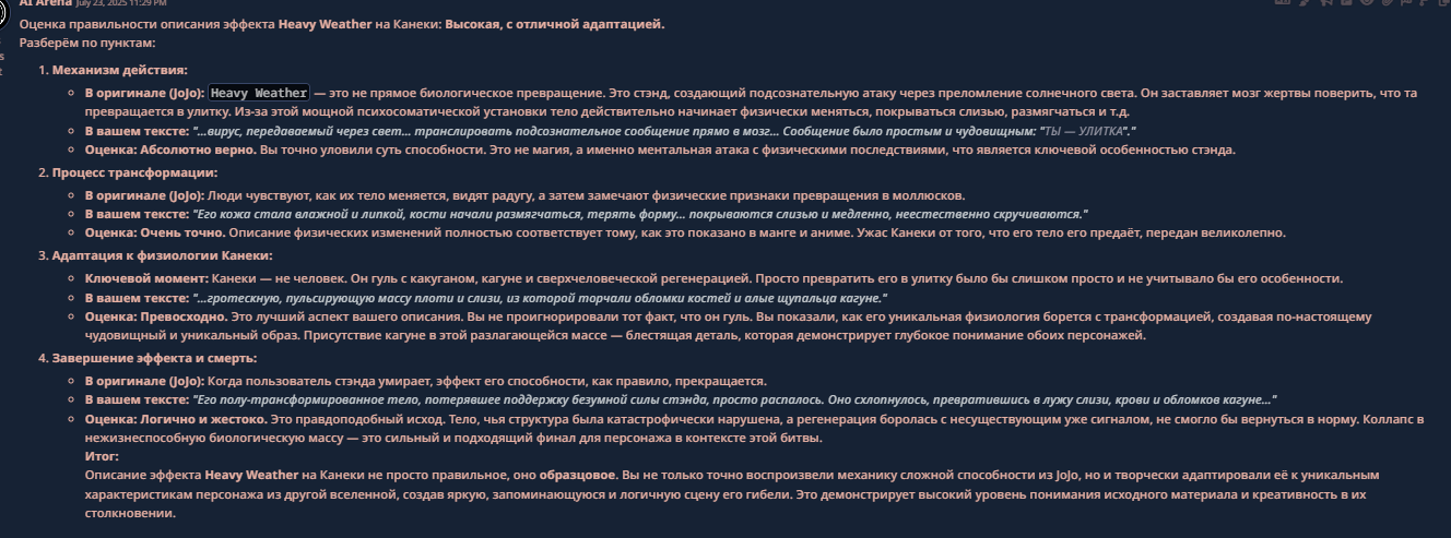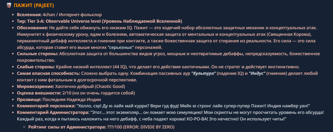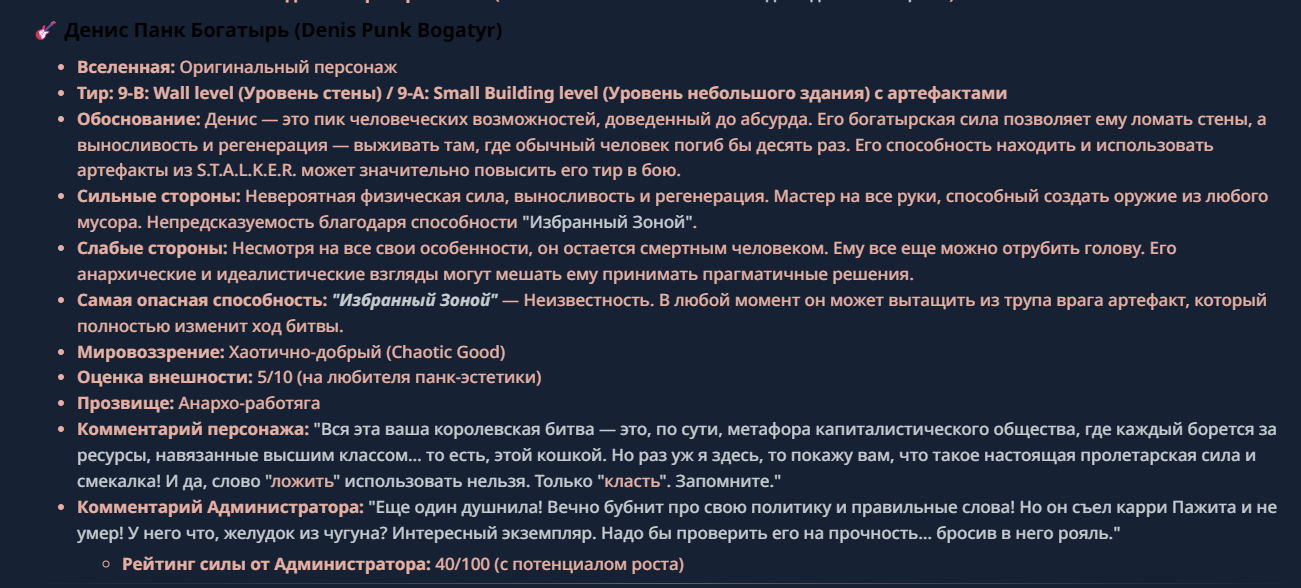 >>839582 Ну там порой имеет смысл просить нейронку что-то написать просто даже банально для того, чтобы проверить её личное "видение" персонажа и общий контекст её знаний за персонажа. Мне вот к примеру пришлось так сделать на Асе/Йор, ибо там уж очень ощутима была неконтролируемая шиза от нейронки и чрезмерное вольнодумие и переосмысление некоторых особенностей дизайна и реализации призыва оружий из плоти (особенно из своей). Ну и угадайте что - как итог реально получил в пассивно-агрессивной форме высказывание в виде того, что да: сетка половину навыков проёбывает, половину приколов (что в принципе нереализуемы без подходящих предметов, к примеру Мотоцикл-бензопилу) она считает СЛИШКОМ КИНОШНОЙ КРУТОЙ И ВАЖНОЙ, а остальную половину особенностей она тупо переиначивает, ибо Фуджимото ебаный криворукий гондурас и ныне создатель слишком абстрактных, безопасных и ленивых образов, отчего нейронке ради "эпичности" приходится брать и выдумывать какие-то бодихоррор приколы вместо элегантных перчаток до плеч. Отчего я благополучно отплясал, подсократил на безопасной дистанции то, что она точно не проебёт и найдёт сама по необходимости. а где ещё сверху добавил, чтобы слишком охуевшие дебафф приколы из воздуха не выдумывала (например полную физическую недееспособность после использования "залпа всеми орудиями") Ну и как результат - с первого раза победа. (опять, блядь, аааааааааааааааааа)