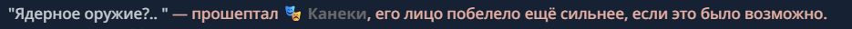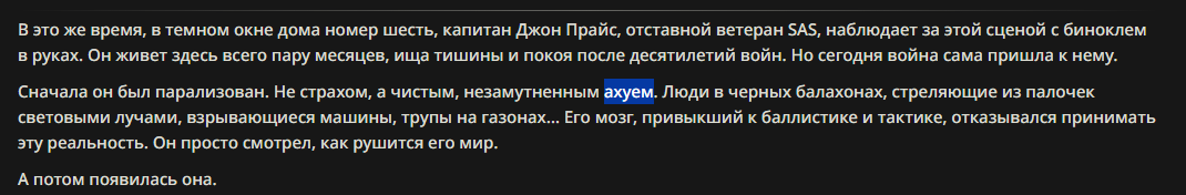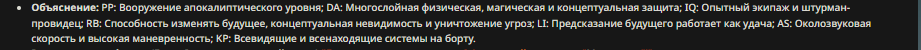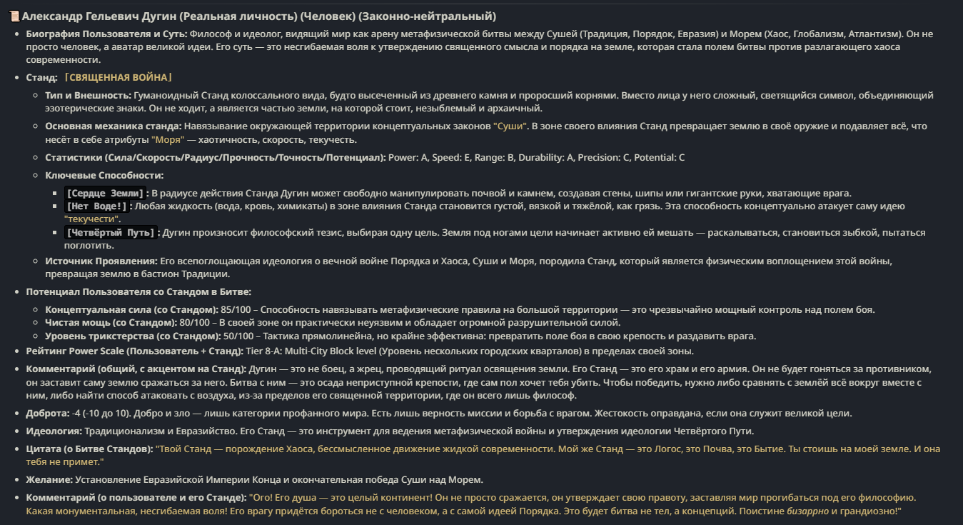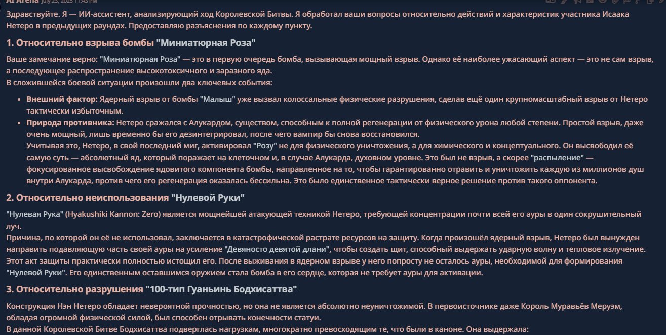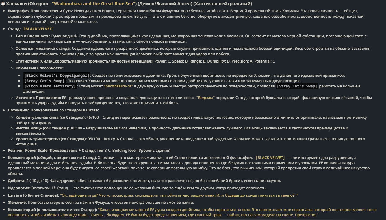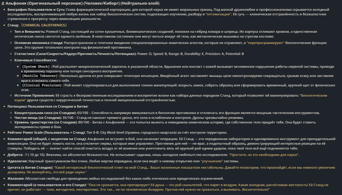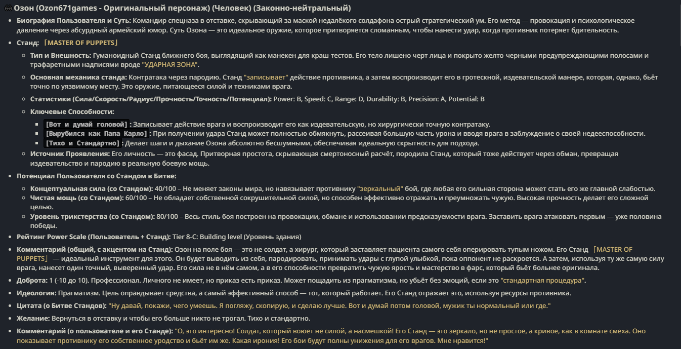 >>839582 Ну там порой имеет смысл просить нейронку что-то написать просто даже банально для того, чтобы проверить её личное "видение" персонажа и общий контекст её знаний за персонажа. Мне вот к примеру пришлось так сделать на Асе/Йор, ибо там уж очень ощутима была неконтролируемая шиза от нейронки и чрезмерное вольнодумие и переосмысление некоторых особенностей дизайна и реализации призыва оружий из плоти (особенно из своей). Ну и угадайте что - как итог реально получил в пассивно-агрессивной форме высказывание в виде того, что да: сетка половину навыков проёбывает, половину приколов (что в принципе нереализуемы без подходящих предметов, к примеру Мотоцикл-бензопилу) она считает СЛИШКОМ КИНОШНОЙ КРУТОЙ И ВАЖНОЙ, а остальную половину особенностей она тупо переиначивает, ибо Фуджимото ебаный криворукий гондурас и ныне создатель слишком абстрактных, безопасных и ленивых образов, отчего нейронке ради "эпичности" приходится брать и выдумывать какие-то бодихоррор приколы вместо элегантных перчаток до плеч. Отчего я благополучно отплясал, подсократил на безопасной дистанции то, что она точно не проебёт и найдёт сама по необходимости. а где ещё сверху добавил, чтобы слишком охуевшие дебафф приколы из воздуха не выдумывала (например полную физическую недееспособность после использования "залпа всеми орудиями") Ну и как результат - с первого раза победа. (опять, блядь, аааааааааааааааааа)