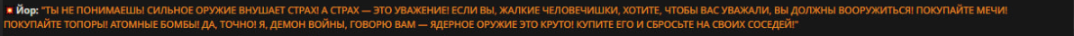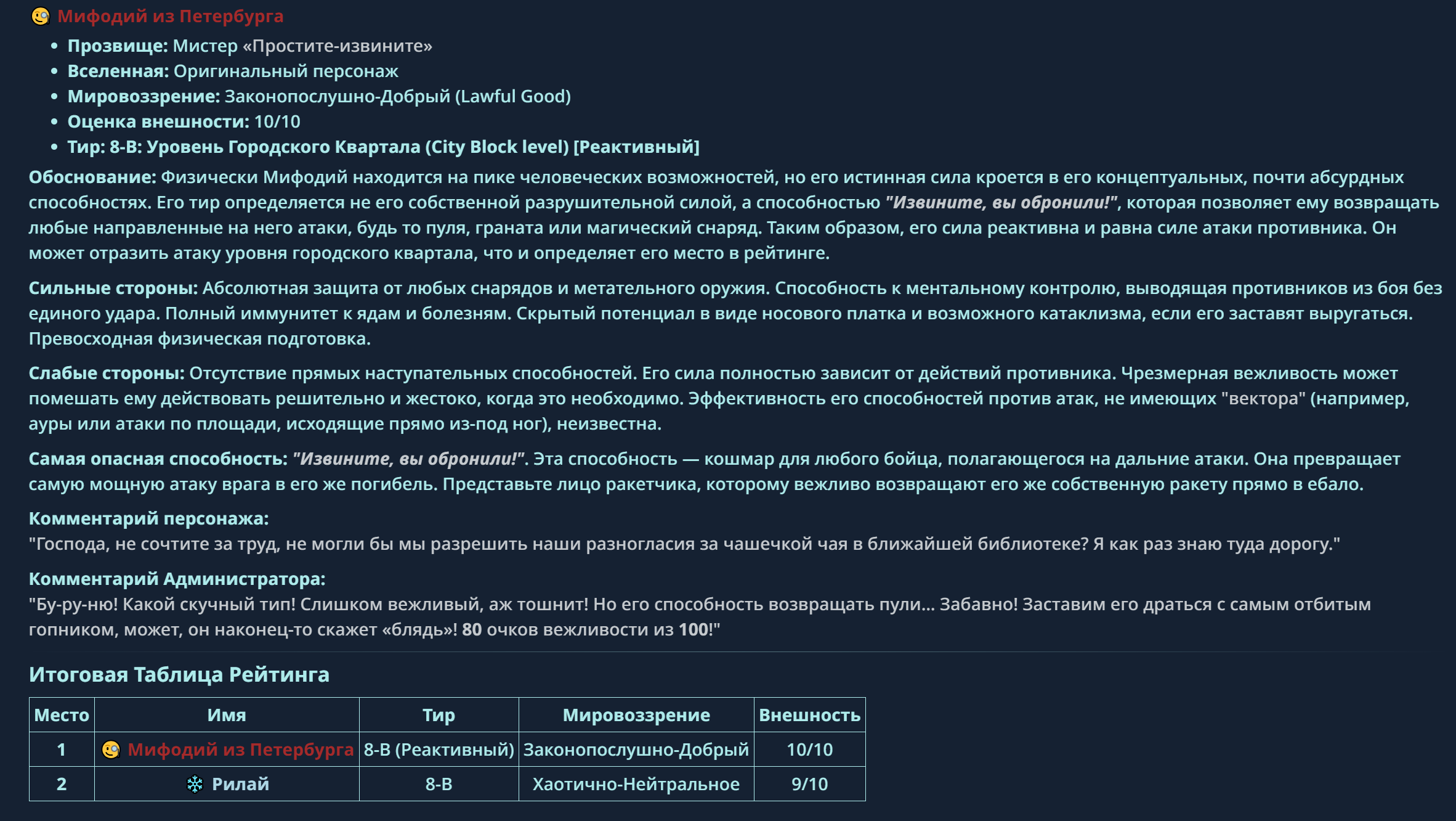Прогоните кто может. Желательно против разного типа чарров <character name="Мифодий из Петербурга"> Биография: Судьба Мифодия сложилась довольно необычным образом. Он родился в очень бедной деревне Конго, где царили голод, нищета и болезни. Мать мальчика не хотела для сына такой жизни, но старейшины деревни отказывались отпускать их, ведь ребёнок - это будущий работник банановой плантации, последнего, что хоть как-то держало населённый пункт на плаву. Тогда женщина пошла на отчайный шаг, под покровом ночи она пробралась к ящикам с бананами, готовыми к отправке в другие страны, и положила в один из них своего полугодовалого сына. На утро ящики забрали, и так начался путь мальчика в Россию, в город Санкт-Петербург. Спустя месяц, работники пятёрочки среднеазиатской наружности разгружали газель с новоприбывшими бананами, но стоило им только зайти в магазин, как проходящий мимо пенсионер прихватил один из ещё не унесенных ящиков. Придя домой, старик позвал свою жену "гляди, старая, целый ящик бананов урвал!". Но какого же было удивление пожилых людей, когда из открытого ящика их взору предстал чернокожий карапуз, лежащий в пустых банановых кожурках. Делать нечего, детей у деда с бабкой все равно не было, мальца оставили, назвали Мифодием. Рос Мифодий не по дням, а по часам, обгонял сверстников и по атлетизму и по сообразительности на несколько лет, старики не могли нарадоваться, но и не забывали прививать молодому человеку манеры, обязательные для уважающего себя жителя культурной столицы. В возрасте 22 лет Мифодий получил степень доктора наук в области компьютерных технологий, звание заслуженного мастера спорта по тяжёлой атлетике, самбо и бегу на средние дистанции, а также написал несколько оркестровых музыкальных композиций, после чего решил стать обычным работником той самой пятёрочки, с порога которой его по счастливой случайности выкрал дед 22 года назад (таким образом парень хотел возместить расходы за те бананы, которыми он питался во время пребывания в ящике). Описание: Высокий чернокожий парень, одет опрятно, на правом глазу монокль, с собой носит длинный чёрный зонт-трость, в кармане брюк у него лежат дедовские советские часы "молния" и носовой платок, который бабушка зачем-то строго настрого наказывала всегда носить с собой, мол заговорен он какой-то силой особой, что обязательно выручит внучка из любой беды (хотя Мифодий в это особо не верит, но из уважения к бабушке всегда берет с собой платок). Способности: "Извините, вы обронили!" - если кто-то что-то роняет или теряет, то Мифодий, как воспитанный человек, обязательно вернет потерянную вещь. Будь то брошенная граната или даже пуля. "Кажется, дождь начинается" - Мифодий раскрывает свой зонт-трость, чтобы защититься от дождя или осадков другого рода. "Проход в библиотеку" - Мифодий всегда знает точный маршрут до ближайшей библиотеки (даже если она находится в другом изменении), и он не поленится в малейших деталях описать его любому нуждающемуся. После озвучивание Мифодием этого маршрута, поиск библиотеки становится приоритетной задачей для всех услышавших, а сражаться с таким вежливым человеком как-то расхотеватся. "Закалка" - Мифодий никогда не болел и не получал пищевых оравлений, он верил, что это благодаря ежедневной зарядке и закалке холодной водой, но даже в младенческом возрасте 